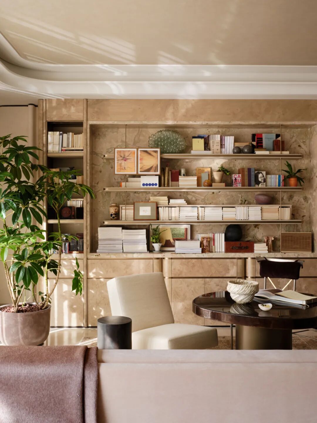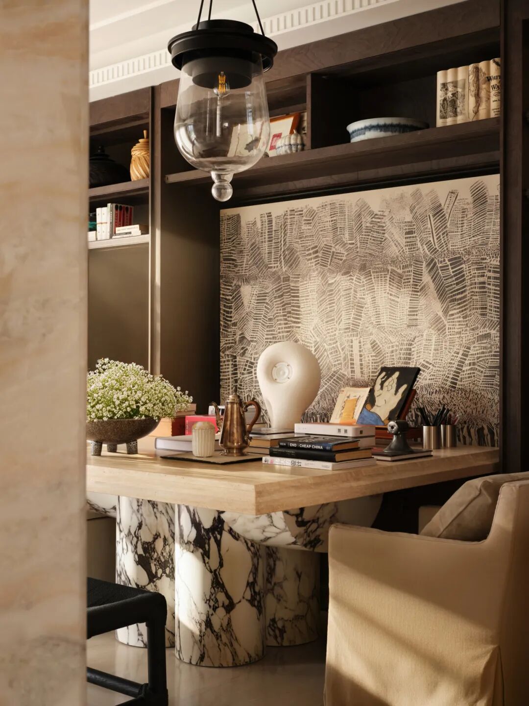 整面通顶书架兼具藏书收纳与艺术藏品展示功能,大理石书桌贴合轻办公、深度阅读需求,搭配中古风编织凳,让每一寸空间都成为承载生活本真与精神滋养的容器。