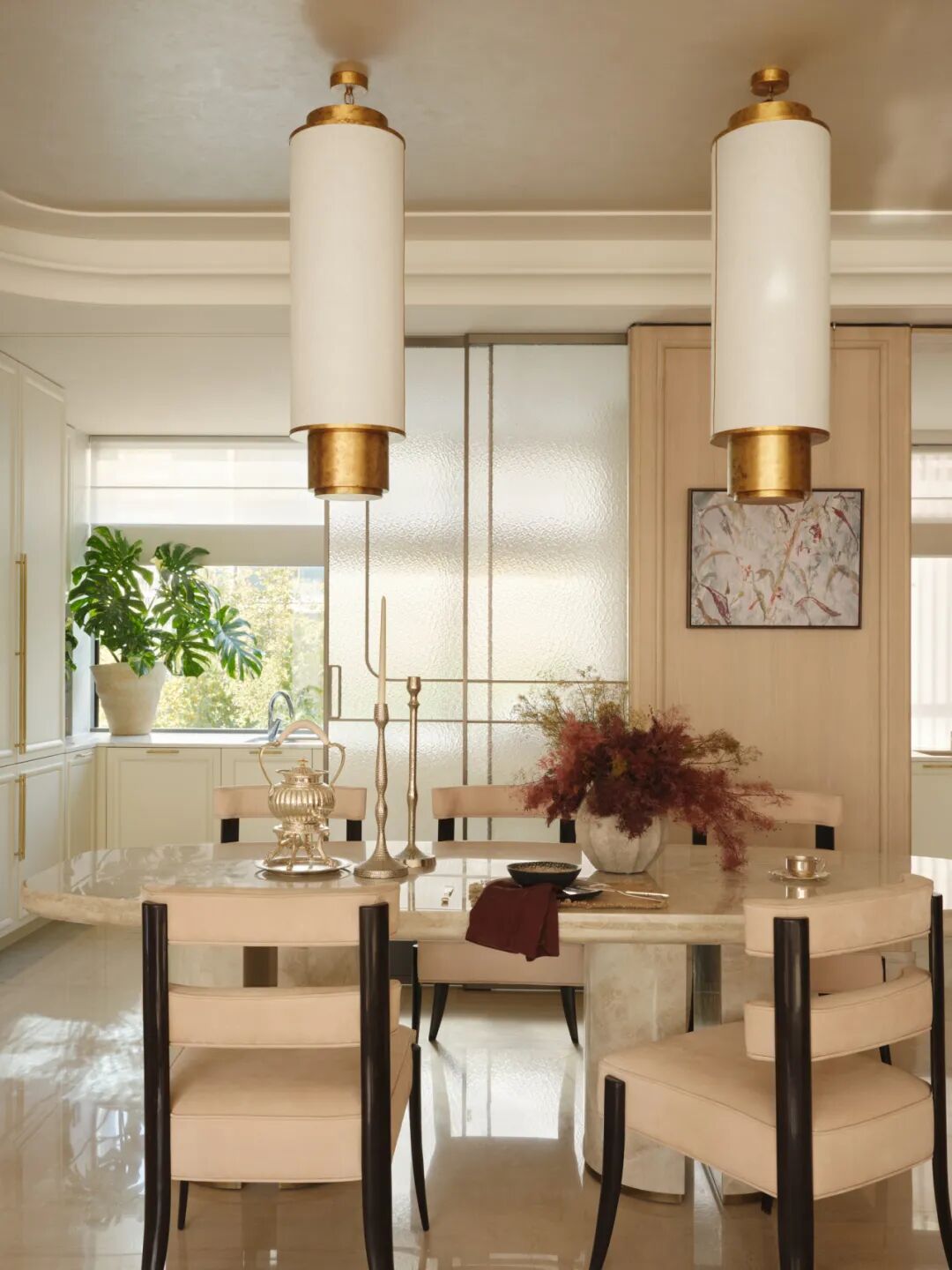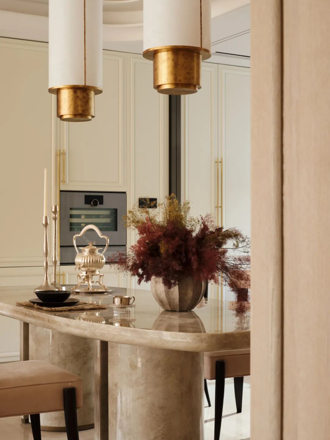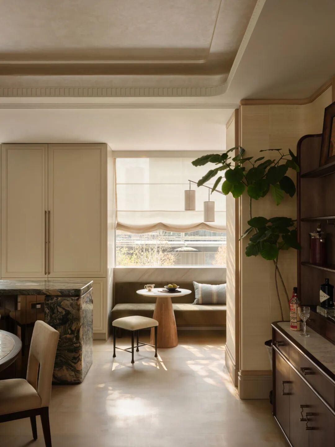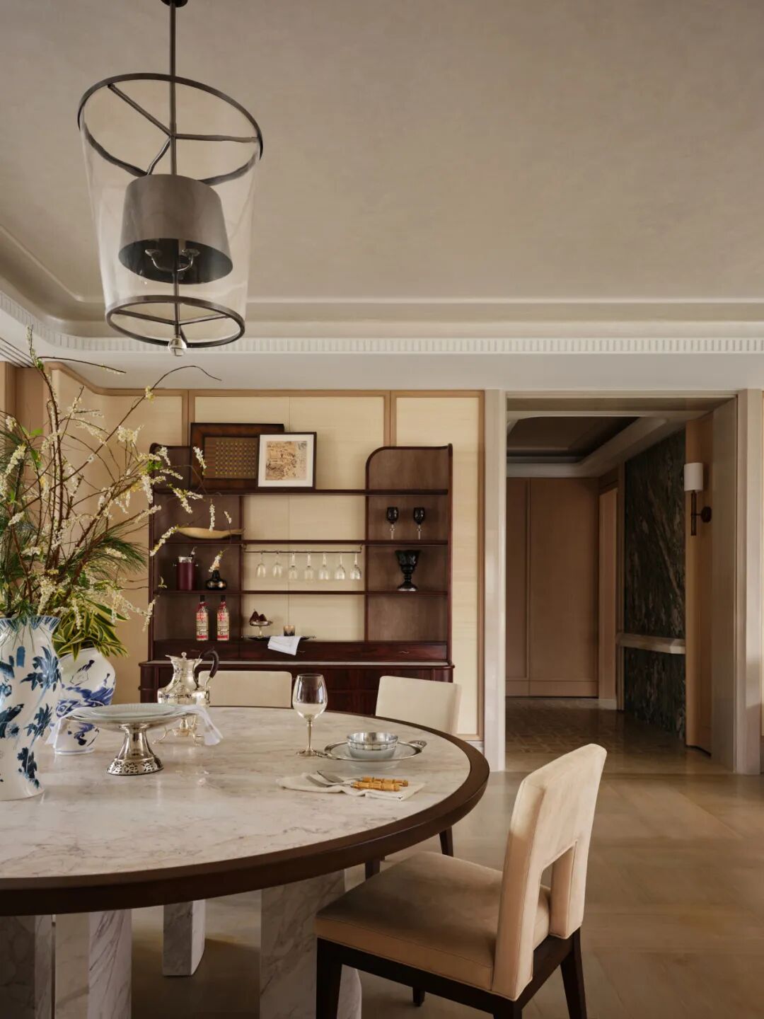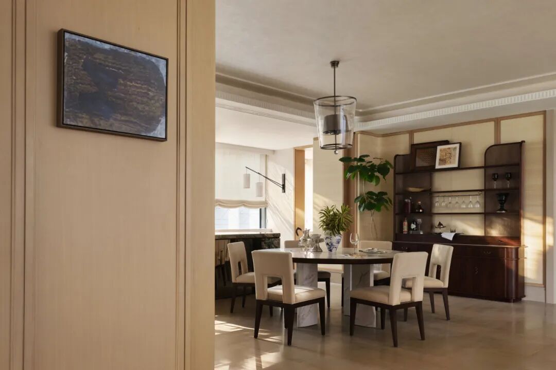 餐厨区的设计兼顾仪式感与日常性。餐桌选用镜湖春晓石材,一侧设置Mini吧与西厨系统,岛台以天然石材围合,使空间在实际使用中不断生成新的关系——它可以是早餐吧台、亲子烘焙区、朋友围坐的小酌场所。台面以日常的陈设器皿、鲜活的花艺组合,传递出松弛有度的生活状态。餐椅采用手工大漆工艺,触感温润且富有时间质感。