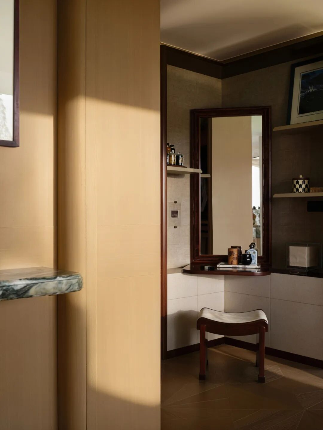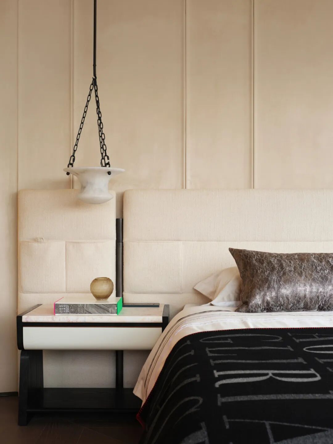 软装遵循折衷的思考,不局限于某一种风格,而是让每件物品与空间共生。除了进口品牌与新锐设计师作品,还融入部分中古款家具。材质的选择兼顾触觉优先性与自然关联性,木饰面的温润、石材的肌理、金属的细腻与织物的柔软相互交织,不张扬却始终温和承托着生活。
