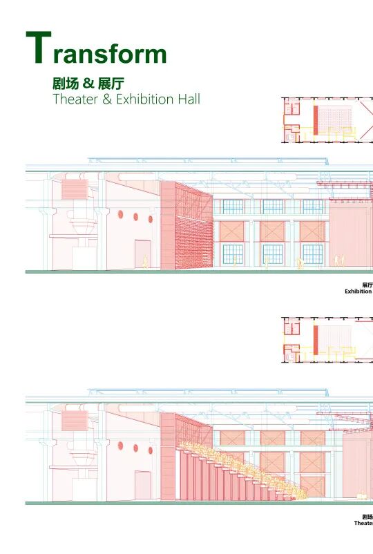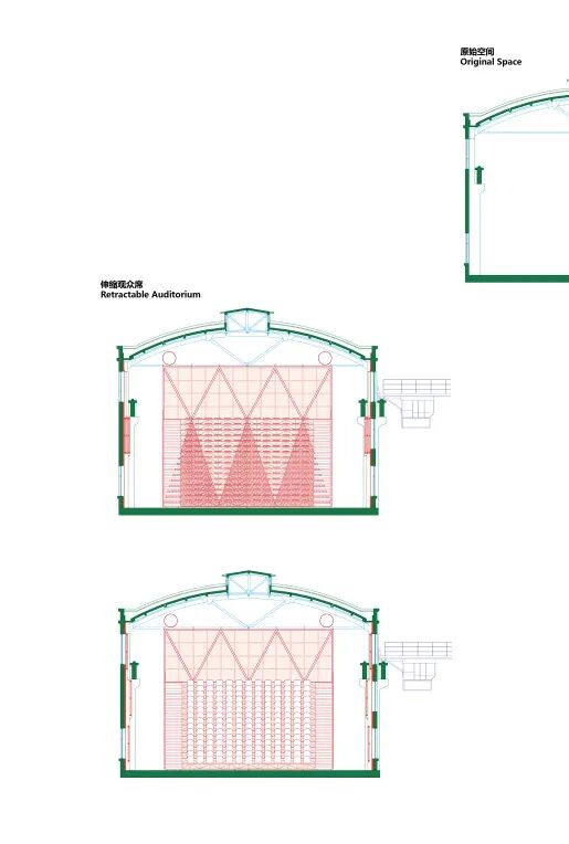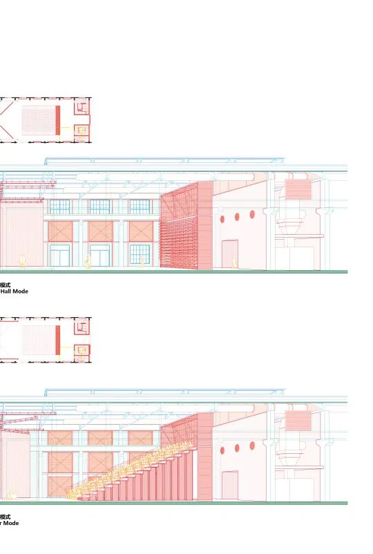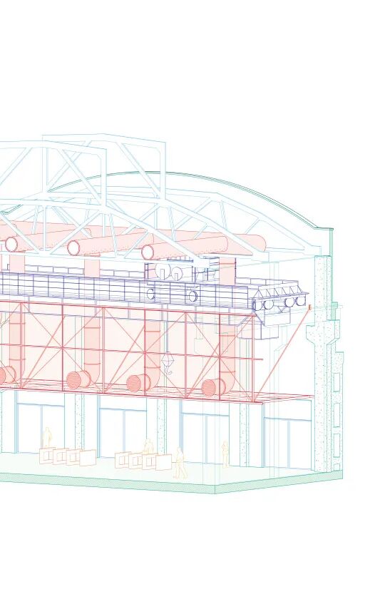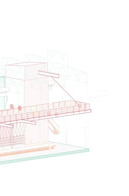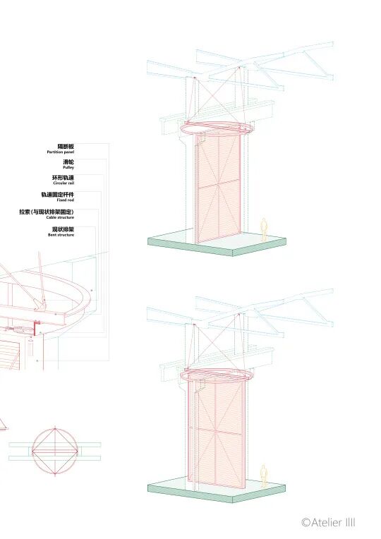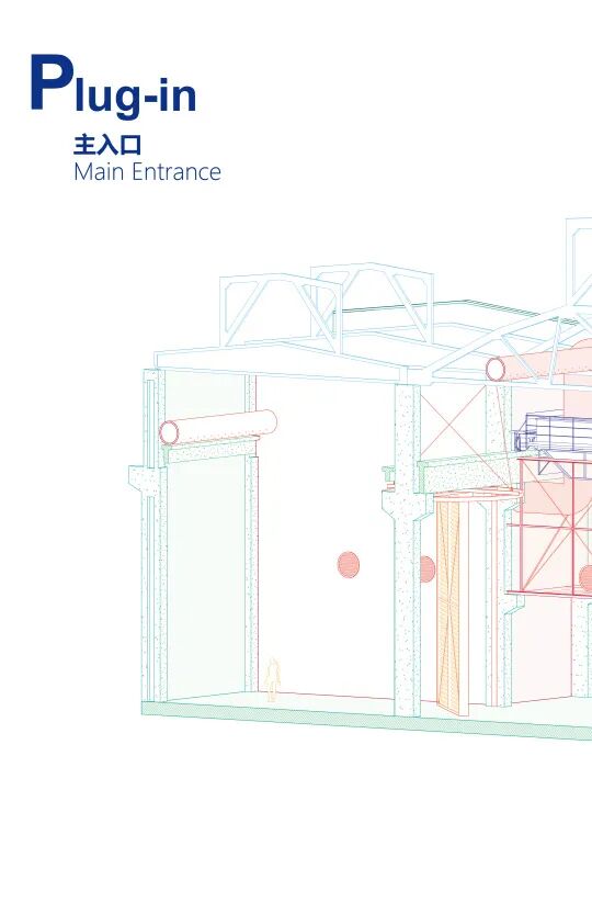 可操作的机械装置不仅成为解决问题的策略,还直接表达出设计理念。工厂的生产功能由内部的设备定义,作为建筑的厂房只是外壳和设备附着的框架,厂房默然矗立,机械运转轰鸣。栗若昕的方案延续了这一逻辑,通过放进新的机械,定义新的功能。工厂从物质生产变成文化艺术活动的发生场所。使用者根据自己的需求操作机械,改变空间形态,所有新增的机械和管线连同原始结构全部暴露在外,观众能够看到整个系统如何运作。如果工厂未来有新的使命,其内部的机械设备可以随时升级或者淘汰,厂房则最大限度地维持原状。这也是栗若昕的初衷:建筑的功能随着时代发展不断变换,其最初的场所精神始终存在。