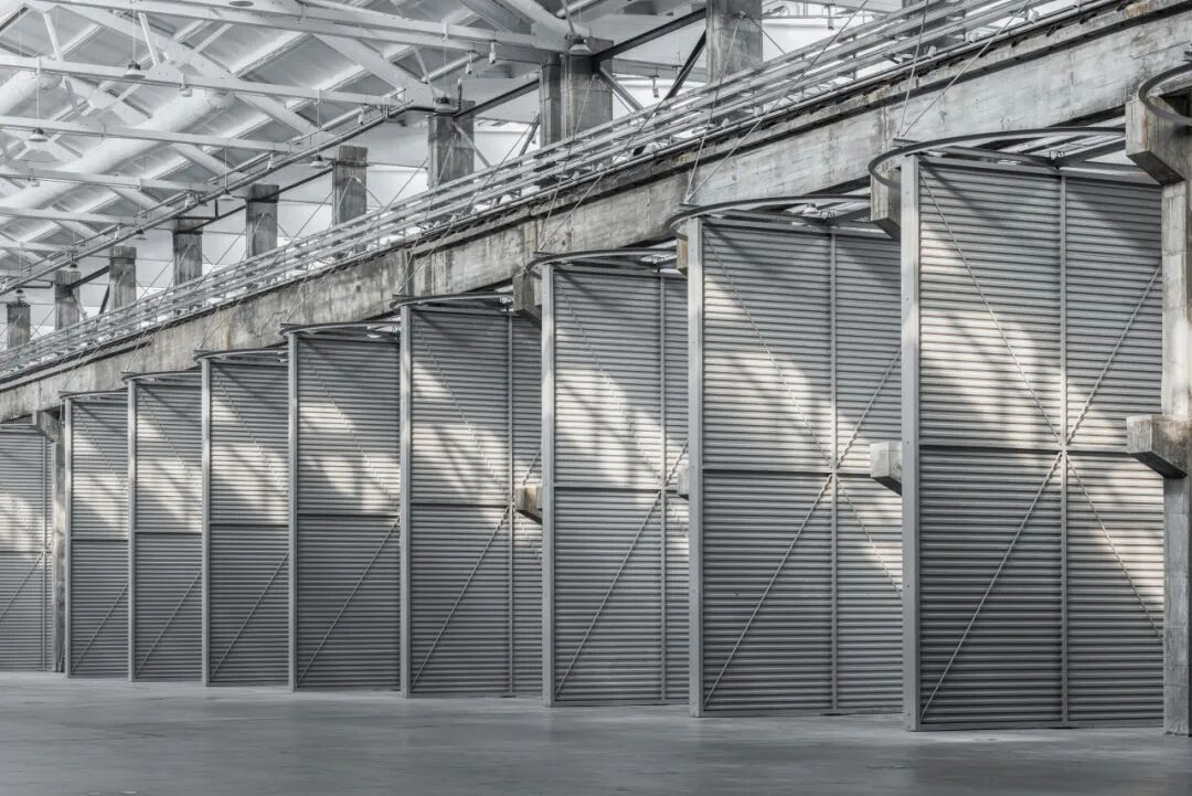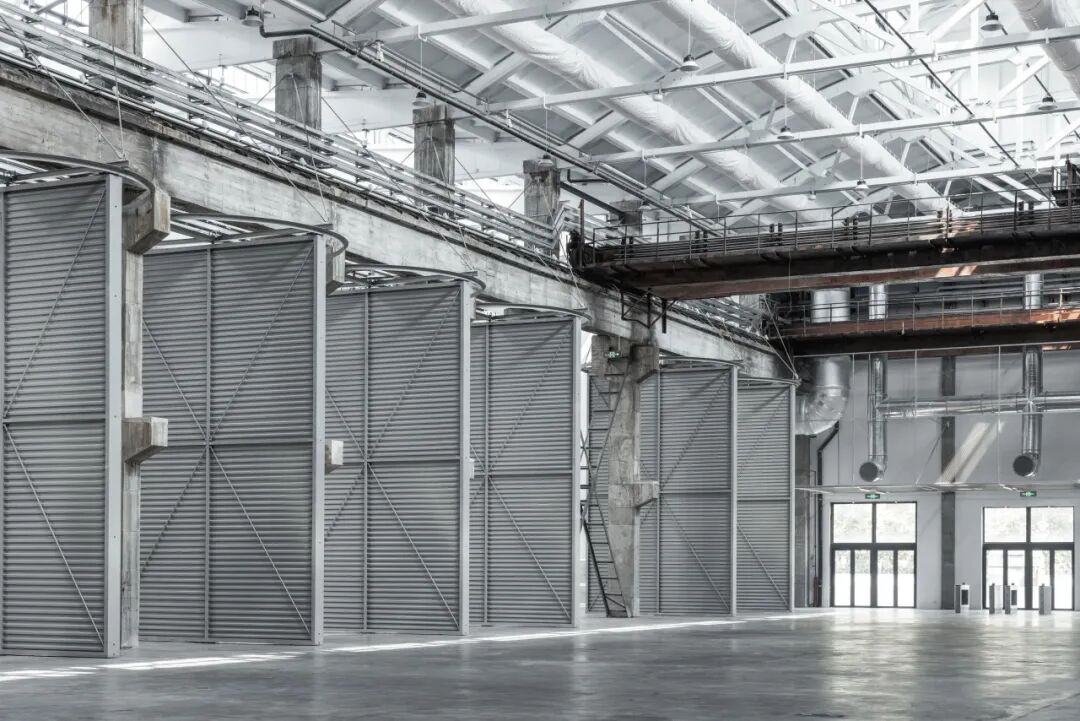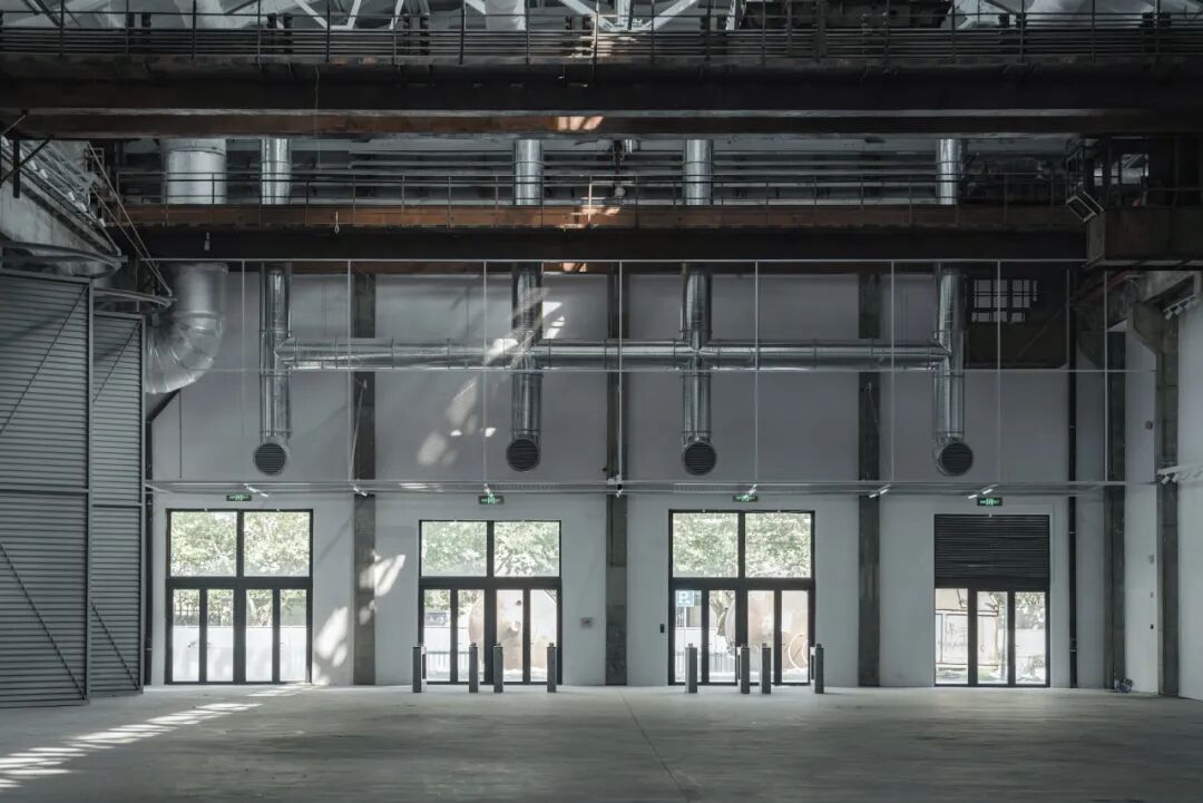2024年年底,项目竣工,杭氧旧址有了新名字——杭州武林之星博览中心。走进三号厂房,第一眼仍然会被建筑自身的气场震撼,巨大的尺度天然带有崇高的美学特征。近三层楼高的旋转门强化了原有的尺度感,人站在门前,会觉得自己很渺小。十四道门一字排开,声势浩大。老厂房的高阔粗粝与新机械系统的精细缜密,闪亮的新管线与锈蚀的老行车锚固各自的时代印迹。时隔65年,建筑师延续工业建筑的运行法则,在老厂房内装配全新的机械设备,满足建筑下一阶段的使用功能,为将来的再次改造留有充分的余地。建筑的生命不再因为功能的变化走向终点,可以不断进入新的周期。