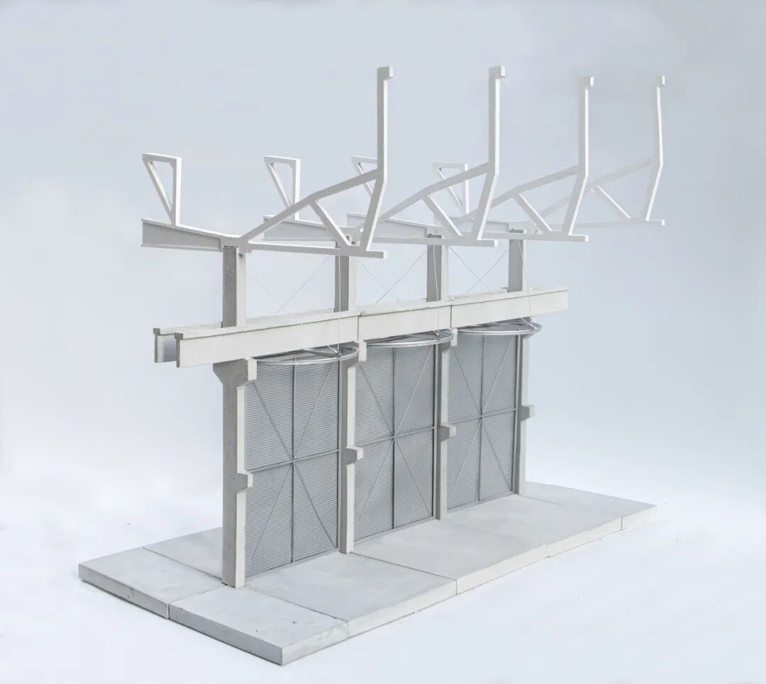 最难的是结构设计。杭氧旧址在2011年被列入杭州市第六批历史保护建筑,新增的部分必须与原有结构完全脱开,并且能够全部拆除。此外,结构方案需要通过厂房的原施工图单位——中国联合工程有限公司的复核,否则无法通过图审。难点就在这十几扇旋转门上,旋转门约五米宽、九米高,一扇至少两吨重,除了垂直的重力,还有侧向的倾覆力。为了保证稳定性,设计院最初的方案是现有排架柱内侧加上约三十公分宽的桁架柱,效果更像一个硕大的内门框。想要实现轻盈精致的效果,需要向原结构借一点力。但是中联合要求严格,连一颗螺栓都不允许打在原结构上。