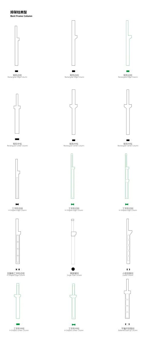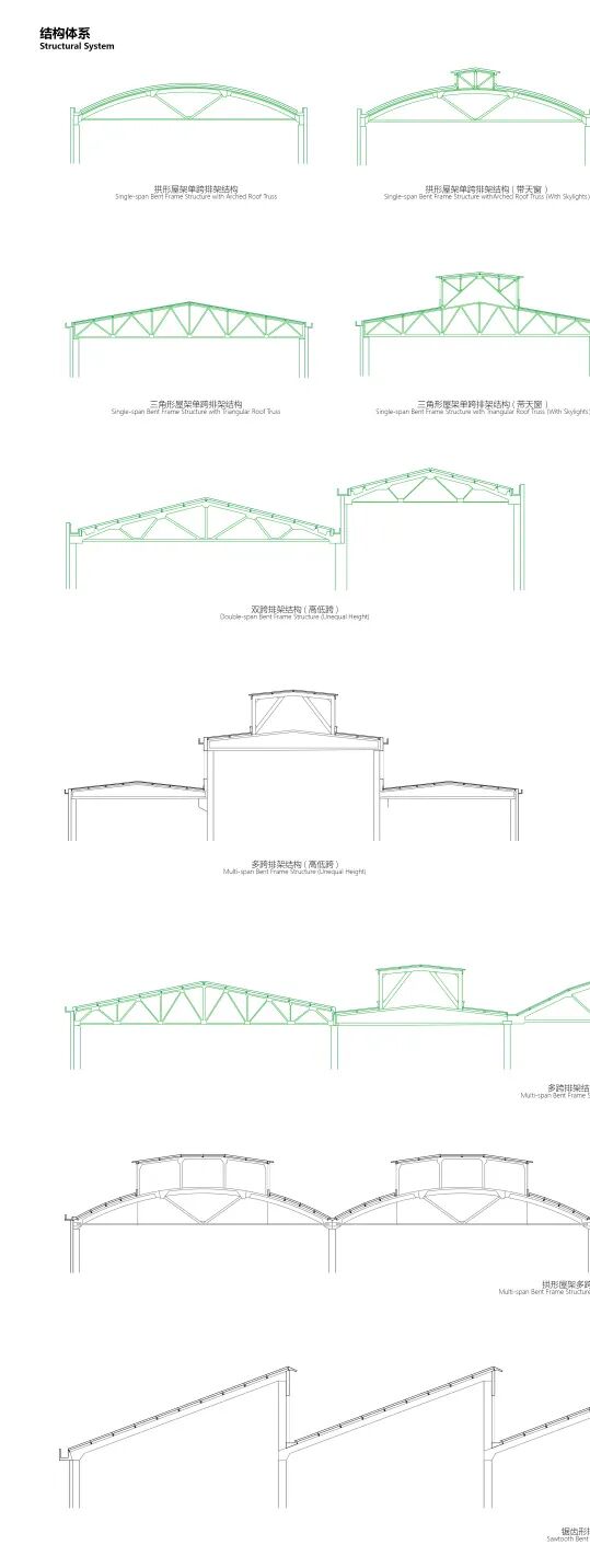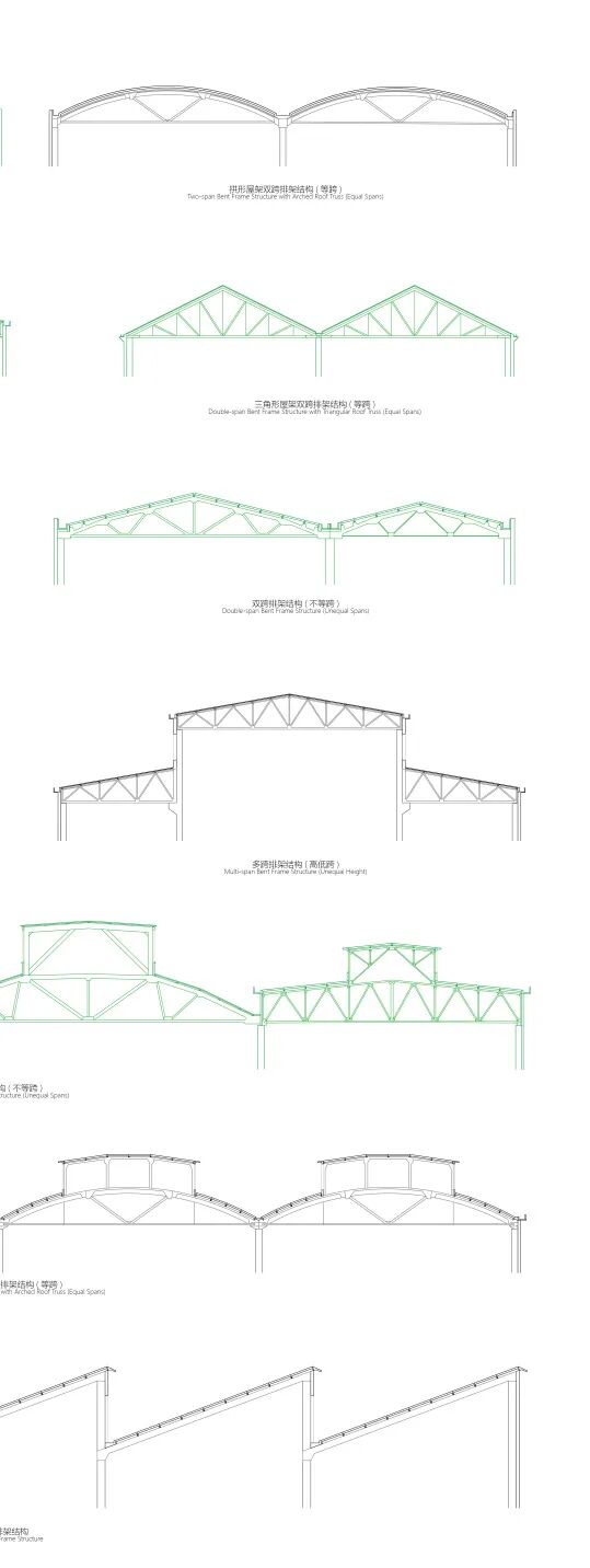 不同的排架柱类型、结构体系,与工厂内机械设备的连接关系