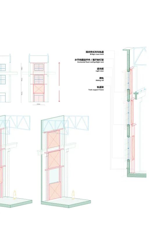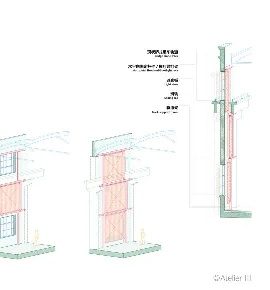 “最开始做概念设计的时候有点儿没敬畏心,觉得厂房是就常规排架结构,柱子的制式都一样,其实还是把厂房当成了一张白纸。深化的时候发现很多细节都不一样。比如老的行车梁与窗户之间的距离有大有小,会影响遮光板的设计,所以三号厂房北边的遮光板是上小下大的阶梯形轨道,四号厂房的是凸字形的轨道。每一段柱子和梁也不一样,旋转门不能简单地复制。所以,首先要理解差异,才能设计出适应这些差异的标准构件。”