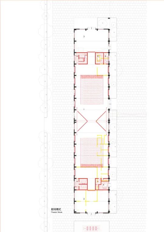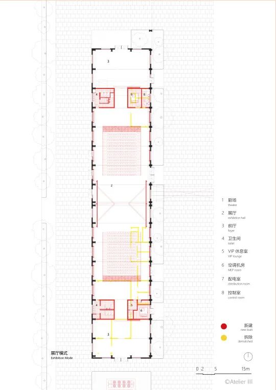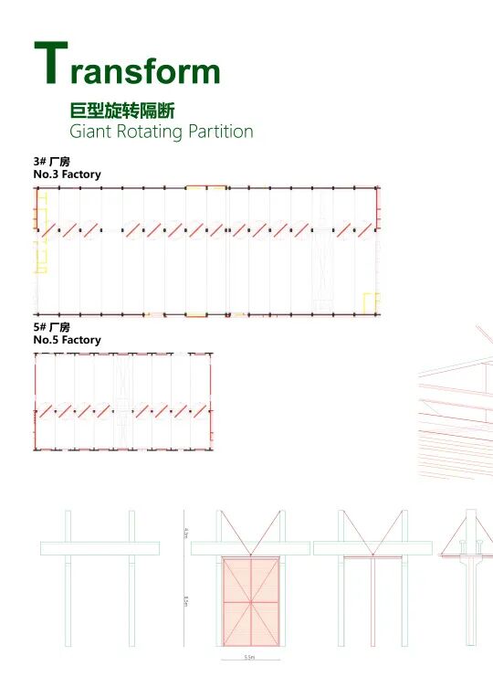 “起始概念是我有一次去杭州出差,在机场看见了飞机的机库门,像是一面巨大的墙在移动。我想那么大的门都能动,在工厂里安装像门一样的巨型隔断应该也可以。”栗若昕说。一扇扇可以移动的墙,灵活地分隔空间——设计最核心的想法在他的脑海里诞生,贯穿方案始终。通过旋转门和平移门,面积最大的三号厂房最多可以隔出四间大小不一的展厅,根据需求灵活租赁,自由分隔。四号厂房放入伸缩观众席和折叠LED屏,功能在剧场和展厅之间切换。窗前安装可以上下滑动的遮光板,控制进光量。