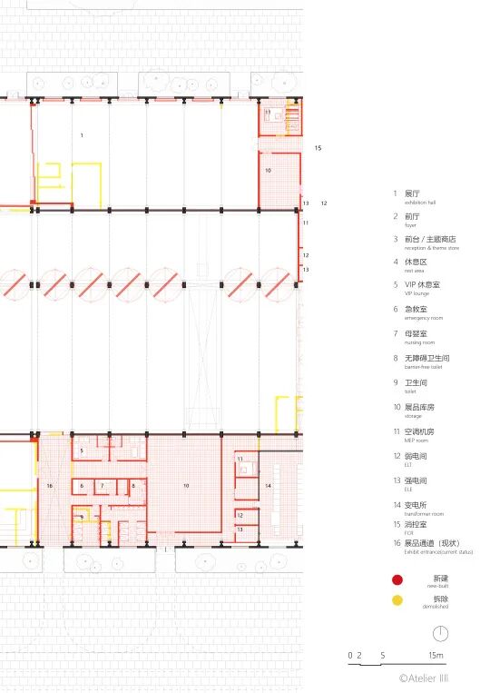 栗若昕已经在运营团队里与业主沟通了一年,十分清楚设计的约束条件和使用需求。工厂的新定位是“博览集群及商业配套”,为了提高空间的使用效率,需要重新划分室内,但是不能加建二层;其次,不能改变现有的防火分区;第三,在不改变建筑外观的前提下遮挡自然光,满足展览展示的环境要求;第四,则是未来使用的不确定性。