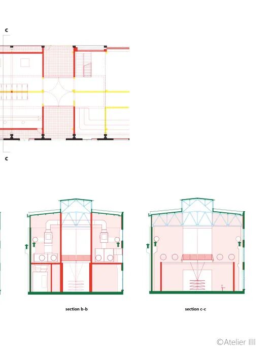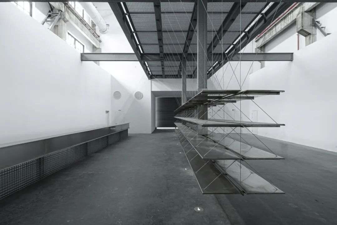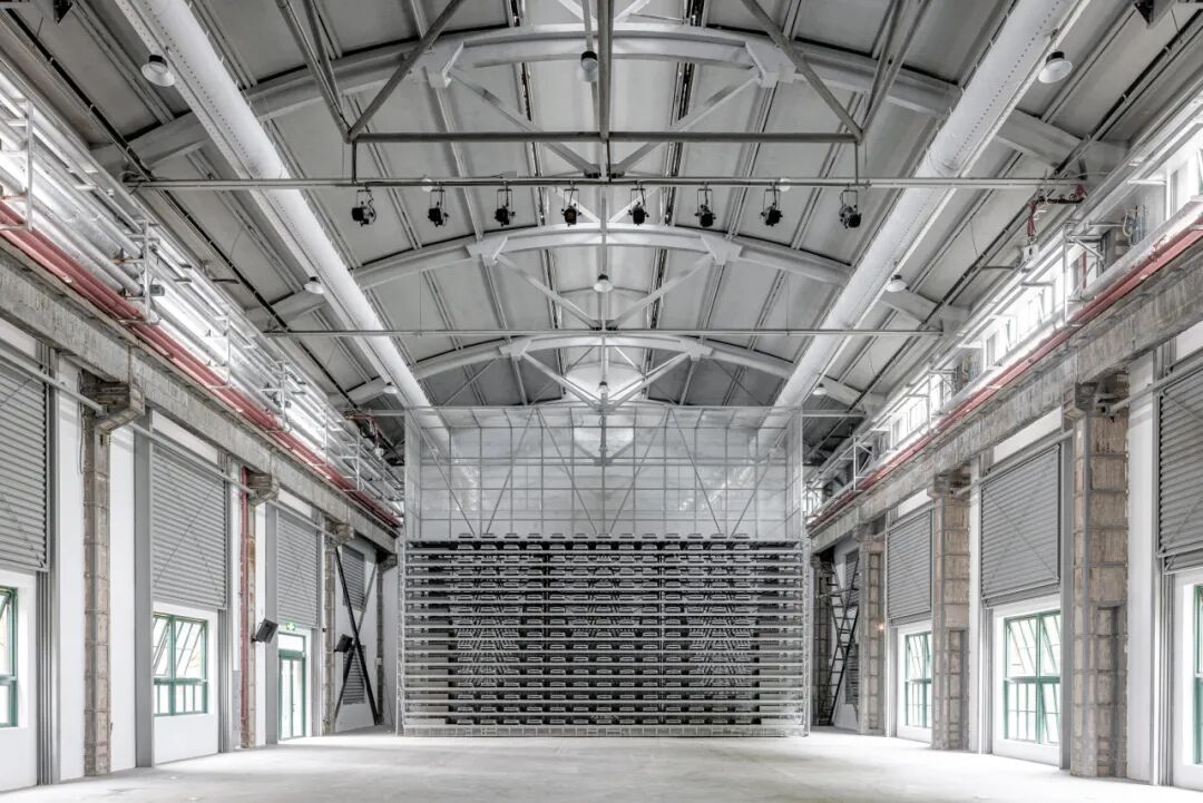 空调管道巧妙地藏匿于桥式吊车之间,同时半透明金属网沿着吊车边界将这个出风口系统裹,原始厂房的设备如橱窗中文物一样有趣的展示在空间中