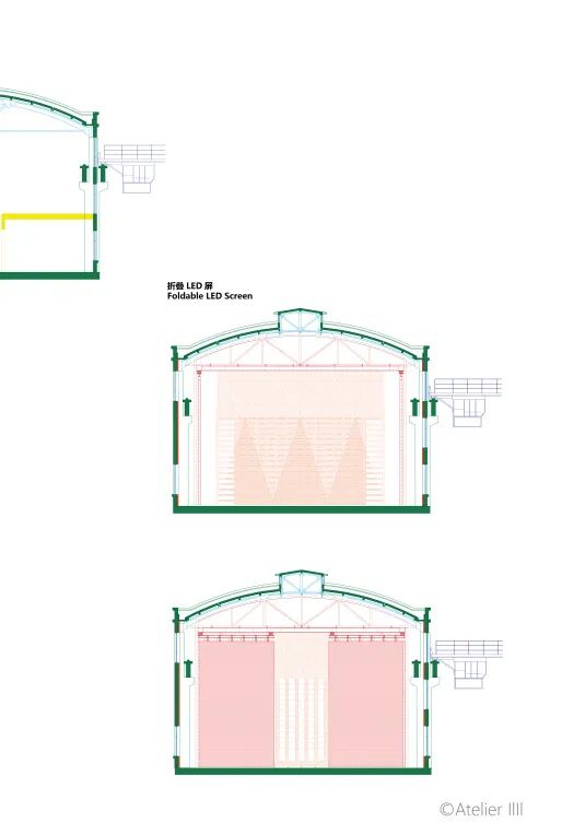 四号厂房观众席收缩状态和展开的观众席和折叠LED屏