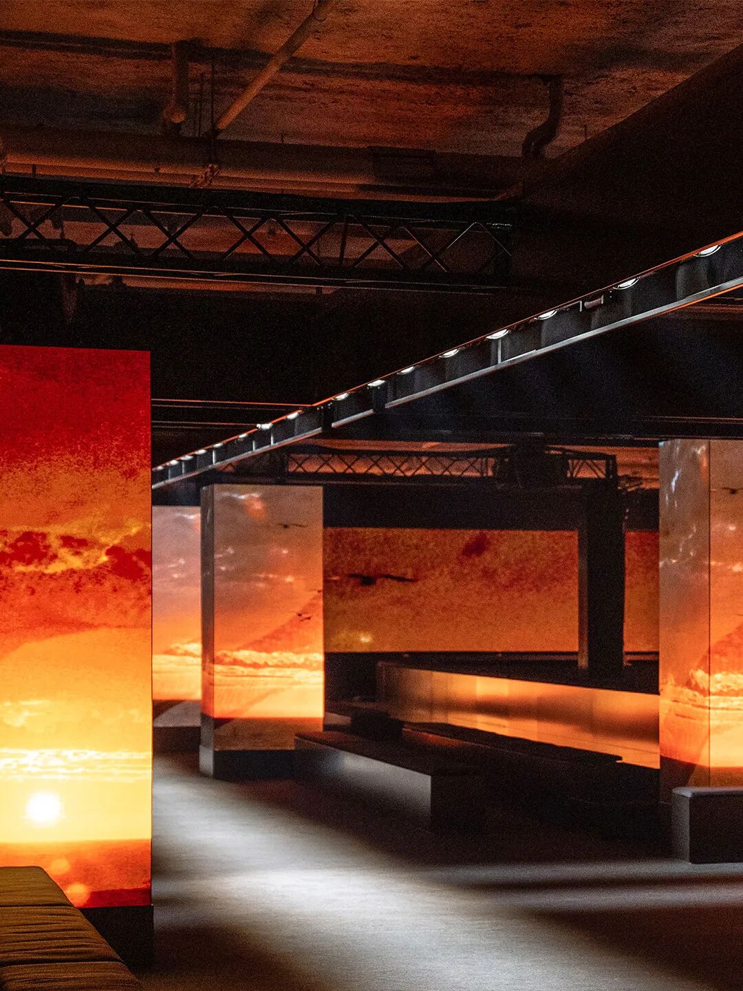 Sam Levinson为本次大秀打造了专属的影像装置,将日出日落的景观碎片、明暗交织的画面融入整场环境,构建出沉浸式数字现实空间。正如Sam Levinson所言:“光与影之间的张力——没有影,光会变得单调而刺眼;没有光,影则会吞噬一切。我的作品始终在讲述角色寻找光与影之间的平衡,试图找寻内里本就存在的和谐,以及活着本身的奇妙。”