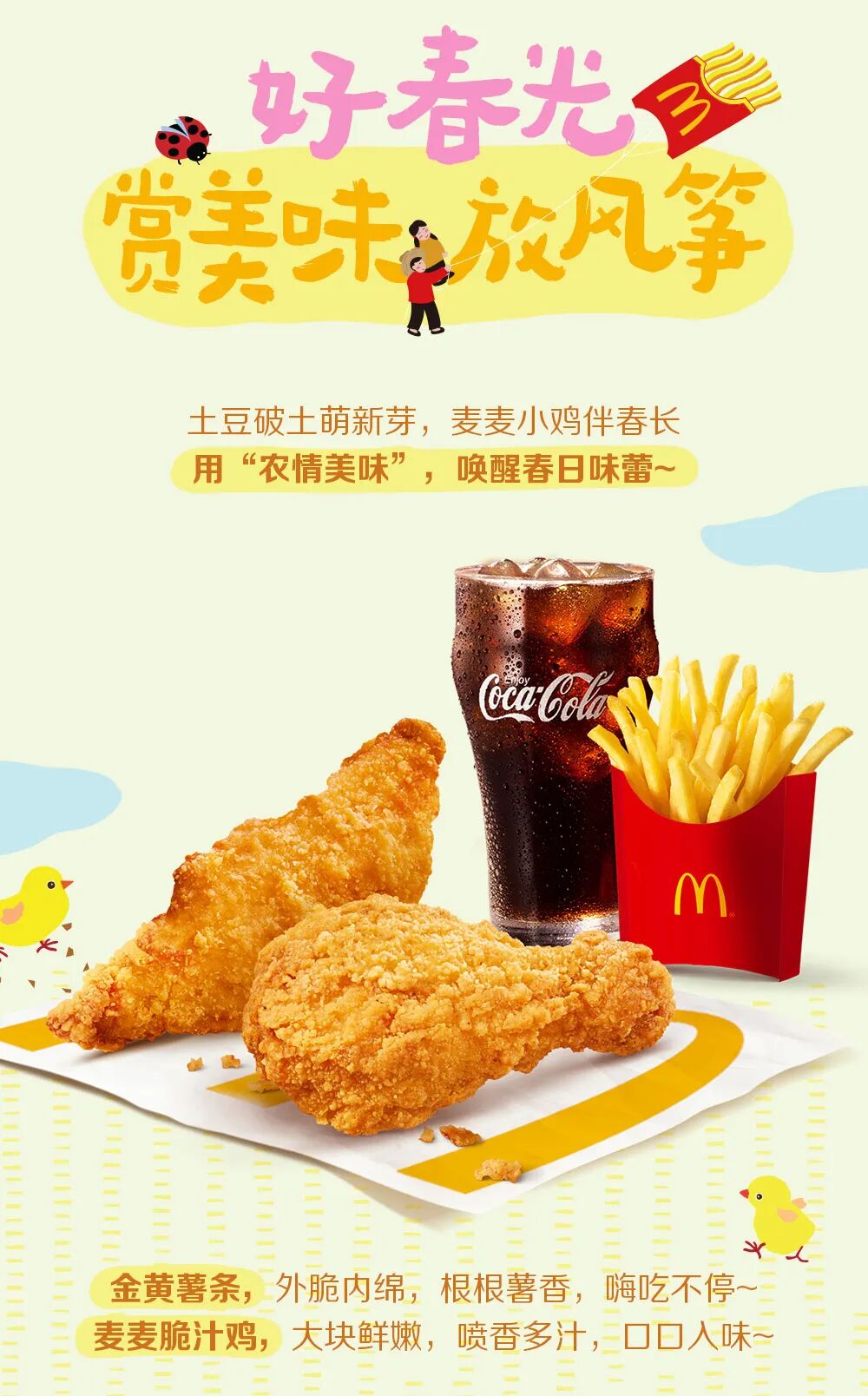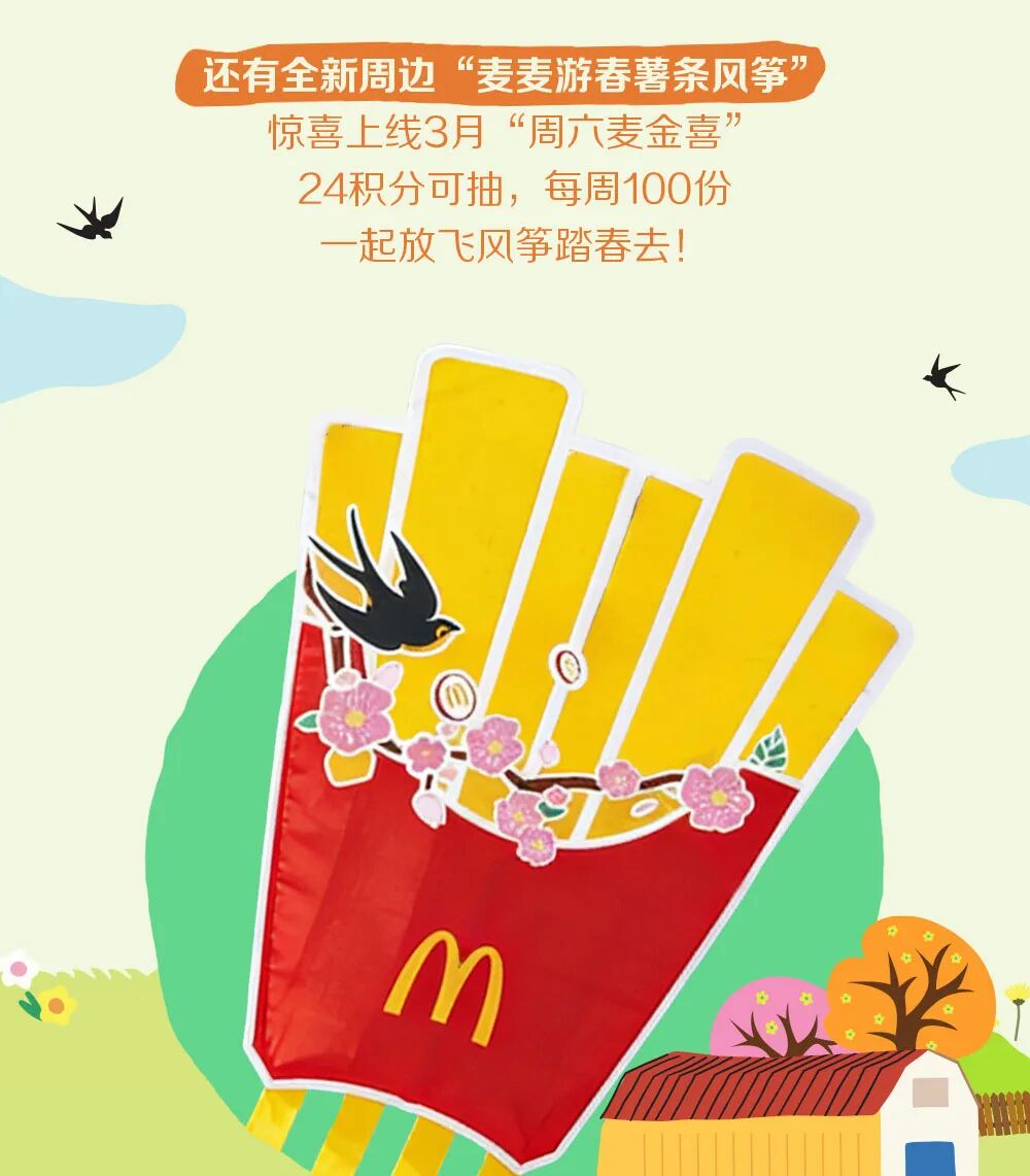 仅限麦当劳用户在每周六,登录麦当劳App【大抽奖】界面参与抽奖。“麦麦游春薯条风筝”及各奖品详情、限量数及兑奖方式等规则详见活动页规则。请您将麦当劳App升级到最新版本方能参与本活动。食品及包装以实物为准,图片仅供参考。