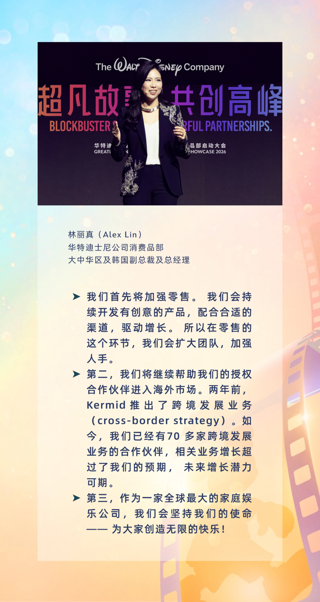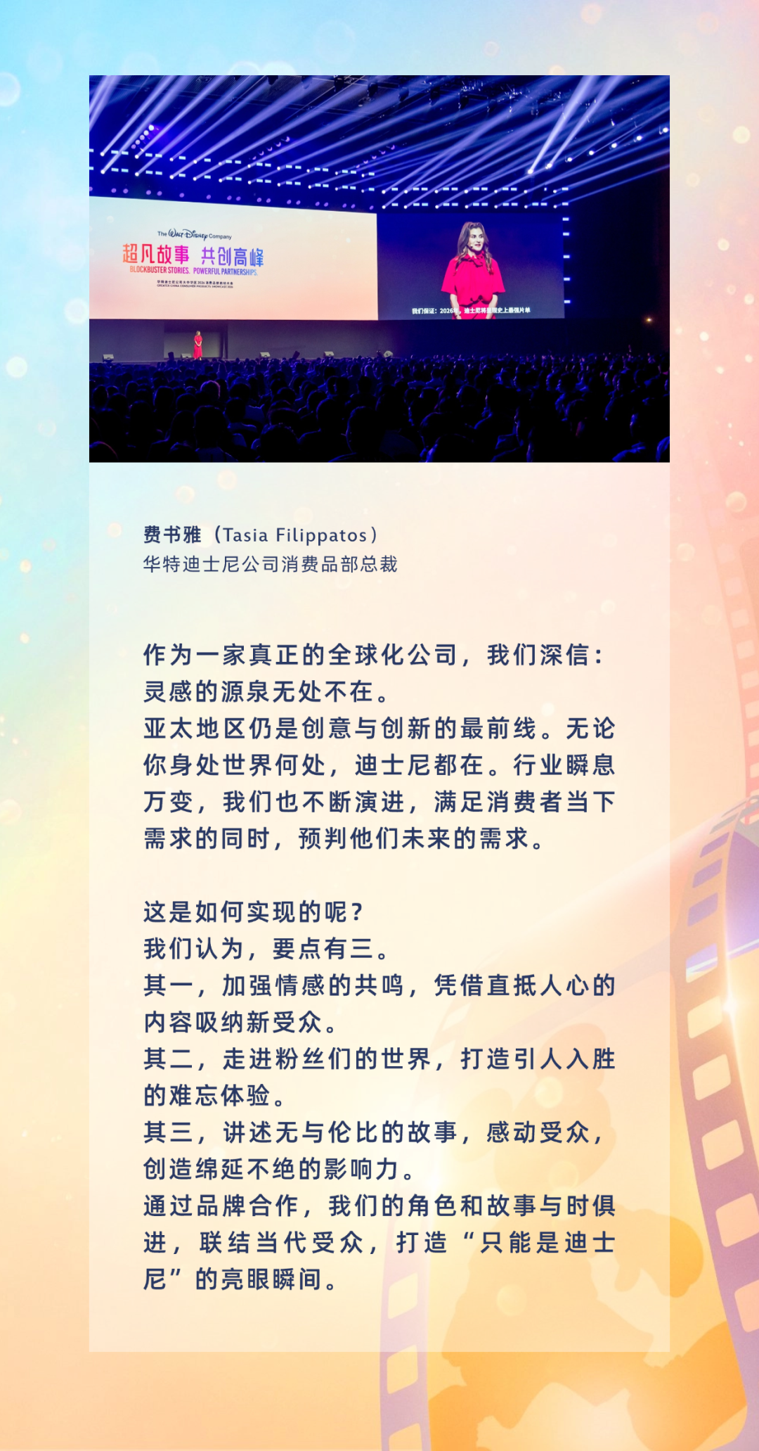 从前沿消费者洞察、业务发展战略,到最新产品趋势与创意设计,现场宣布了一系列精彩纷呈的内容,包括迪士尼旗下经典人物故事系列的市场活动。