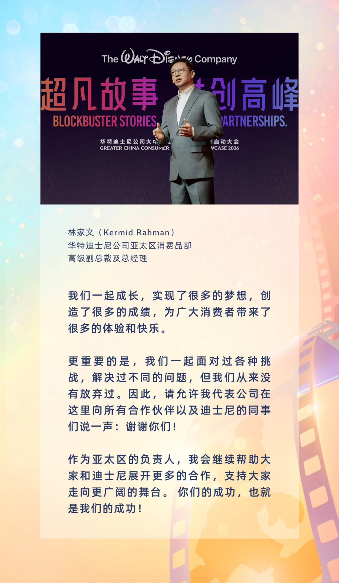 迪士尼始终坚持以消费者为核心,作为全球领先的授权品牌,我们不断洞察市场变化,倾听不同世代的声音,力求为每一个年龄层的消费者,创造独特的奇妙体验。