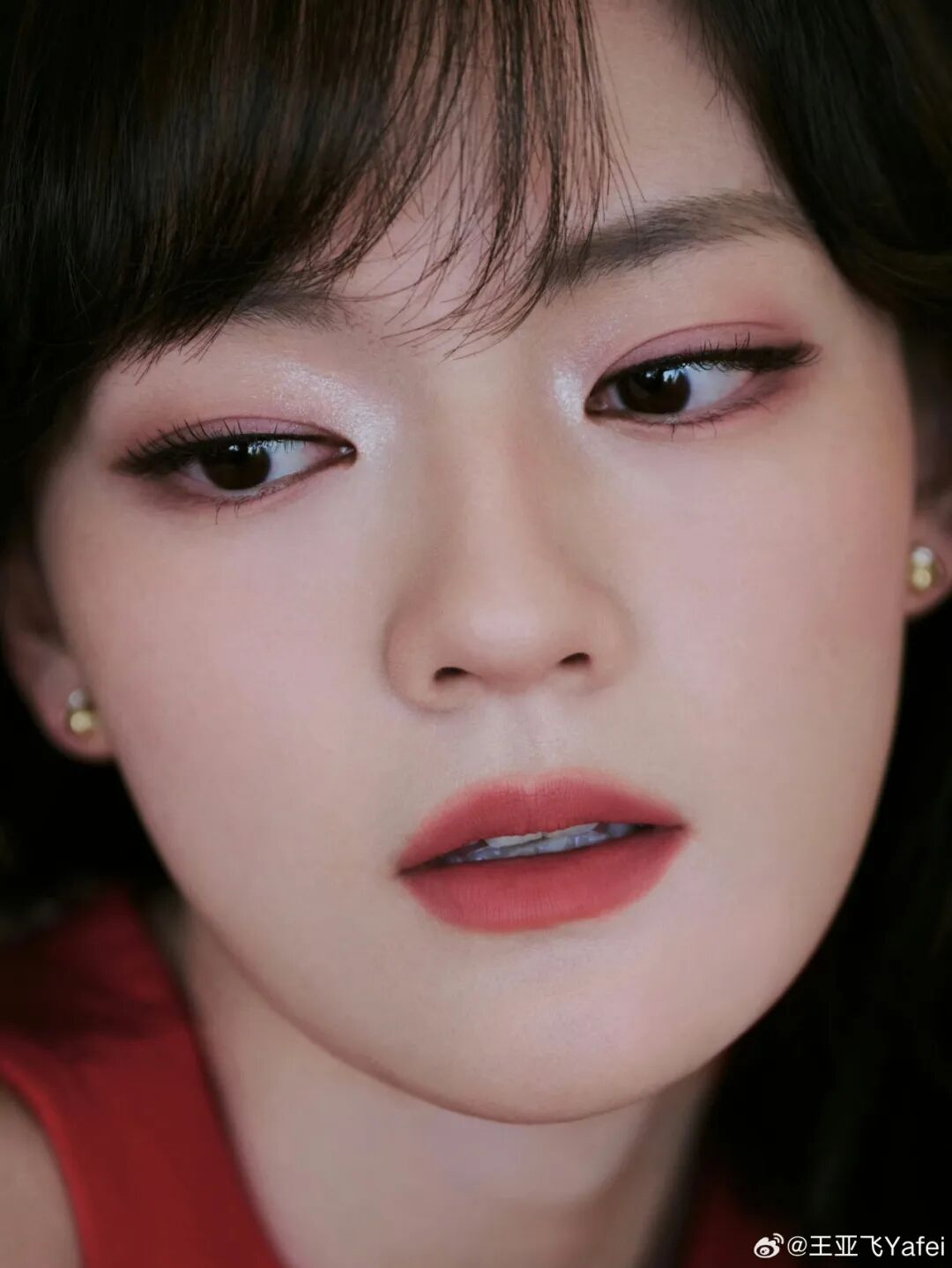 张予曦的这款妆则比较淡,最突出的是樱桃色鎏光唇釉,水润透亮,眼下淡淡的腮红轻轻扫过,刚好和唇色相呼应,不浓不淡,分寸感拿捏得刚好。整张脸没有多余的色彩,却温柔而甜美。