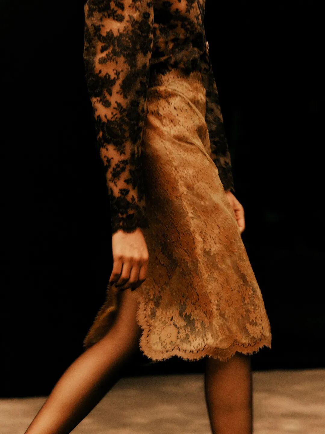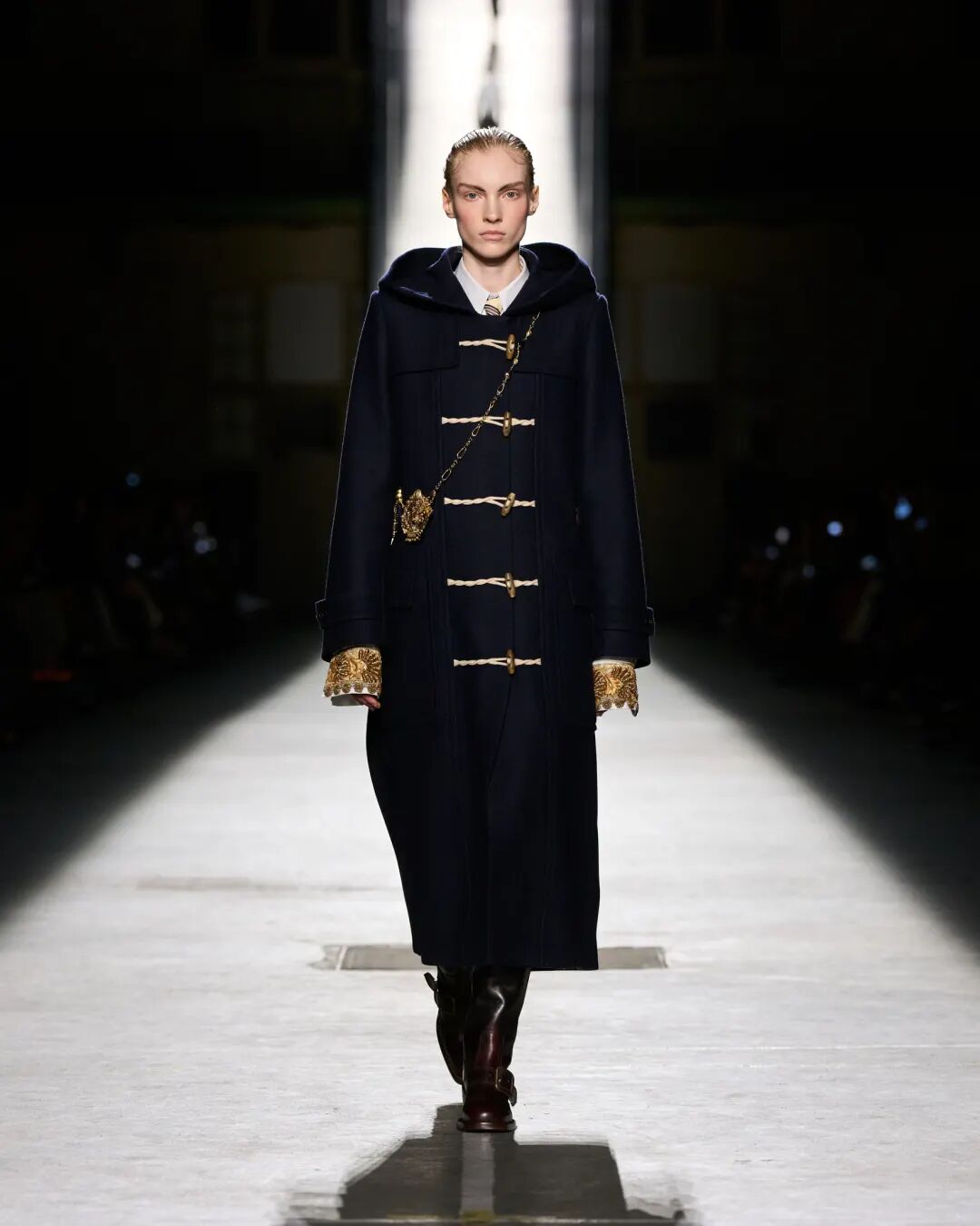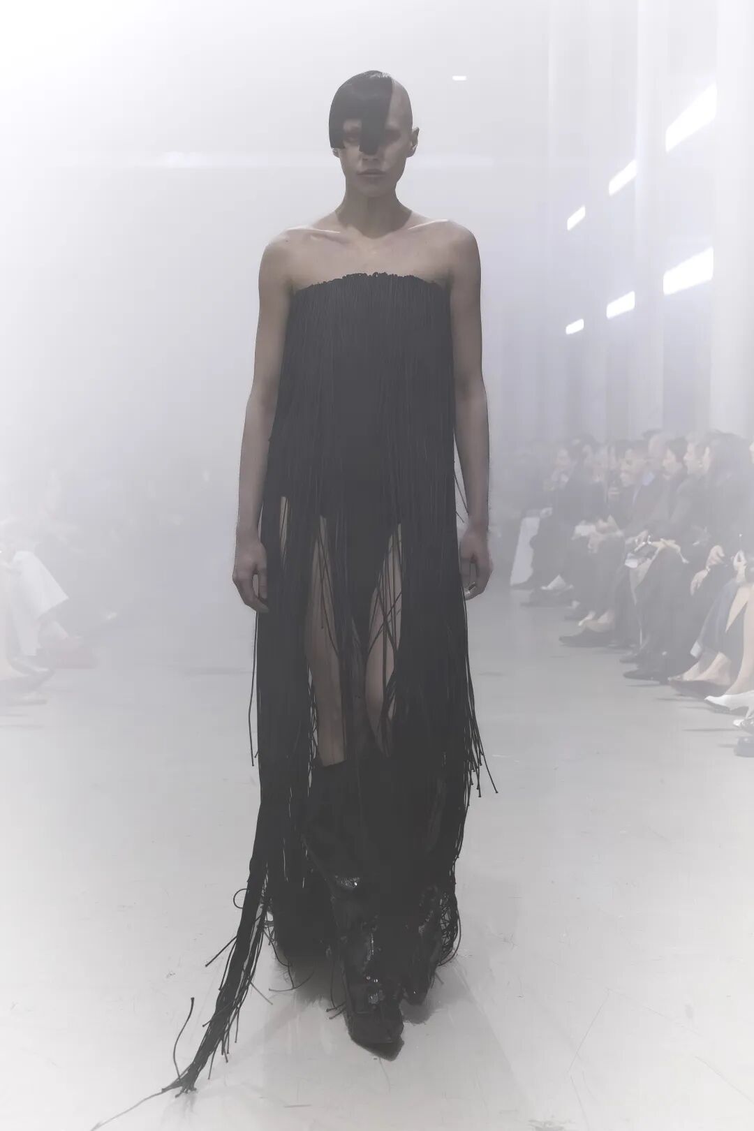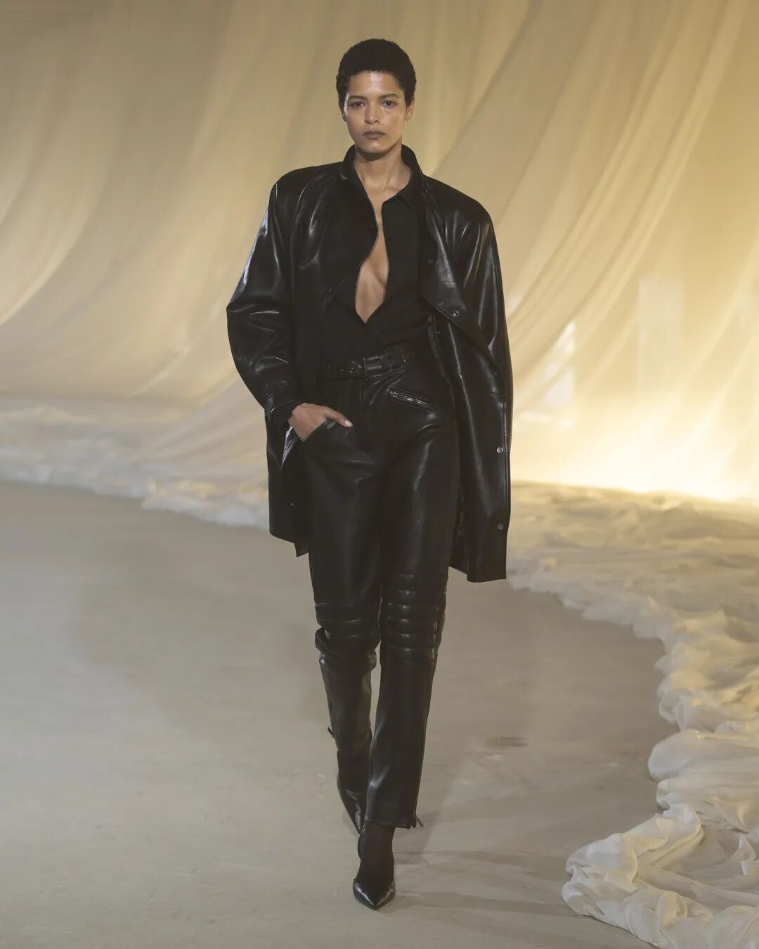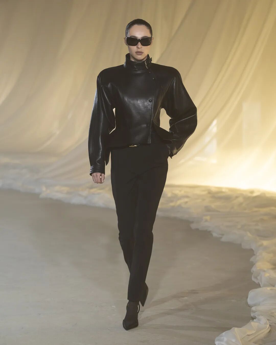 揭开大秀序幕的TOWER紧身连衣裙,选用光面黑色公牛皮、强缩羊毛或凯夫拉纤维裁制而成,这种纤维比钢材坚韧五倍,传统上用于防弹衣等防护服装。我们的凯夫拉帆布在意大利科莫由一家第三代家族经营的工厂织造,自1952年创立以来,这家工厂一直专精于功能性服装面料。可拆卸外套由短款夹克构成,既可单穿,也可层叠于加长款配套马甲之上,构成一座塔的造型。