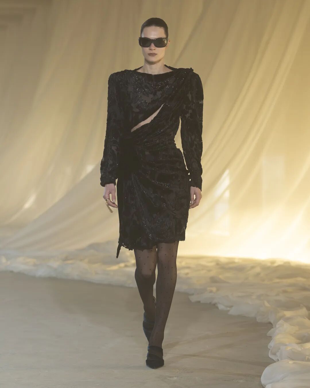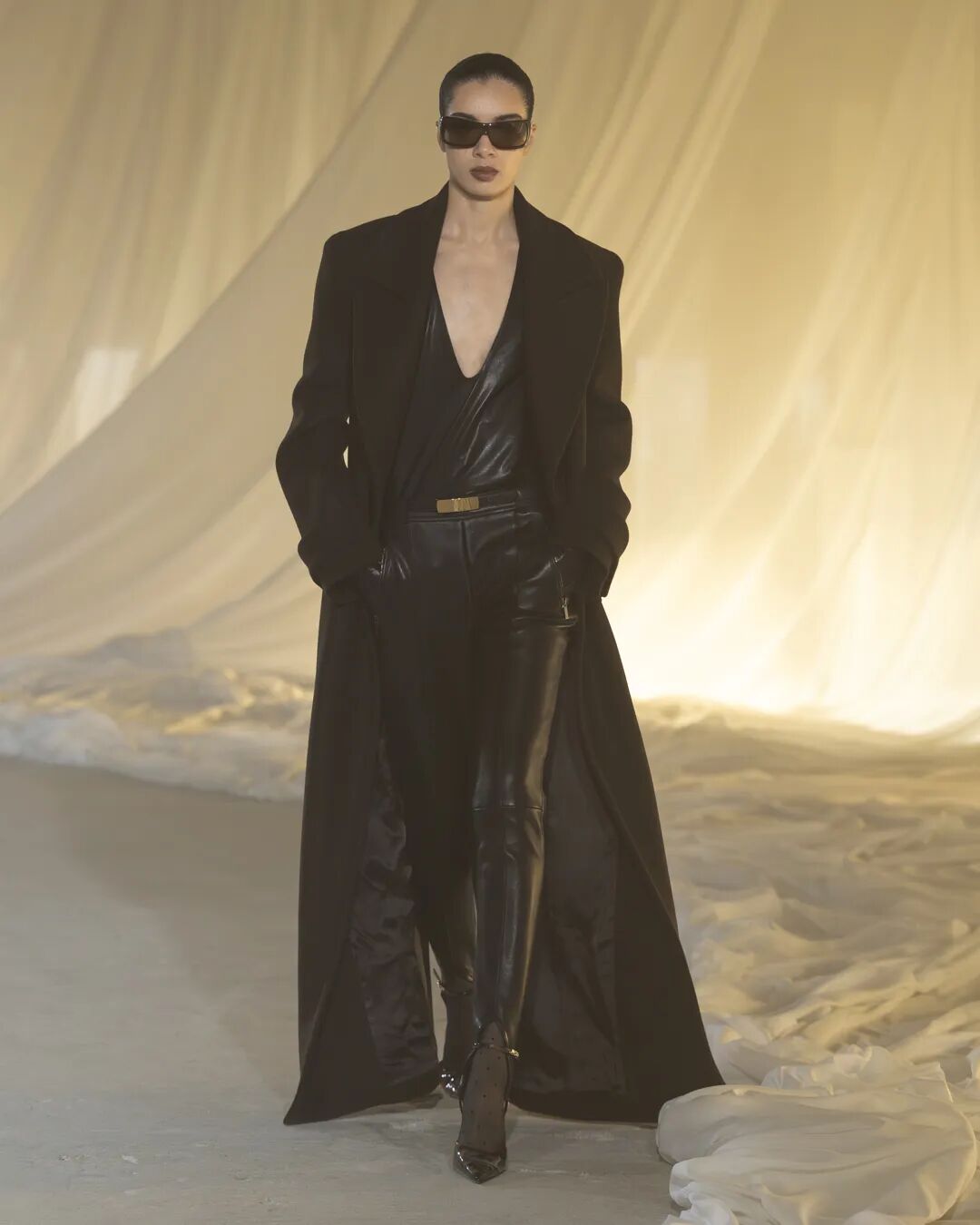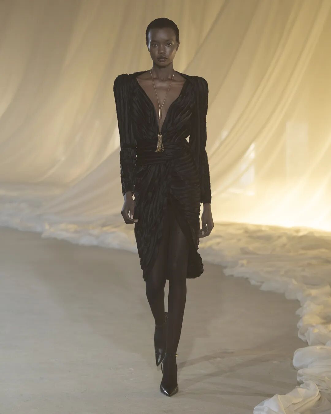 精妙剪裁,成为整场大秀的灵魂。Vaccarello以一系列单排、双排扣黑色西装开篇,遥相呼应上世纪70年代末至80年代初 的理性克制感,又凭借情感注入,超脱于权力的符号化表达,于刚柔维度间构建静谧流动的对话。锋芒毕露的斜肩线条 渐次收窄至柔韧腰身的廓形贯穿整个系列,赋予女士西装舒展的松弛与自由气息。若说这是Vaccarello为整场大秀定下的 基调,那么他的终章则将品牌经典吸烟装革新重塑,以更慵懒不羁的姿态诠释其暗夜风华。