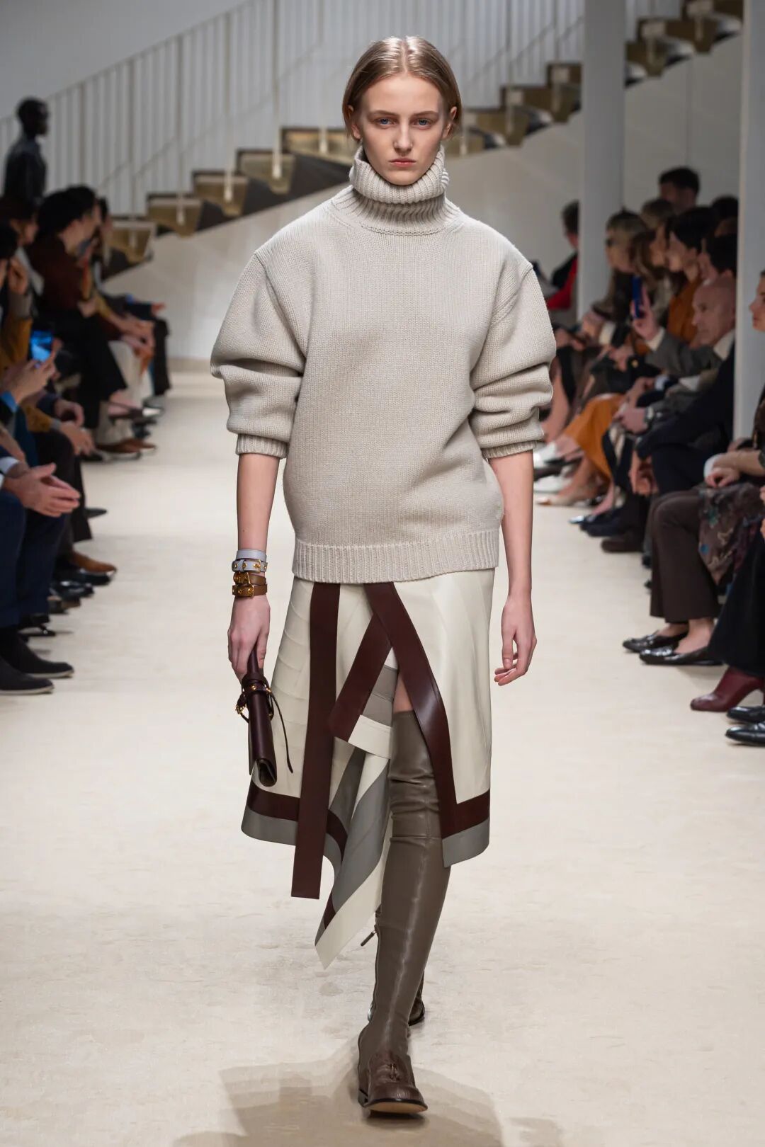 匠艺打造的层叠肌理巧思,糅合Bottega Veneta精湛手工,以丝绸、剪花织物、针织面料与科技纤维摹刻出皮毛质感,让这份肌理之美在服装、珠宝与鞋履间灵动漾开、层层铺展。随着简约风格向歌剧风格的演变,让人联想到希腊著名女高音歌唱家玛丽亚·卡拉斯(Maria Callas)和意大利导演皮埃尔·保罗·帕索里尼(Pier Paolo Pasolini),以及他们大胆先锋的艺术和不拘一格的爱情。