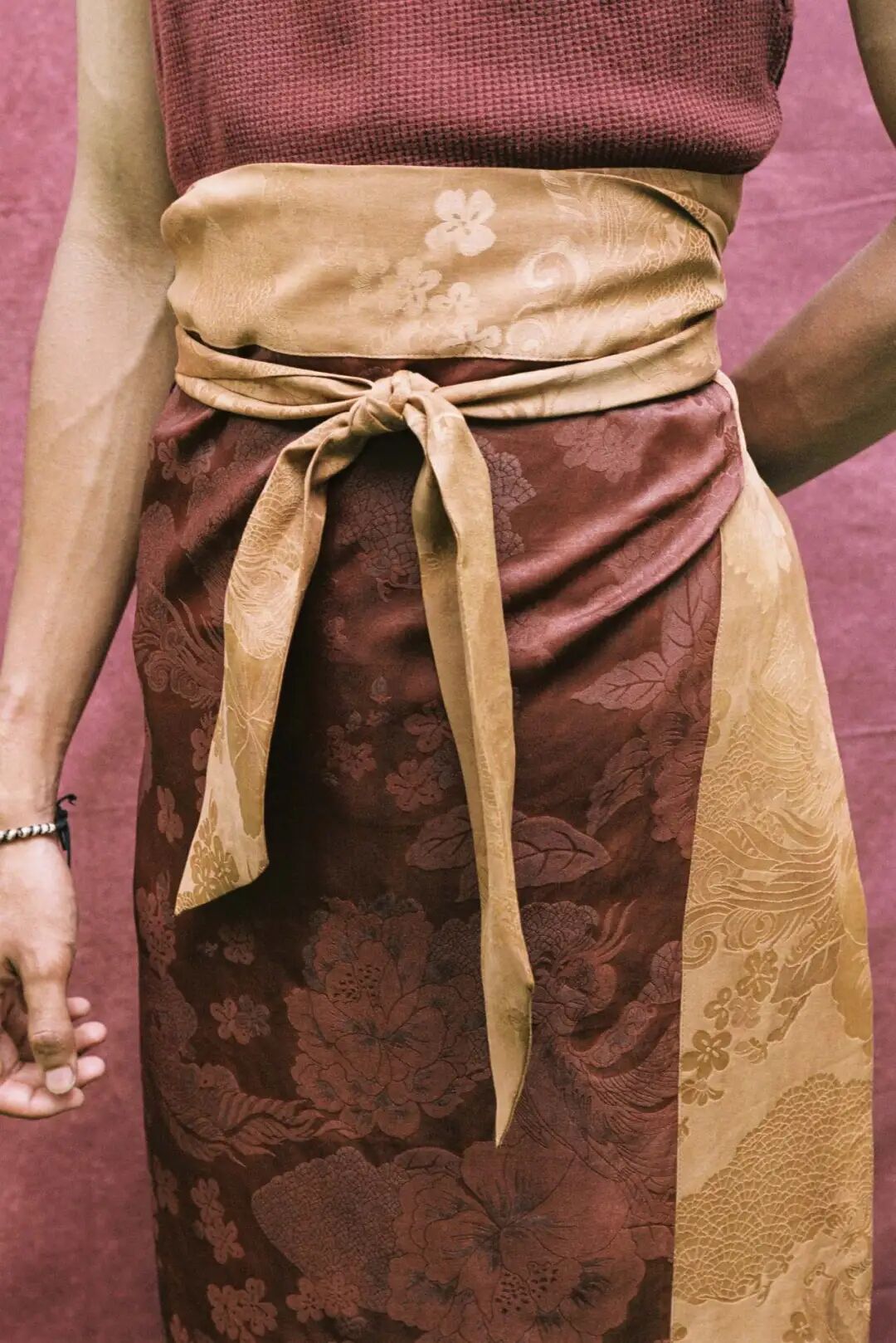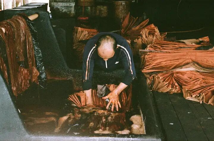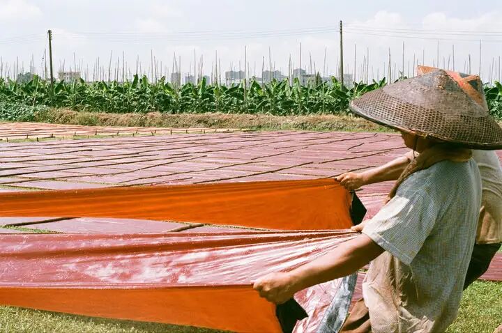 资深匠人需将真丝浸入生长七年才可采收的薯莨汁液中,并在烈日下反复曝晒多达 30 次,随后手工涂抹富含铁盐的珠江河泥以触发化学反应,才能达到想要的纹理与色泽。