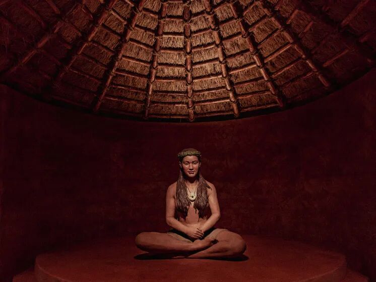 牛河梁最令人震撼的发现之一,是那座被称为“女神庙”的遗址。庙中出土的一尊泥塑女性头像被视为“中华民族共祖”:高颧骨、微张的嘴唇与镶嵌玉石的眼睛,令人初见时就产生一种奇妙之感,似与一双从远古凝视而来的眼睛对视,五千年前的信仰仍在此处停留。