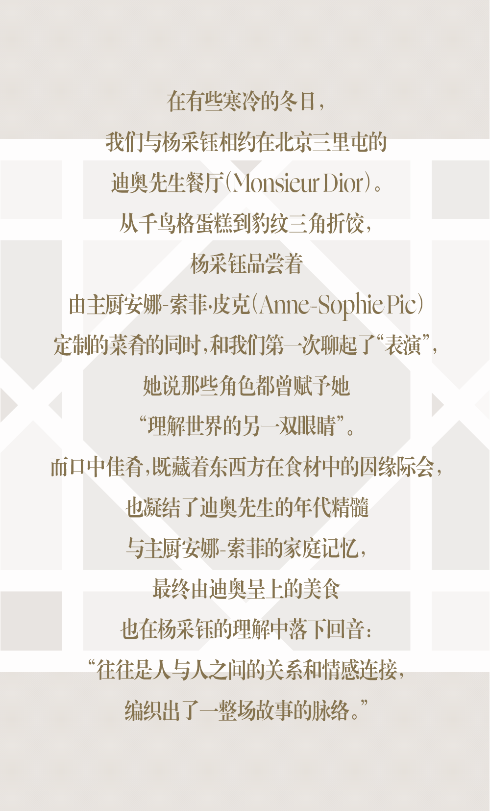 安娜-索菲也从迪奥经典元素和档案中汲取灵感,将迪奥标志性图案如藤格纹(Cannage)、茹伊印花(Toile de Jouy)等转化为精致糕点和菜肴上的装饰。杨采钰品尝的甜品Le Pied-de-poule千鸟格便源于迪奥经典的千鸟格纹(Houndstooth)。在品尝菜品的同时,她也仔细感受着用餐体验与氛围:“菜品和餐具互为点缀,对彼此来说都很重要,从视觉到嗅觉、味觉,融合得很巧妙,不仅是在吃饭,更是在欣赏艺术作品。”