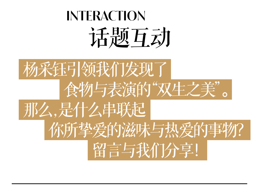 无论是美食的创作还是表演,都是在连接一段记忆或是一个人。在杨采钰看来,通过诠释不同角色,她获得了理解世界新的视角。她还有很多希望尝试的角色,“从古装、悬疑到科幻等不同题材都想尝试,只要是能够展现人性之复杂的作品都会让我跃跃欲试。角色没有大小,我也想扮演所谓的‘小人物’,这类角色身上往往拥有更加丰富的情感面,又或是对于当下事情截然不同的解读。”