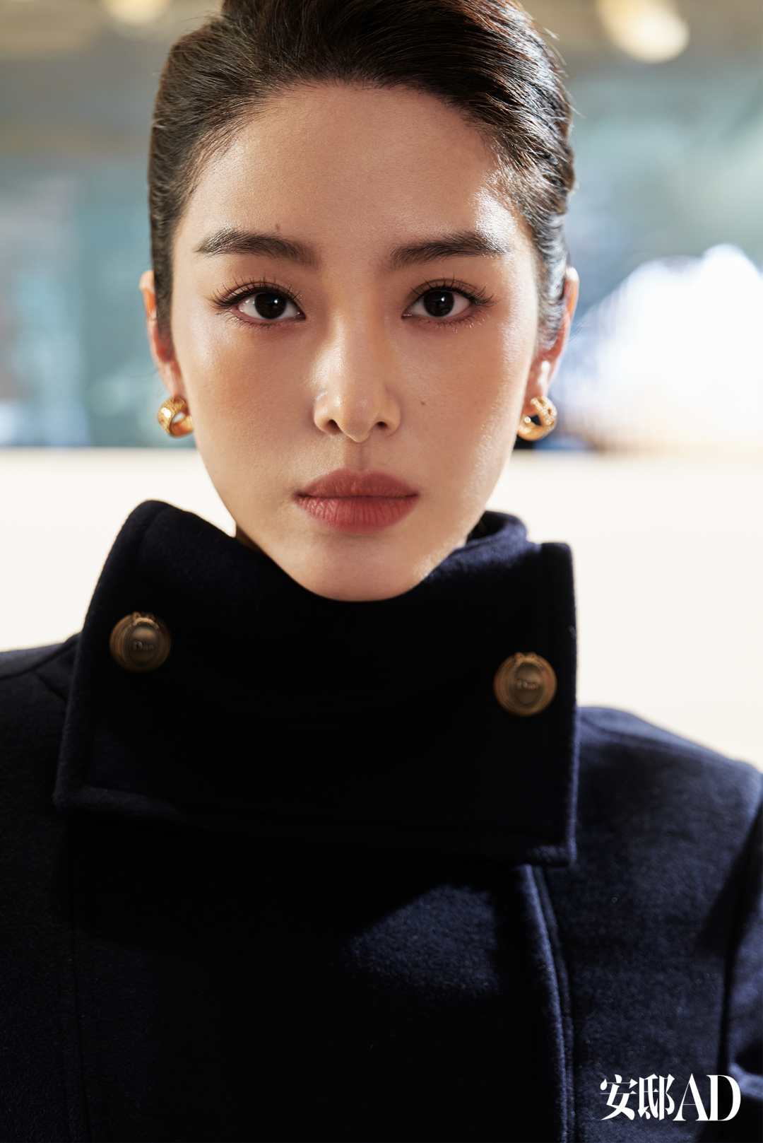 杨采钰佩戴My Dior系列玫瑰金耳环;身着深蓝色外套、深蓝色牛仔长裤,均为Dior。