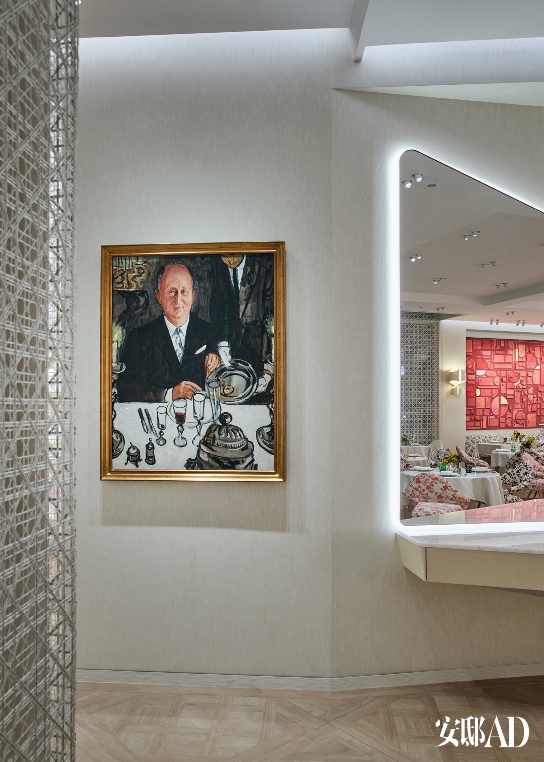 餐厅侧墙上悬挂着一副René Bouché画作复刻版Christian Dior at table,2025。
