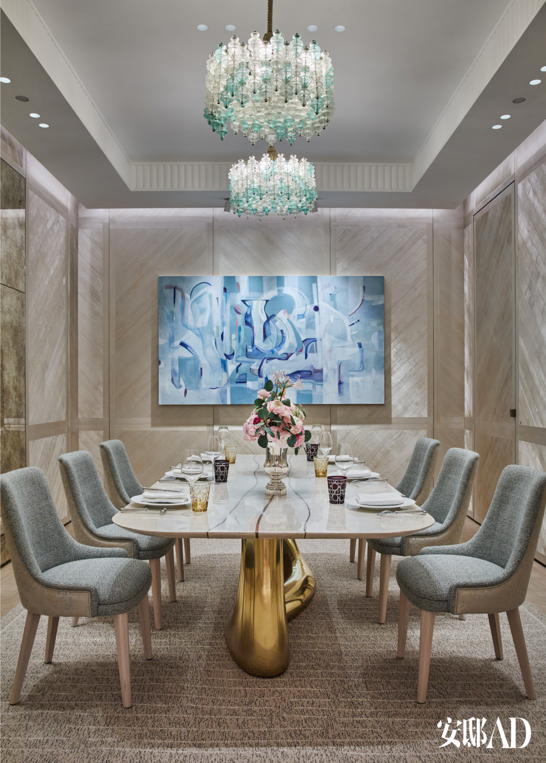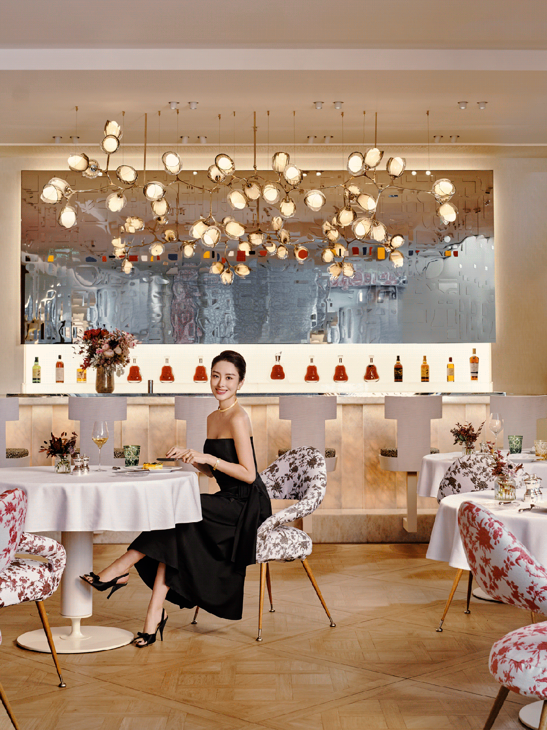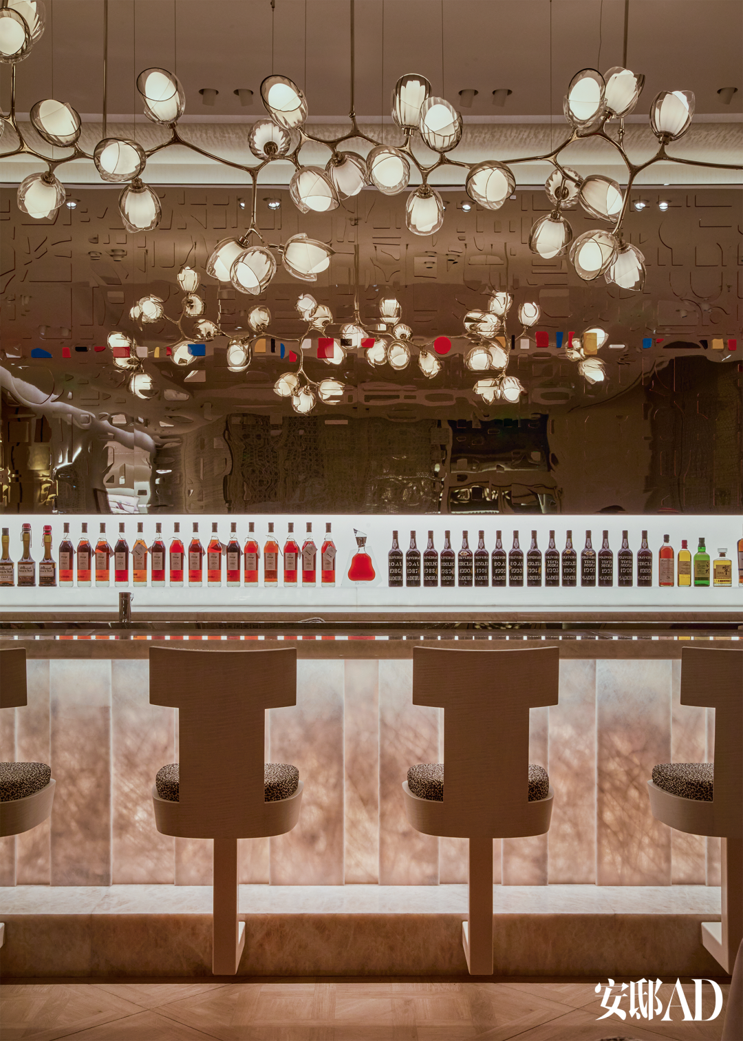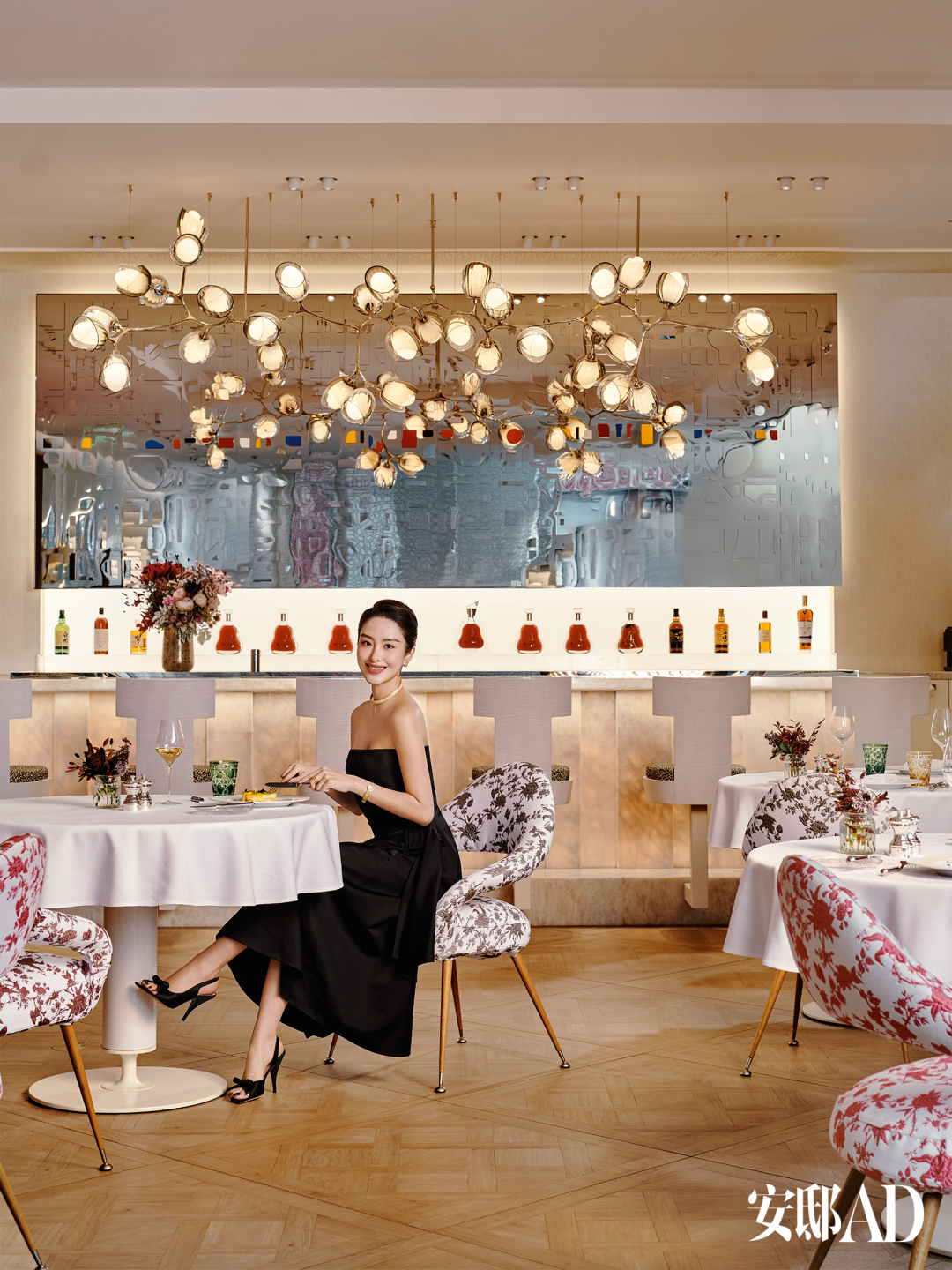 “整个环境给人一种宁静自然的感觉,好像一下子远离了喧嚣。”杨采钰从户外走进餐厅,径直走向吧台,“我最爱的就是这个吧台——宽敞的台面,搭配墙面上整面镜子般的艺术品,人影晃动之间,好像我们也成了迪奥先生设计中的一部分。那种感觉,大概就是‘自然与生活是一切灵感的源头’。”杨采钰望着眼前艺术家洪浩的作品《万相之三十七》说道。