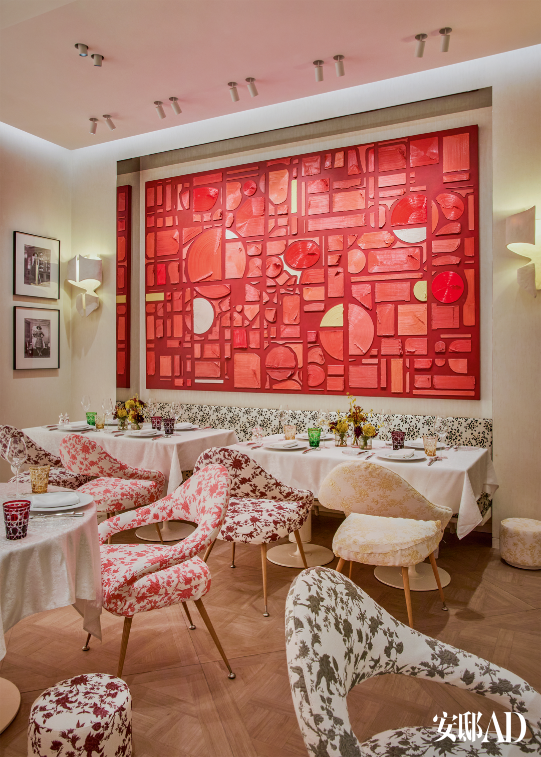 餐厅包间的墙壁上悬挂着法国艺术家Mathilde Denize的画作Sound of Figures,2025。桌面上悬挂着意大利设计师Gino Sarfatti的灯饰。