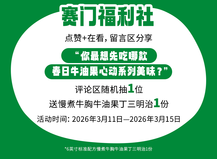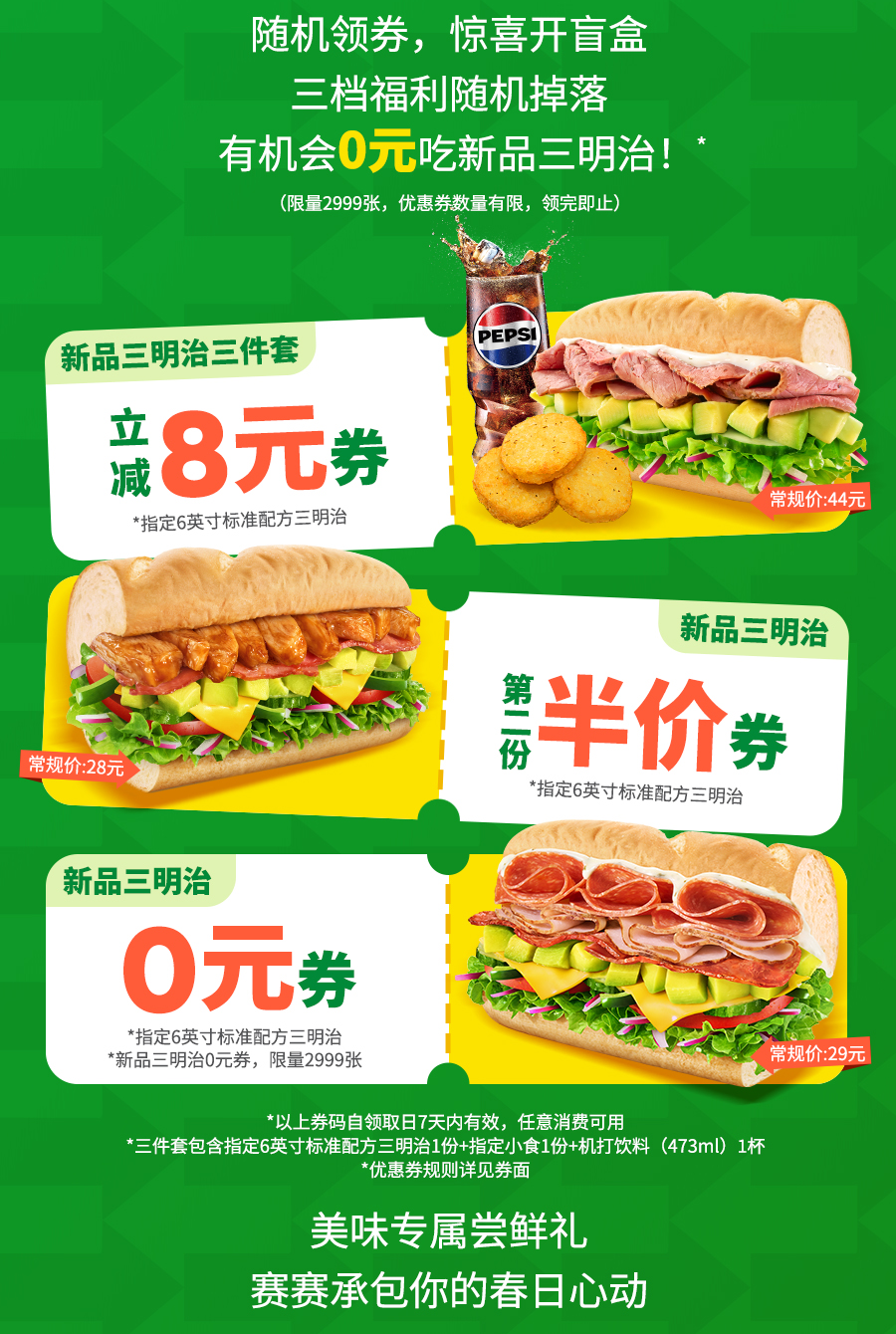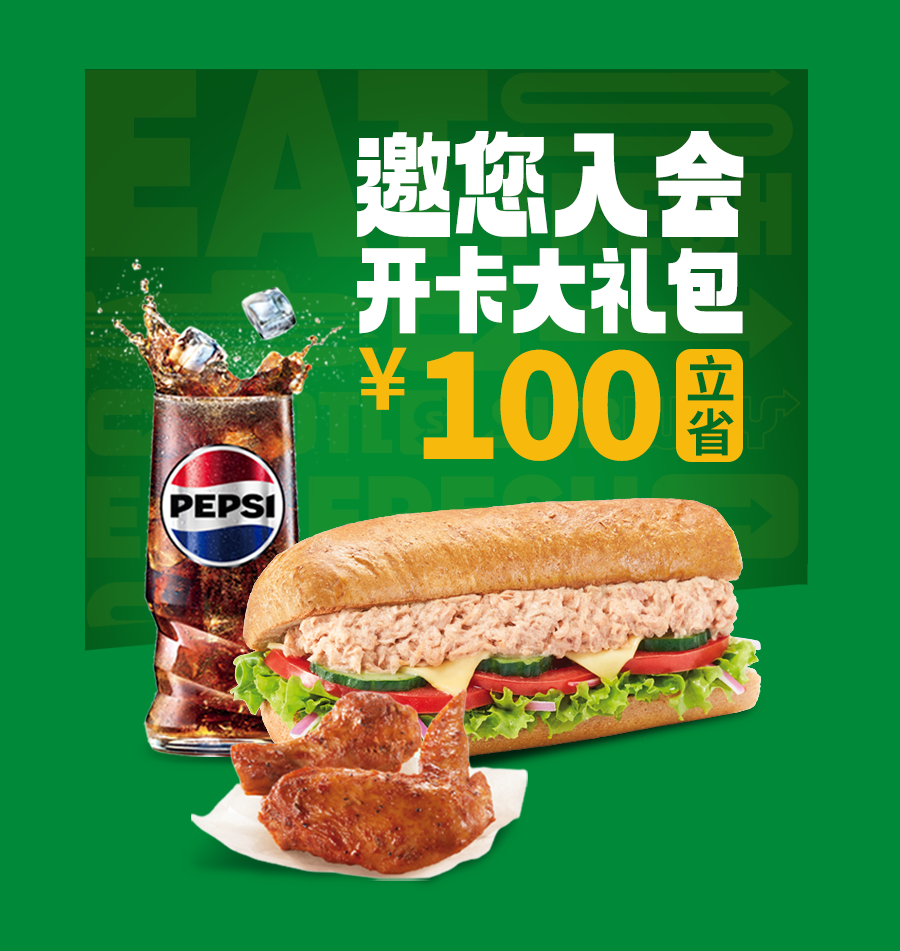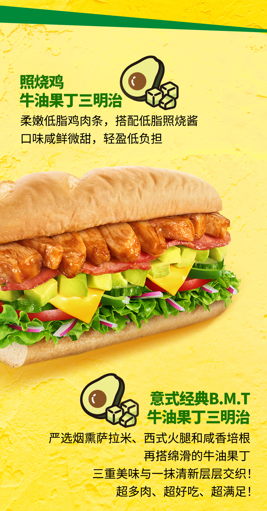 上述产品限2026年3月11日到2026年5月12日于SUBWAY®赛百味中国大陆地区部分餐厅供应,机场、火车站等交通枢纽餐厅、旅游景区餐厅、园区内部餐厅等特殊餐厅不可使用,具体以餐厅公示为准。产品以实物为准,以上为创意图片,仅供参考。SUBWAY®赛百味可以在法律允许的范围内对活动进行适当调整。Subway® is a Registered Trademark of Subway IP LLC © 2026 Subway IP LLC.
