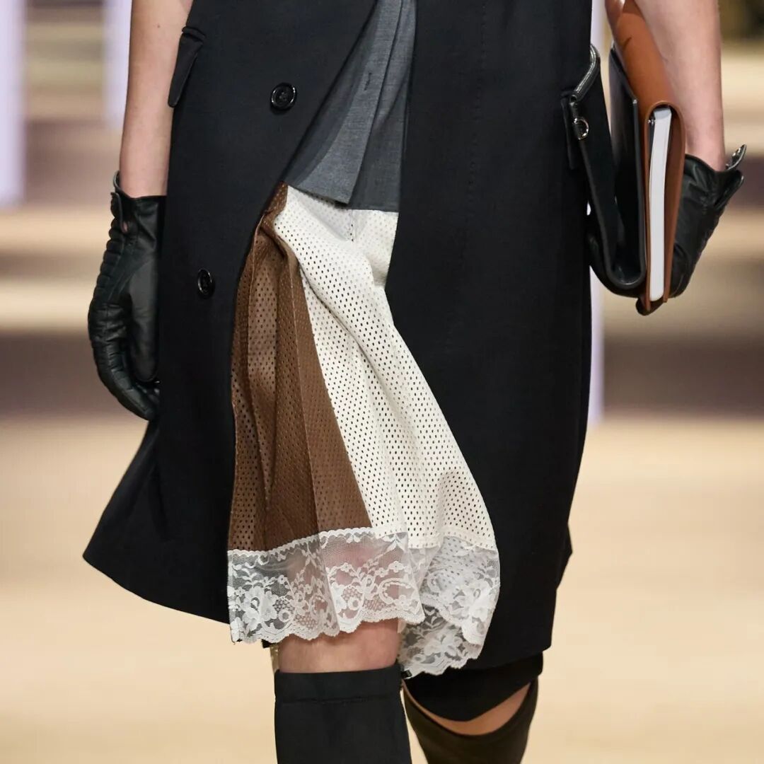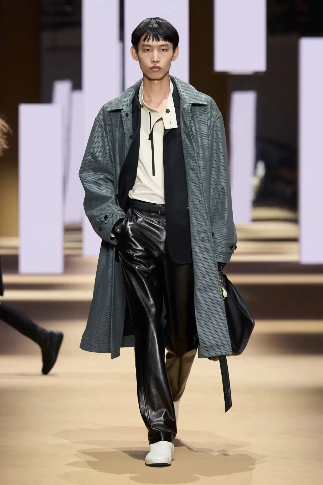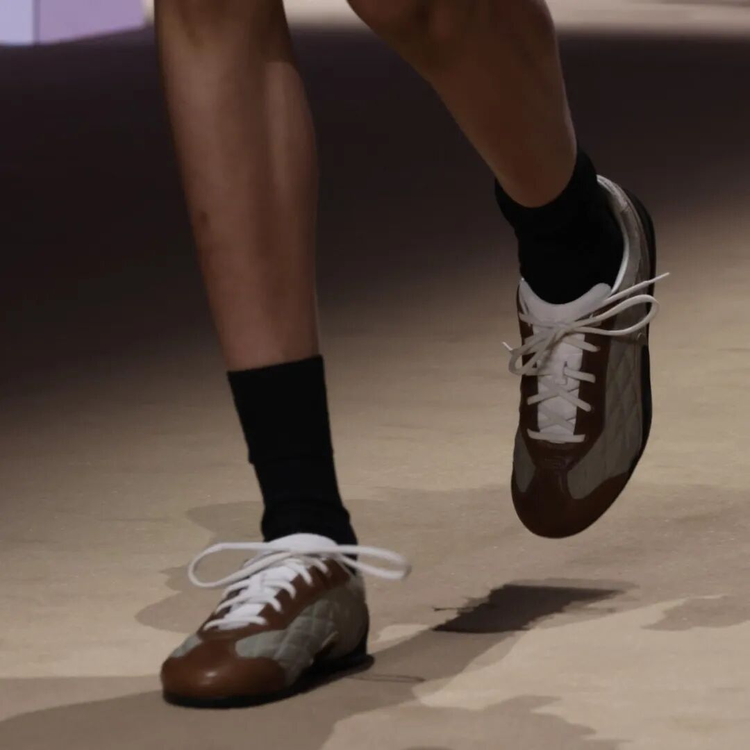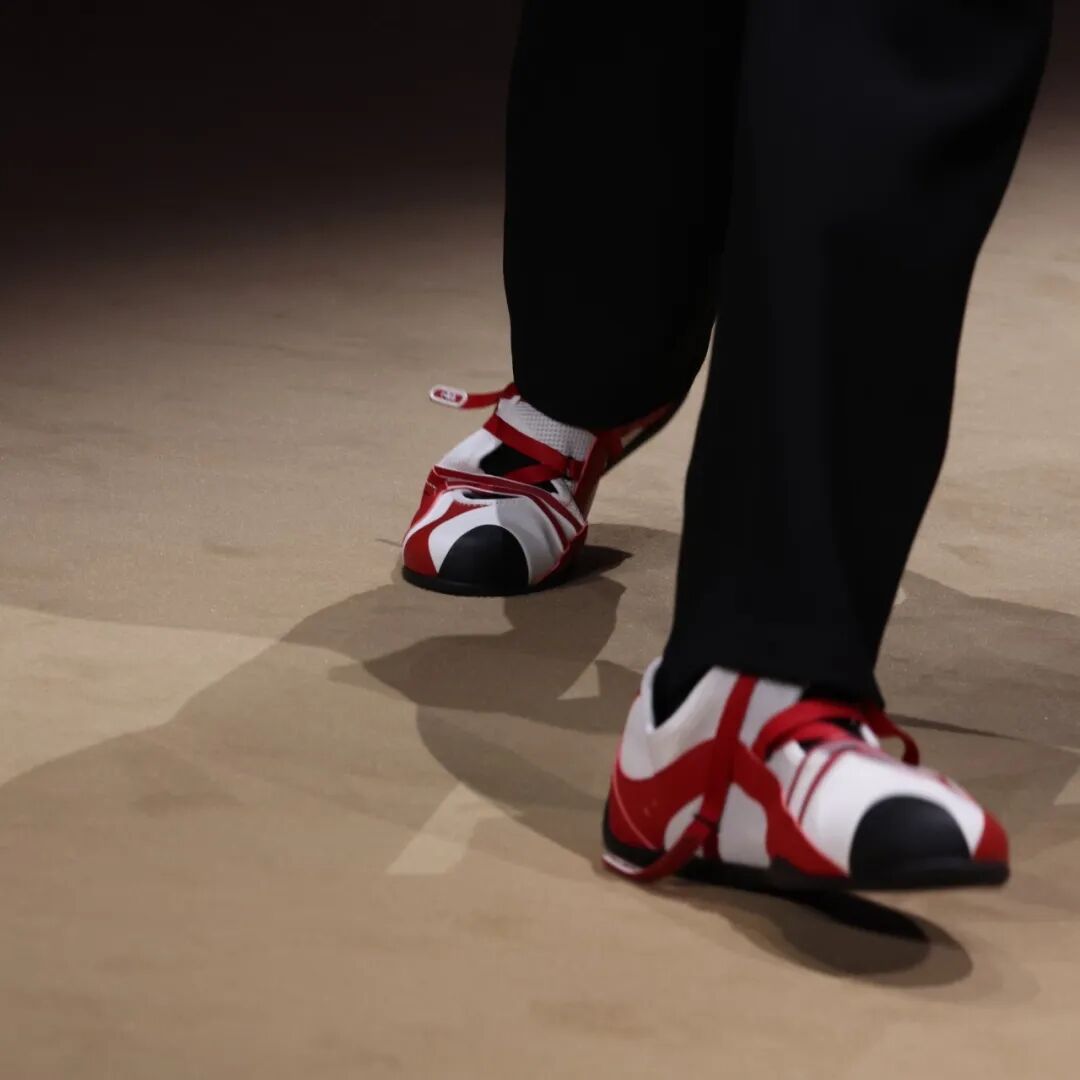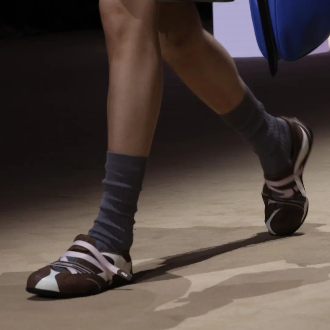 在整场秀中,最吸引人眼球的单品,则是一系列新款薄底鞋。品牌过去十年最成功的鞋款,大多属于厚底 “老爹鞋” 体系。而薄底鞋几乎是完全相反的方向:更修长、更轻盈、更克制。设计刻意避免夸张结构,通过比例、线条和材质建立辨识度。Nappa 皮革与反毛皮拼接,Vibram 超轻大底与 PORON 吸震科技隐藏在极简轮廓之下。 视觉上,它更接近意大利 70 年代网球鞋,只是气质更现代——理性、安静,带着明显的都市优雅。