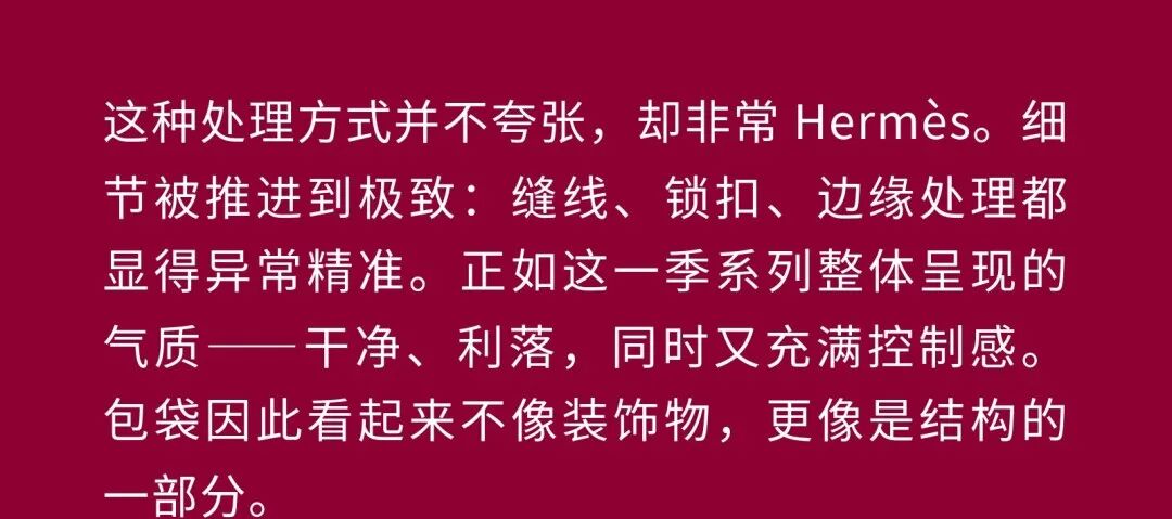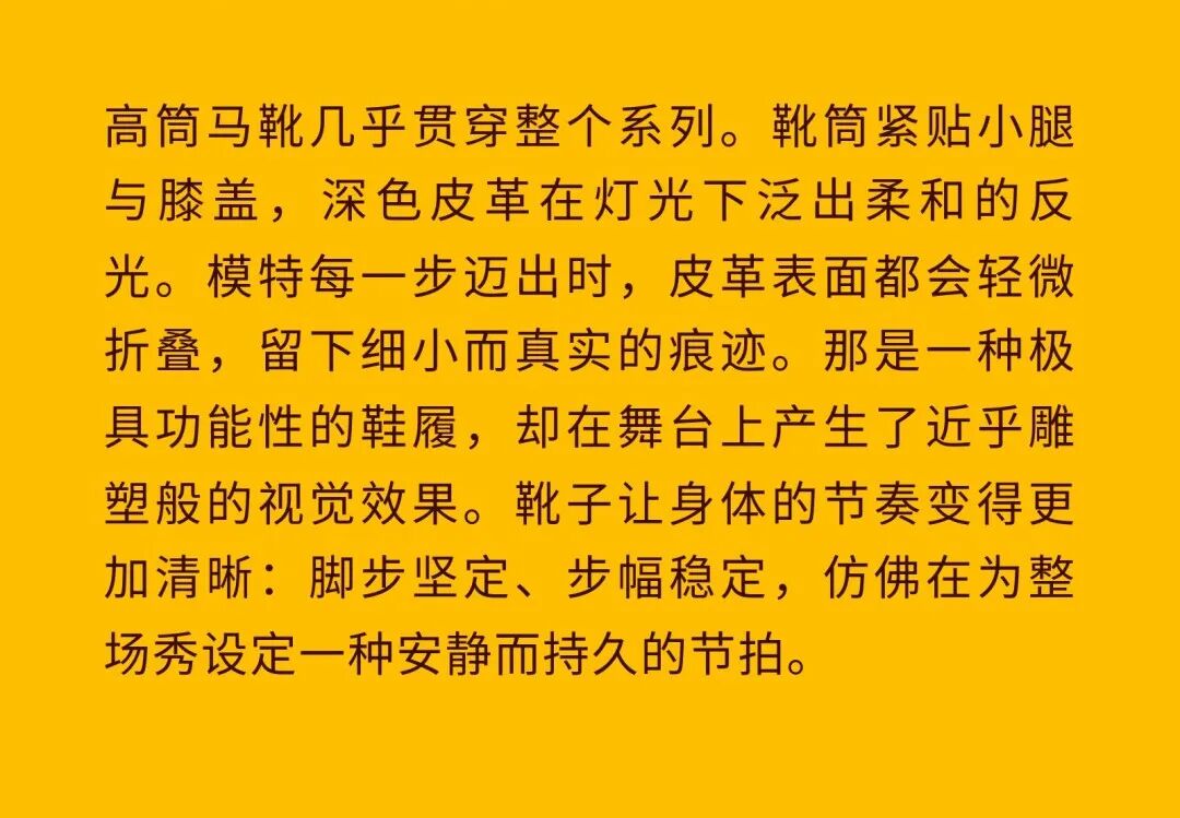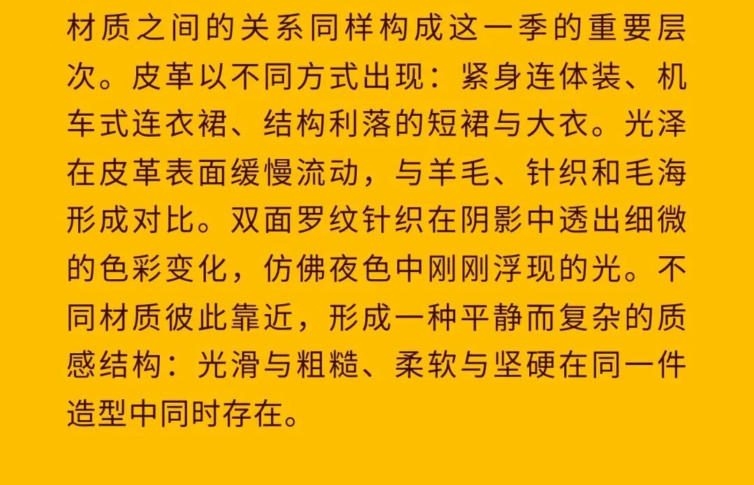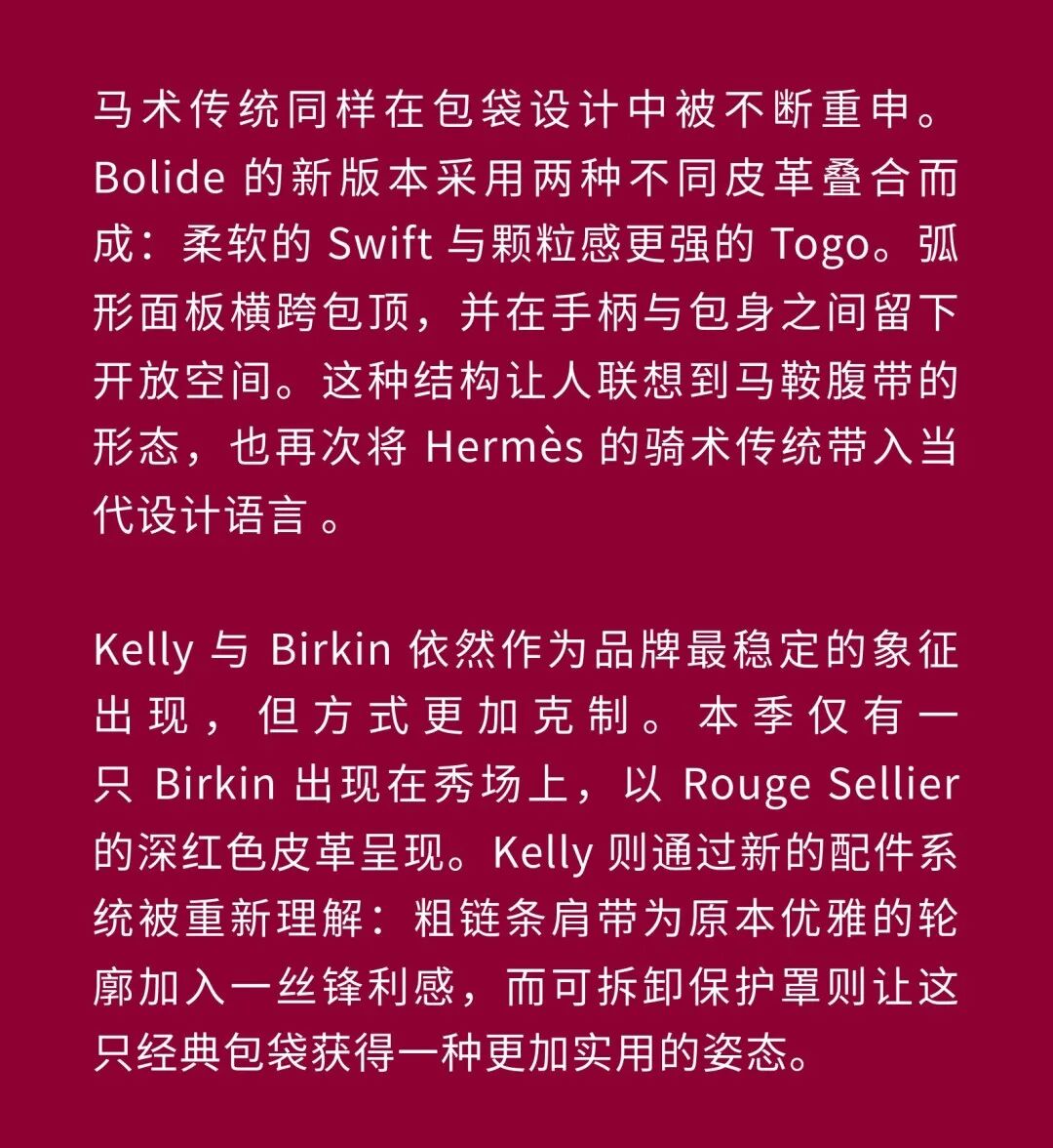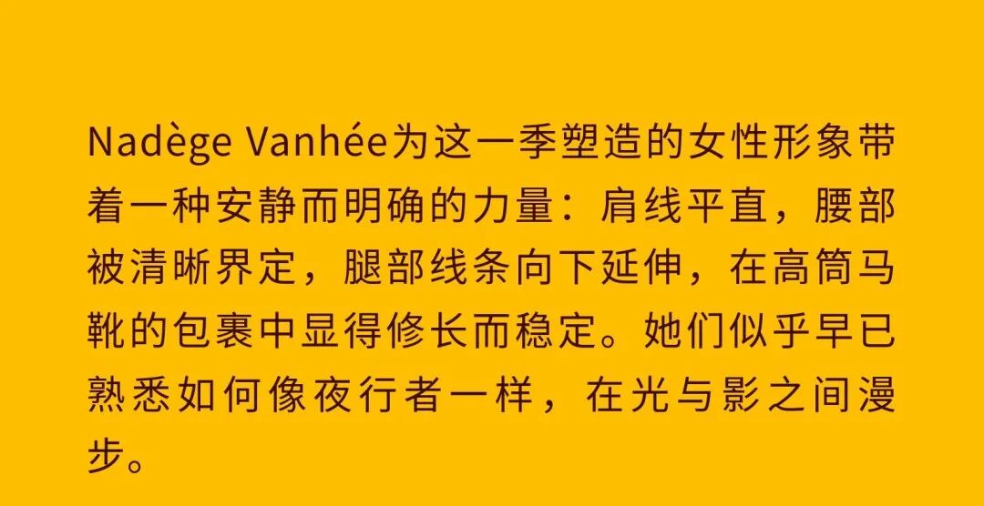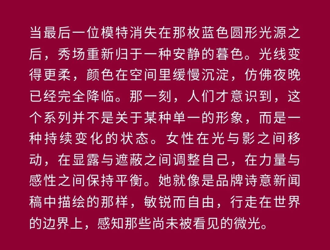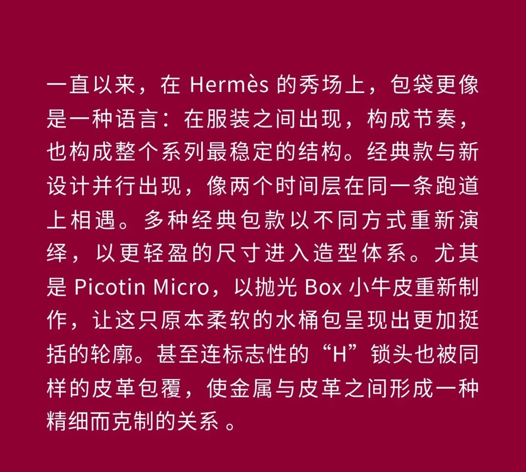 导语:本季,Nadège Vanhée-Cybulski 将秀场带入一个介于白昼与夜晚之间的时刻——黄昏。那是一段边界开始松动的时间:光仍然存在,影子却已经升起,熟悉的世界在微妙变化中被重新描绘。围绕这一“临界之境”,她构建了一种新的女性形象:力量与感性并行,显露与遮蔽同时存在。 在共和国卫队总部深处,空间被一层幽蓝色光线缓缓点亮。那光束接近傍晚空气残留的冷色——白昼尚未完全退场,夜晚却已经逼近。跑道在观众席之间盘旋延伸,像一条在地表缓慢展开的路径,最终通向远处的圆形开口:一枚悬浮在黑暗中的“月”。当模特从那道光晕中走出时,仿佛从另一种时间抵达。整个空间因此处在一种不稳定的状态:不是夜晚,却已经离白天很远。 这一季的情绪被 Hermès 描述为一种“临界之境”。那是一段边界逐渐松动的时间:黄昏悬停在空气中,天空与地面之间的界线慢慢变得模糊,熟悉的世界仿佛被重新描绘。创意总监Nadège Vanhée-Cybulski 将整场秀安放在这样一个“时间带”——光尚未消失,影子却已经悄然升起。随着视线逐渐适应这种半明半暗的状态,感知也被重新调动:颜色被夜色轻轻压低,轮廓在暗处反而显得更加清晰。 1、黄昏的临界之境 “并行”成为贯穿整个系列的关键词。舞台本身几乎就是这一概念的物理化:蓝光与暗影并置,人工结构与自然地貌相互叠合。跑道两侧铺陈着苔藓与植物的微型地景,绿色在灯光下显得潮湿而安静,像夜晚即将降临的森林。模特沿着蜿蜒路径行走,身体的节奏与空间的弧线彼此呼应。 这种“并行关系”并不只存在于舞台结构之中。黄昏本身就意味着两种秩序的同时存在:落日的余辉尚未完全消散,冷月的光却已经升起。暖色逐渐沉入暗处,冷色在空气中浮现。夜色在日落与月光之间不断转换。因此,在这片蓝色舞台上,皮革表面反射出锋利的光泽,羊毛织物则在阴影里显得柔软而深邃。观众的视线被引导去观察这些细节——一条线条的弧度、一件外套边缘掠过的光、或是一双马靴短暂闪现的反光。 Nadège Vanhée 对这种临界时刻显然着迷。黄昏并不属于某个稳定的时间点,它更像一种持续变化的状态:当白昼尚未完全退场,夜晚却已经开始占据空气,日常秩序在这一刻短暂松动,身体与环境之间的关系也被重新感知。秀场的氛围因此隐约唤起赫卡忒(Hekate)的神话意象——那位手持火炬、守望十字路口的女神。 在古老的叙事中,她总是出现在边界之上:昼与夜、生与死、已知与未知之间的交界处。这样的象征为整个系列增添了一层微妙的意味——女性更像处在一种持续移动的状态,清醒、独立,也拥有在不同世界之间自由穿行的能力。 2、在显露与遮蔽之间 Nadège Vanhée为这一季塑造的女性形象带着一种安静而明确的力量:肩线平直,腰部被清晰界定,腿部线条向下延伸,在高筒马靴的包裹中显得修长而稳定。她们似乎早已熟悉如何像夜行者一样,在光与影之间漫步。 性感在这里以一种极其克制的方式浮现。皮肤偶尔在轮廓之间闪现——裙摆开衩处的一瞬、拉链开启时露出的衬衫、或是短裙与长靴之间留下的一小段肌肤。衣服围绕身体构建出一种精确的结构,感性被安置在秩序之中,却始终保持自由的呼吸。这种张力贯穿整个系列:身体被描绘得清晰而坚定,同时保留着一种难以捉摸的距离。 结构在这一季显得尤为重要。A 字轮廓在腰部向外展开,线条干净而锋利;骑马裤在臀部形成饱满的弧线,然后在膝下收紧,与高筒靴自然衔接。骑术传统在这里成为身体语言的一部分。线条利落得几乎像是鞭子挥过一样,带着运动的节奏。 高筒马靴几乎贯穿整个系列。靴筒紧贴小腿与膝盖,深色皮革在灯光下泛出柔和的反光。模特每一步迈出时,皮革表面都会轻微折叠,留下细小而真实的痕迹。那是一种极具功能性的鞋履,却在舞台上产生了近乎雕塑般的视觉效果。靴子让身体的节奏变得更加清晰:脚步坚定、步幅稳定,仿佛在为整场秀设定一种安静而持久的节拍。 材质之间的关系同样构成这一季的重要层次。皮革以不同方式出现:紧身连体装、机车式连衣裙、结构利落的短裙与大衣。光泽在皮革表面缓慢流动,与羊毛、针织和毛海形成对比。双面罗纹针织在阴影中透出细微的色彩变化,仿佛夜色中刚刚浮现的光。不同材质彼此靠近,形成一种平静而复杂的质感结构:光滑与粗糙、柔软与坚硬在同一件造型中同时存在。 颜色延续着黄昏的叙事。酒红色在皮革表面显得深邃而温暖,森林绿在蓝光中逐渐沉入阴影,午夜蓝则带着一种几乎接近黑色的深度。偶尔出现的硫黄色像一缕仍未消散的落日余辉,在整体冷色调中留下短暂的亮度。色彩在日落与月光之间缓慢过渡,夜色因此呈现出丰富而复杂的层次。 在这样的结构、材质与色彩之中,女性形象逐渐清晰。身体并未被装饰成某种理想化的形态,而是在服装中获得一种稳定而真实的存在感。腰带轻轻束住腰部,外套在肩线处形成坚定的轮廓,短裙与骑马裤让腿部线条显得直接而明确。衣服似乎在陪伴身体运动,而不是试图改变它。 3、关于物件打造的秩序 一直以来,在 Hermès 的秀场上,包袋更像是一种语言:在服装之间出现,构成节奏,也构成整个系列最稳定的结构。经典款与新设计并行出现,像两个时间层在同一条跑道上相遇。Picotin、Plume 与 Bolide 等熟悉的名字在这一季被重新缩小比例,
