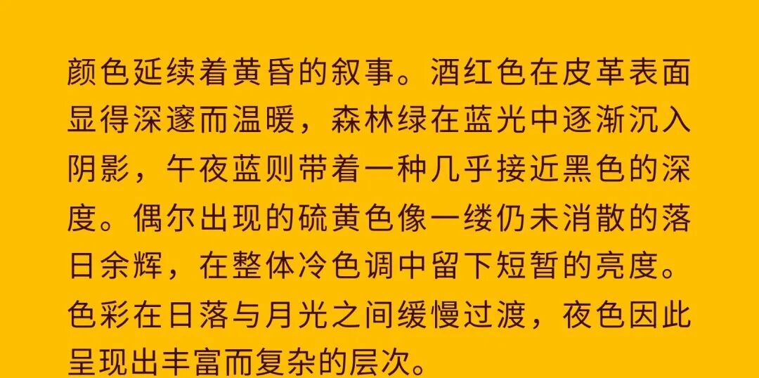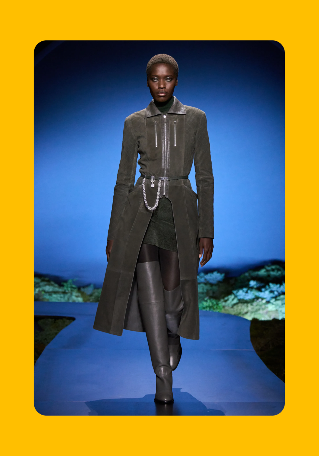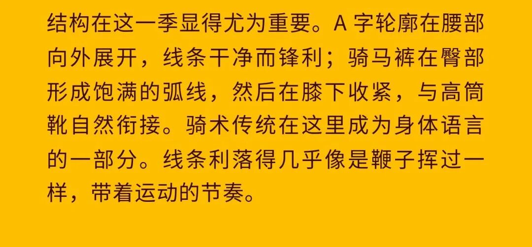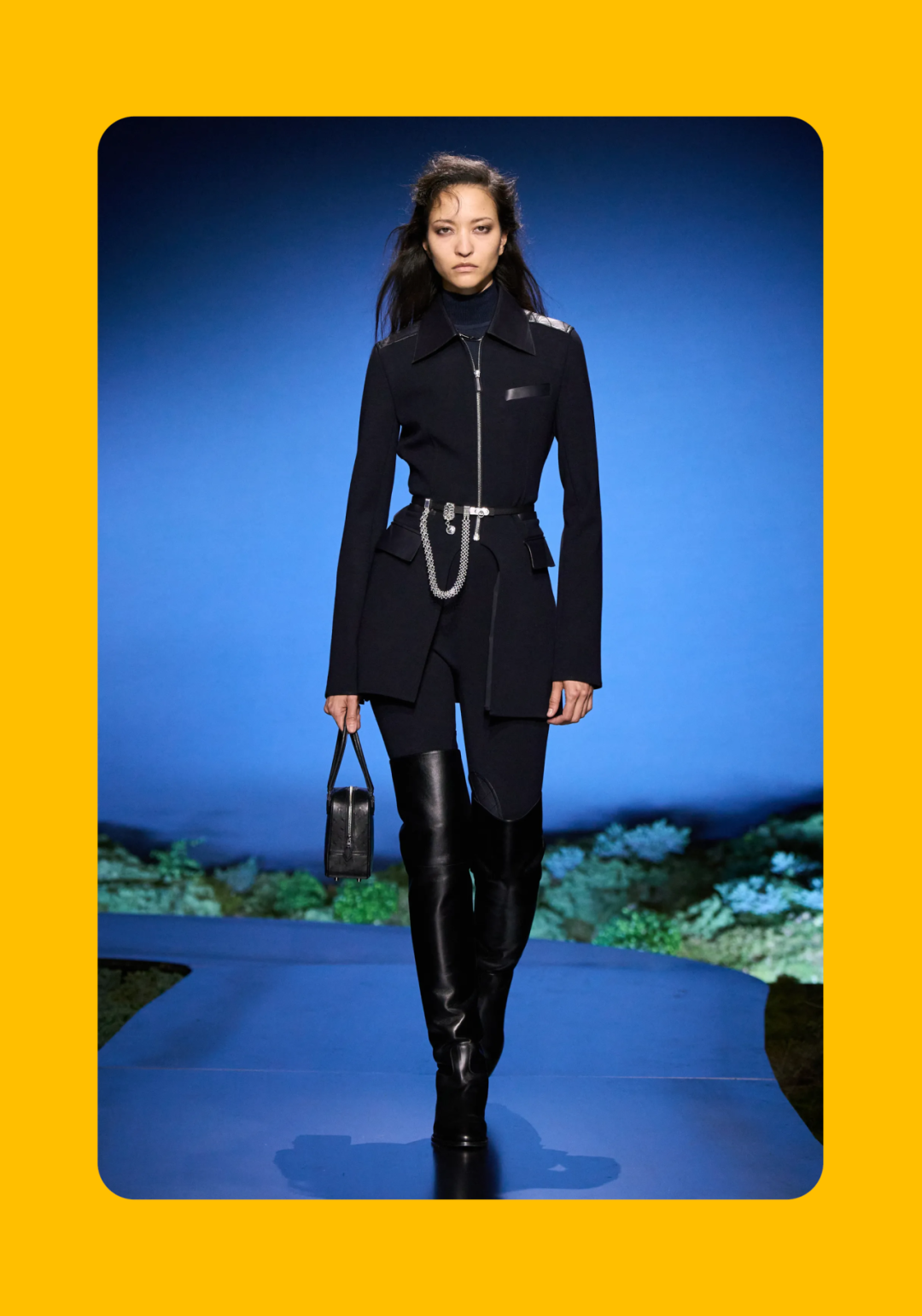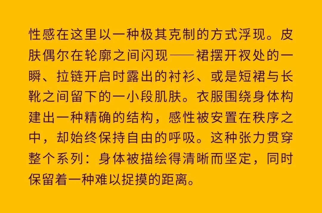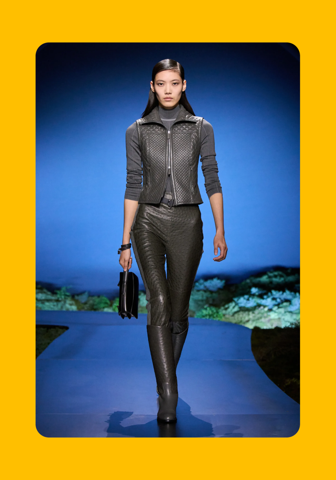 导语:本季,Nadège Vanhée-Cybulski 将秀场带入一个介于白昼与夜晚之间的时刻——黄昏。那是一段边界开始松动的时间:光仍然存在,影子却已经升起,熟悉的世界在微妙变化中被重新描绘。围绕这一“临界之境”,她构建了一种新的女性形象:力量与感性并行,显露与遮蔽同时存在。 在共和国卫队总部深处,空间被一层幽蓝色光线缓缓点亮。那光束接近傍晚空气残留的冷色——白昼尚未完全退场,夜晚却已经逼近。跑道在观众席之间盘旋延伸,像一条在地表缓慢展开的路径,最终通向远处的圆形开口:一枚悬浮在黑暗中的“月”。当模特从那道光晕中走出时,仿佛从另一种时间抵达。整个空间因此处在一种不稳定的状态:不是夜晚,却已经离白天很远。 这一季的情绪被 Hermès 描述为一种“临界之境”。那是一段边界逐渐松动的时间:黄昏悬停在空气中,天空与地面之间的界线慢慢变得模糊,熟悉的世界仿佛被重新描绘。创意总监Nadège Vanhée-Cybulski 将整场秀安放在这样一个“时间带”——光尚未消失,影子却已经悄然升起。随着视线逐渐适应这种半明半暗的状态,感知也被重新调动:颜色被夜色轻轻压低,轮廓在暗处反而显得更加清晰。 1、黄昏的临界之境 “并行”成为贯穿整个系列的关键词。舞台本身几乎就是这一概念的物理化:蓝光与暗影并置,人工结构与自然地貌相互叠合。跑道两侧铺陈着苔藓与植物的微型地景,绿色在灯光下显得潮湿而安静,像夜晚即将降临的森林。模特沿着蜿蜒路径行走,身体的节奏与空间的弧线彼此呼应。 这种“并行关系”并不只存在于舞台结构之中。黄昏本身就意味着两种秩序的同时存在:落日的余辉尚未完全消散,冷月的光却已经升起。暖色逐渐沉入暗处,冷色在空气中浮现。夜色在日落与月光之间不断转换。因此,在这片蓝色舞台上,皮革表面反射出锋利的光泽,羊毛织物则在阴影里显得柔软而深邃。观众的视线被引导去观察这些细节——一条线条的弧度、一件外套边缘掠过的光、或是一双马靴短暂闪现的反光。 Nadège Vanhée 对这种临界时刻显然着迷。黄昏并不属于某个稳定的时间点,它更像一种持续变化的状态:当白昼尚未完全退场,夜晚却已经开始占据空气,日常秩序在这一刻短暂松动,身体与环境之间的关系也被重新感知。秀场的氛围因此隐约唤起赫卡忒(Hekate)的神话意象——那位手持火炬、守望十字路口的女神。 在古老的叙事中,她总是出现在边界之上:昼与夜、生与死、已知与未知之间的交界处。这样的象征为整个系列增添了一层微妙的意味——女性更像处在一种持续移动的状态,清醒、独立,也拥有在不同世界之间自由穿行的能力。 2、在显露与遮蔽之间 Nadège Vanhée为这一季塑造的女性形象带着一种安静而明确的力量:肩线平直,腰部被清晰界定,腿部线条向下延伸,在高筒马靴的包裹中显得修长而稳定。她们似乎早已熟悉如何像夜行者一样,在光与影之间漫步。 性感在这里以一种极其克制的方式浮现。皮肤偶尔在轮廓之间闪现——裙摆开衩处的一瞬、拉链开启时露出的衬衫、或是短裙与长靴之间留下的一小段肌肤。衣服围绕身体构建出一种精确的结构,感性被安置在秩序之中,却始终保持自由的呼吸。这种张力贯穿整个系列:身体被描绘得清晰而坚定,同时保留着一种难以捉摸的距离。 结构在这一季显得尤为重要。A 字轮廓在腰部向外展开,线条干净而锋利;骑马裤在臀部形成饱满的弧线,然后在膝下收紧,与高筒靴自然衔接。骑术传统在这里成为身体语言的一部分。线条利落得几乎像是鞭子挥过一样,带着运动的节奏。 高筒马靴几乎贯穿整个系列。靴筒紧贴小腿与膝盖,深色皮革在灯光下泛出柔和的反光。模特每一步迈出时,皮革表面都会轻微折叠,留下细小而真实的痕迹。那是一种极具功能性的鞋履,却在舞台上产生了近乎雕塑般的视觉效果。靴子让身体的节奏变得更加清晰:脚步坚定、步幅稳定,仿佛在为整场秀设定一种安静而持久的节拍。 材质之间的关系同样构成这一季的重要层次。皮革以不同方式出现:紧身连体装、机车式连衣裙、结构利落的短裙与大衣。光泽在皮革表面缓慢流动,与羊毛、针织和毛海形成对比。双面罗纹针织在阴影中透出细微的色彩变化,仿佛夜色中刚刚浮现的光。不同材质彼此靠近,形成一种平静而复杂的质感结构:光滑与粗糙、柔软与坚硬在同一件造型中同时存在。 颜色延续着黄昏的叙事。酒红色在皮革表面显得深邃而温暖,森林绿在蓝光中逐渐沉入阴影,午夜蓝则带着一种几乎接近黑色的深度。偶尔出现的硫黄色像一缕仍未消散的落日余辉,在整体冷色调中留下短暂的亮度。色彩在日落与月光之间缓慢过渡,夜色因此呈现出丰富而复杂的层次。 在这样的结构、材质与色彩之中,女性形象逐渐清晰。身体并未被装饰成某种理想化的形态,而是在服装中获得一种稳定而真实的存在感。腰带轻轻束住腰部,外套在肩线处形成坚定的轮廓,短裙与骑马裤让腿部线条显得直接而明确。衣服似乎在陪伴身体运动,而不是试图改变它。 3、关于物件打造的秩序 一直以来,在 Hermès 的秀场上,包袋更像是一种语言:在服装之间出现,构成节奏,也构成整个系列最稳定的结构。经典款与新设计并行出现,像两个时间层在同一条跑道上相遇。Picotin、Plume 与 Bolide 等熟悉的名字在这一季被重新缩小比例,