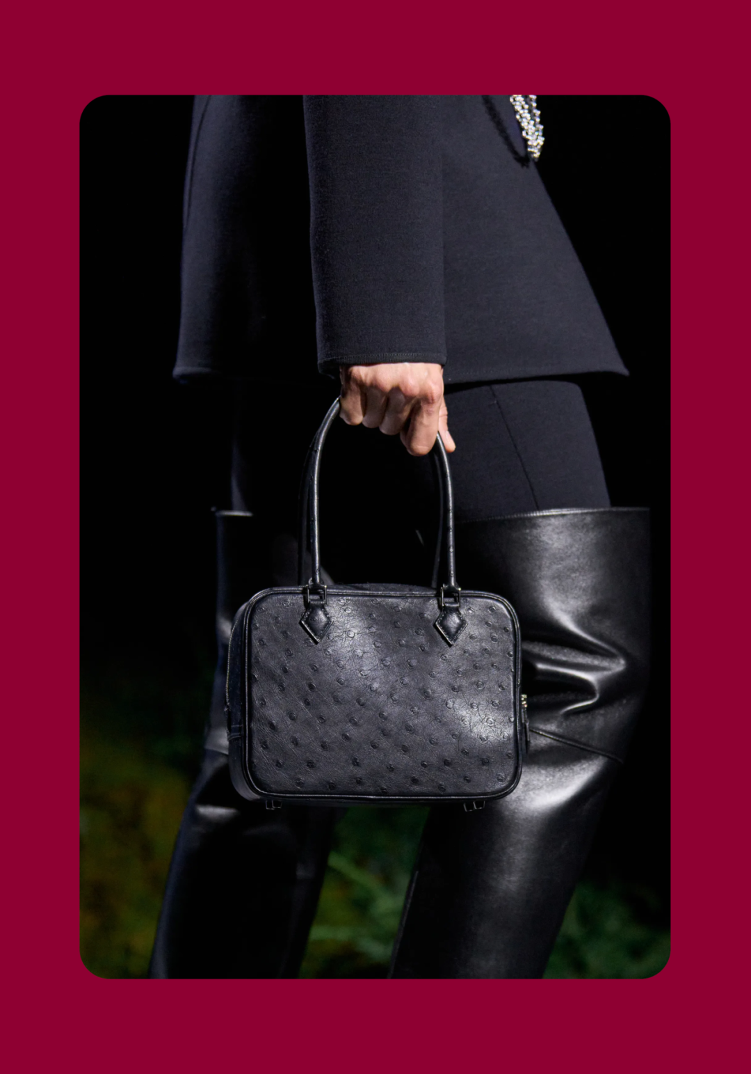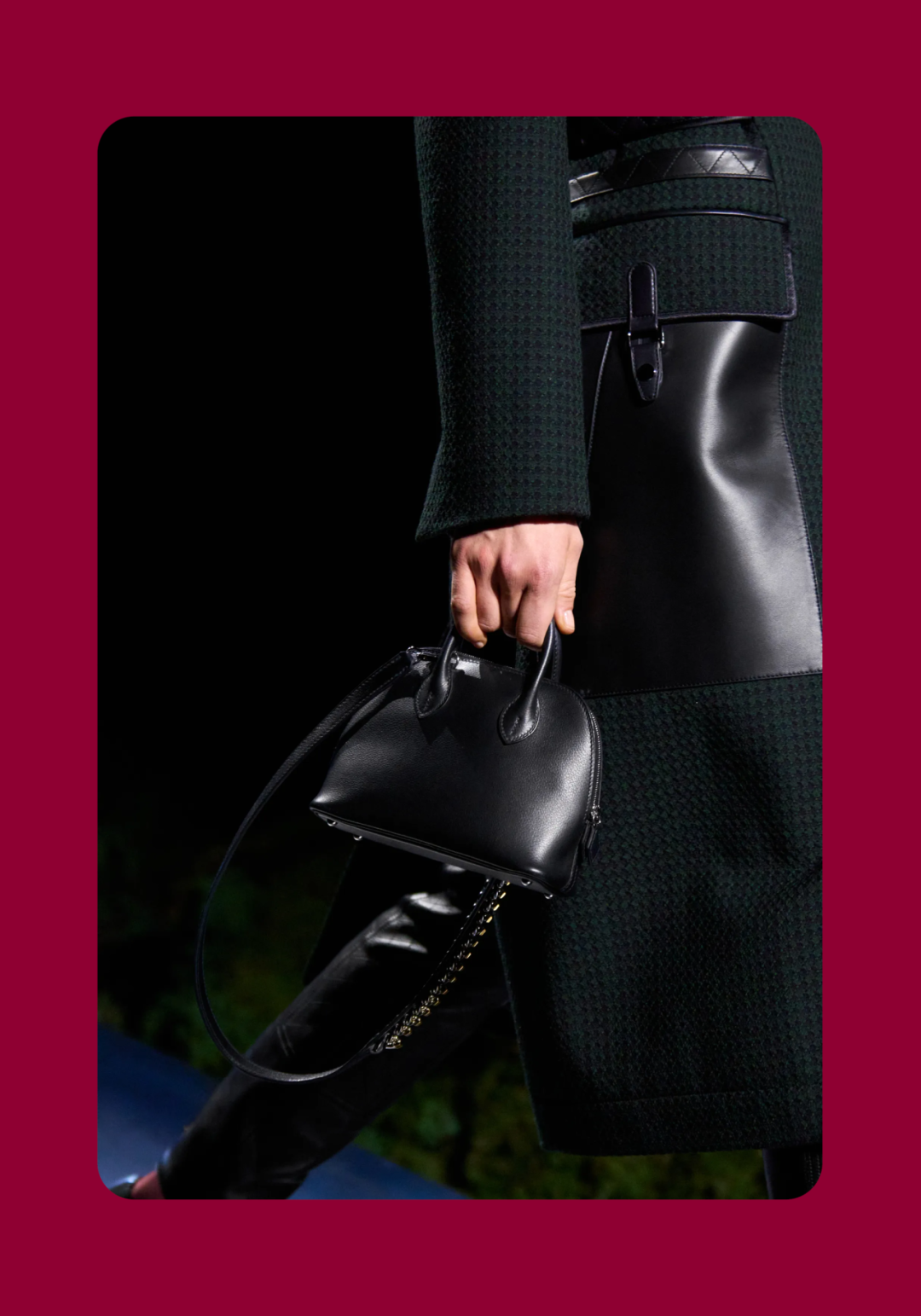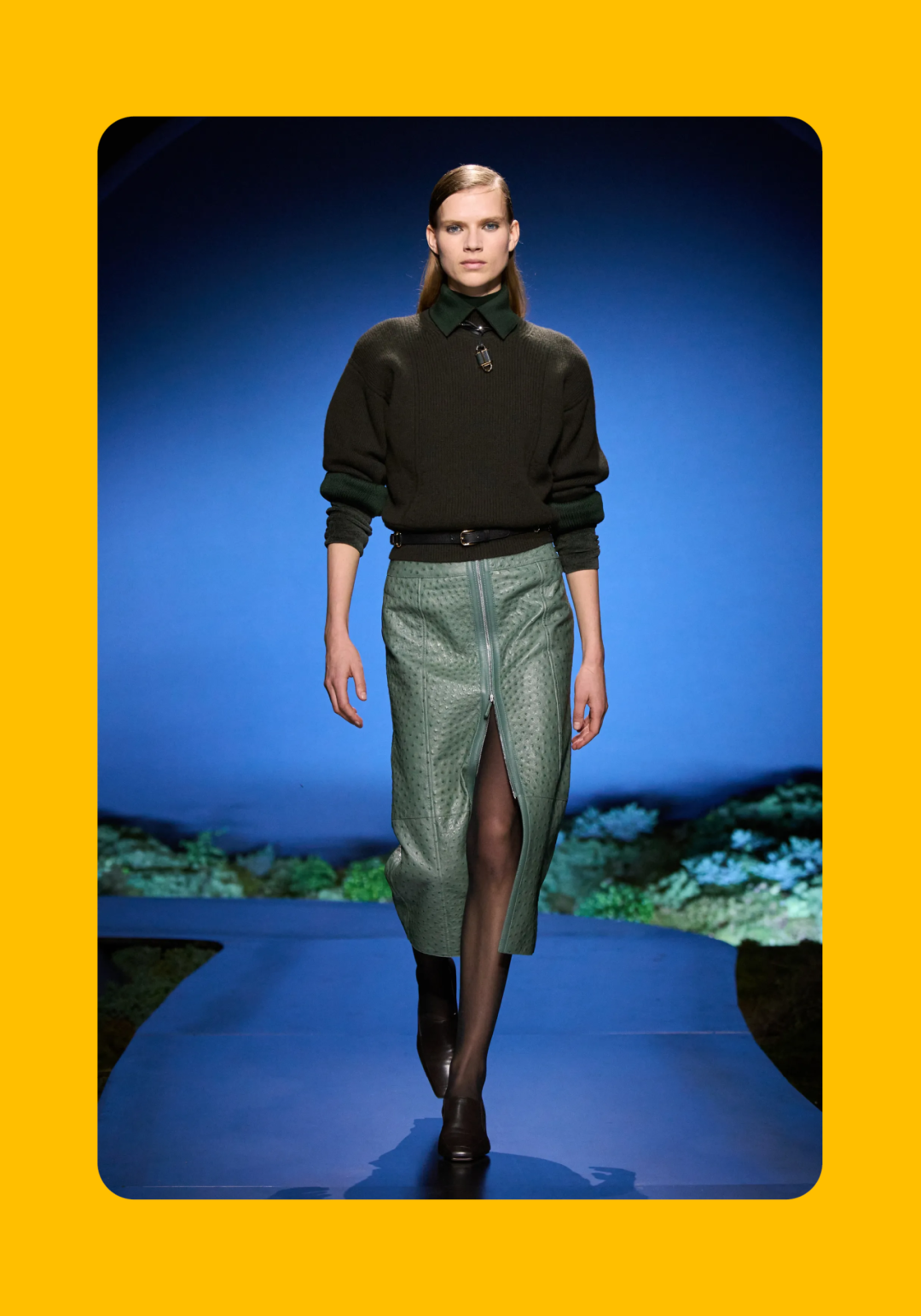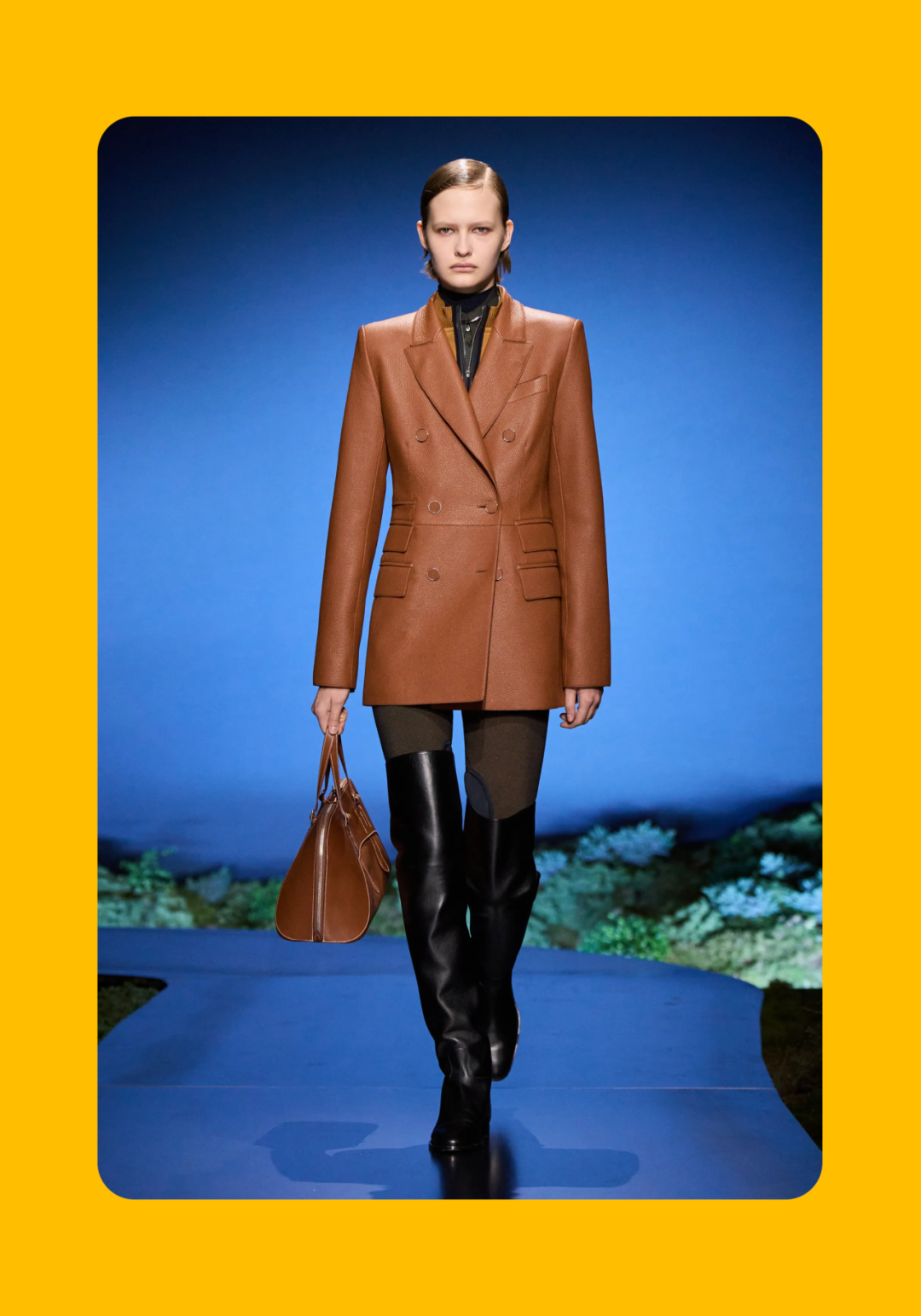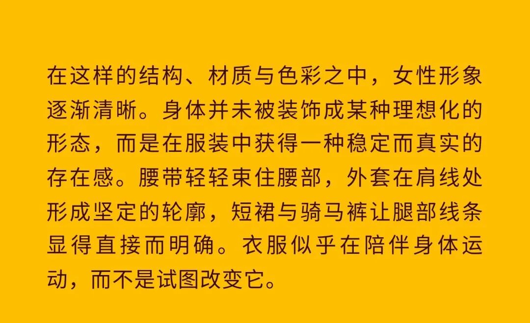 导语:本季,Nadège Vanhée-Cybulski 将秀场带入一个介于白昼与夜晚之间的时刻——黄昏。那是一段边界开始松动的时间:光仍然存在,影子却已经升起,熟悉的世界在微妙变化中被重新描绘。围绕这一“临界之境”,她构建了一种新的女性形象:力量与感性并行,显露与遮蔽同时存在。 在共和国卫队总部深处,空间被一层幽蓝色光线缓缓点亮。那光束接近傍晚空气残留的冷色——白昼尚未完全退场,夜晚却已经逼近。跑道在观众席之间盘旋延伸,像一条在地表缓慢展开的路径,最终通向远处的圆形开口:一枚悬浮在黑暗中的“月”。当模特从那道光晕中走出时,仿佛从另一种时间抵达。整个空间因此处在一种不稳定的状态:不是夜晚,却已经离白天很远。 这一季的情绪被 Hermès 描述为一种“临界之境”。那是一段边界逐渐松动的时间:黄昏悬停在空气中,天空与地面之间的界线慢慢变得模糊,熟悉的世界仿佛被重新描绘。创意总监Nadège Vanhée-Cybulski 将整场秀安放在这样一个“时间带”——光尚未消失,影子却已经悄然升起。随着视线逐渐适应这种半明半暗的状态,感知也被重新调动:颜色被夜色轻轻压低,轮廓在暗处反而显得更加清晰。 1、黄昏的临界之境 “并行”成为贯穿整个系列的关键词。舞台本身几乎就是这一概念的物理化:蓝光与暗影并置,人工结构与自然地貌相互叠合。跑道两侧铺陈着苔藓与植物的微型地景,绿色在灯光下显得潮湿而安静,像夜晚即将降临的森林。模特沿着蜿蜒路径行走,身体的节奏与空间的弧线彼此呼应。 这种“并行关系”并不只存在于舞台结构之中。黄昏本身就意味着两种秩序的同时存在:落日的余辉尚未完全消散,冷月的光却已经升起。暖色逐渐沉入暗处,冷色在空气中浮现。夜色在日落与月光之间不断转换。因此,在这片蓝色舞台上,皮革表面反射出锋利的光泽,羊毛织物则在阴影里显得柔软而深邃。观众的视线被引导去观察这些细节——一条线条的弧度、一件外套边缘掠过的光、或是一双马靴短暂闪现的反光。 Nadège Vanhée 对这种临界时刻显然着迷。黄昏并不属于某个稳定的时间点,它更像一种持续变化的状态:当白昼尚未完全退场,夜晚却已经开始占据空气,日常秩序在这一刻短暂松动,身体与环境之间的关系也被重新感知。秀场的氛围因此隐约唤起赫卡忒(Hekate)的神话意象——那位手持火炬、守望十字路口的女神。 在古老的叙事中,她总是出现在边界之上:昼与夜、生与死、已知与未知之间的交界处。这样的象征为整个系列增添了一层微妙的意味——女性更像处在一种持续移动的状态,清醒、独立,也拥有在不同世界之间自由穿行的能力。 2、在显露与遮蔽之间 Nadège Vanhée为这一季塑造的女性形象带着一种安静而明确的力量:肩线平直,腰部被清晰界定,腿部线条向下延伸,在高筒马靴的包裹中显得修长而稳定。她们似乎早已熟悉如何像夜行者一样,在光与影之间漫步。 性感在这里以一种极其克制的方式浮现。皮肤偶尔在轮廓之间闪现——裙摆开衩处的一瞬、拉链开启时露出的衬衫、或是短裙与长靴之间留下的一小段肌肤。衣服围绕身体构建出一种精确的结构,感性被安置在秩序之中,却始终保持自由的呼吸。这种张力贯穿整个系列:身体被描绘得清晰而坚定,同时保留着一种难以捉摸的距离。 结构在这一季显得尤为重要。A 字轮廓在腰部向外展开,线条干净而锋利;骑马裤在臀部形成饱满的弧线,然后在膝下收紧,与高筒靴自然衔接。骑术传统在这里成为身体语言的一部分。线条利落得几乎像是鞭子挥过一样,带着运动的节奏。 高筒马靴几乎贯穿整个系列。靴筒紧贴小腿与膝盖,深色皮革在灯光下泛出柔和的反光。模特每一步迈出时,皮革表面都会轻微折叠,留下细小而真实的痕迹。那是一种极具功能性的鞋履,却在舞台上产生了近乎雕塑般的视觉效果。靴子让身体的节奏变得更加清晰:脚步坚定、步幅稳定,仿佛在为整场秀设定一种安静而持久的节拍。 材质之间的关系同样构成这一季的重要层次。皮革以不同方式出现:紧身连体装、机车式连衣裙、结构利落的短裙与大衣。光泽在皮革表面缓慢流动,与羊毛、针织和毛海形成对比。双面罗纹针织在阴影中透出细微的色彩变化,仿佛夜色中刚刚浮现的光。不同材质彼此靠近,形成一种平静而复杂的质感结构:光滑与粗糙、柔软与坚硬在同一件造型中同时存在。 颜色延续着黄昏的叙事。酒红色在皮革表面显得深邃而温暖,森林绿在蓝光中逐渐沉入阴影,午夜蓝则带着一种几乎接近黑色的深度。偶尔出现的硫黄色像一缕仍未消散的落日余辉,在整体冷色调中留下短暂的亮度。色彩在日落与月光之间缓慢过渡,夜色因此呈现出丰富而复杂的层次。 在这样的结构、材质与色彩之中,女性形象逐渐清晰。身体并未被装饰成某种理想化的形态,而是在服装中获得一种稳定而真实的存在感。腰带轻轻束住腰部,外套在肩线处形成坚定的轮廓,短裙与骑马裤让腿部线条显得直接而明确。衣服似乎在陪伴身体运动,而不是试图改变它。 3、关于物件打造的秩序 一直以来,在 Hermès 的秀场上,包袋更像是一种语言:在服装之间出现,构成节奏,也构成整个系列最稳定的结构。经典款与新设计并行出现,像两个时间层在同一条跑道上相遇。Picotin、Plume 与 Bolide 等熟悉的名字在这一季被重新缩小比例,