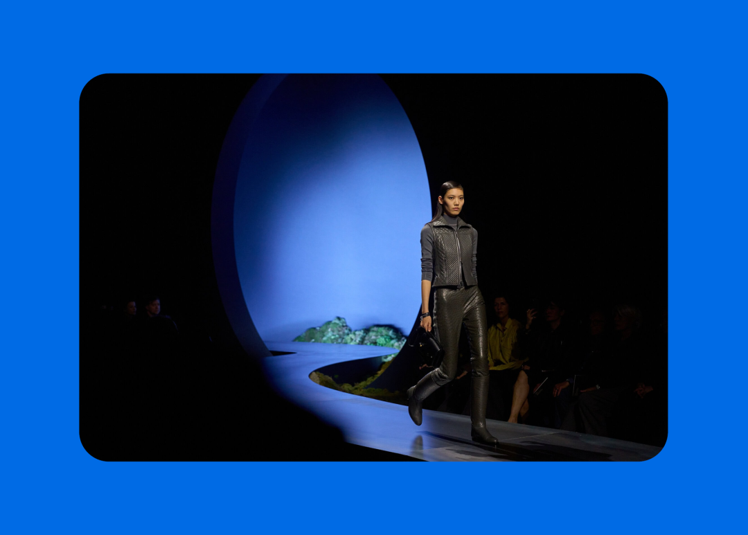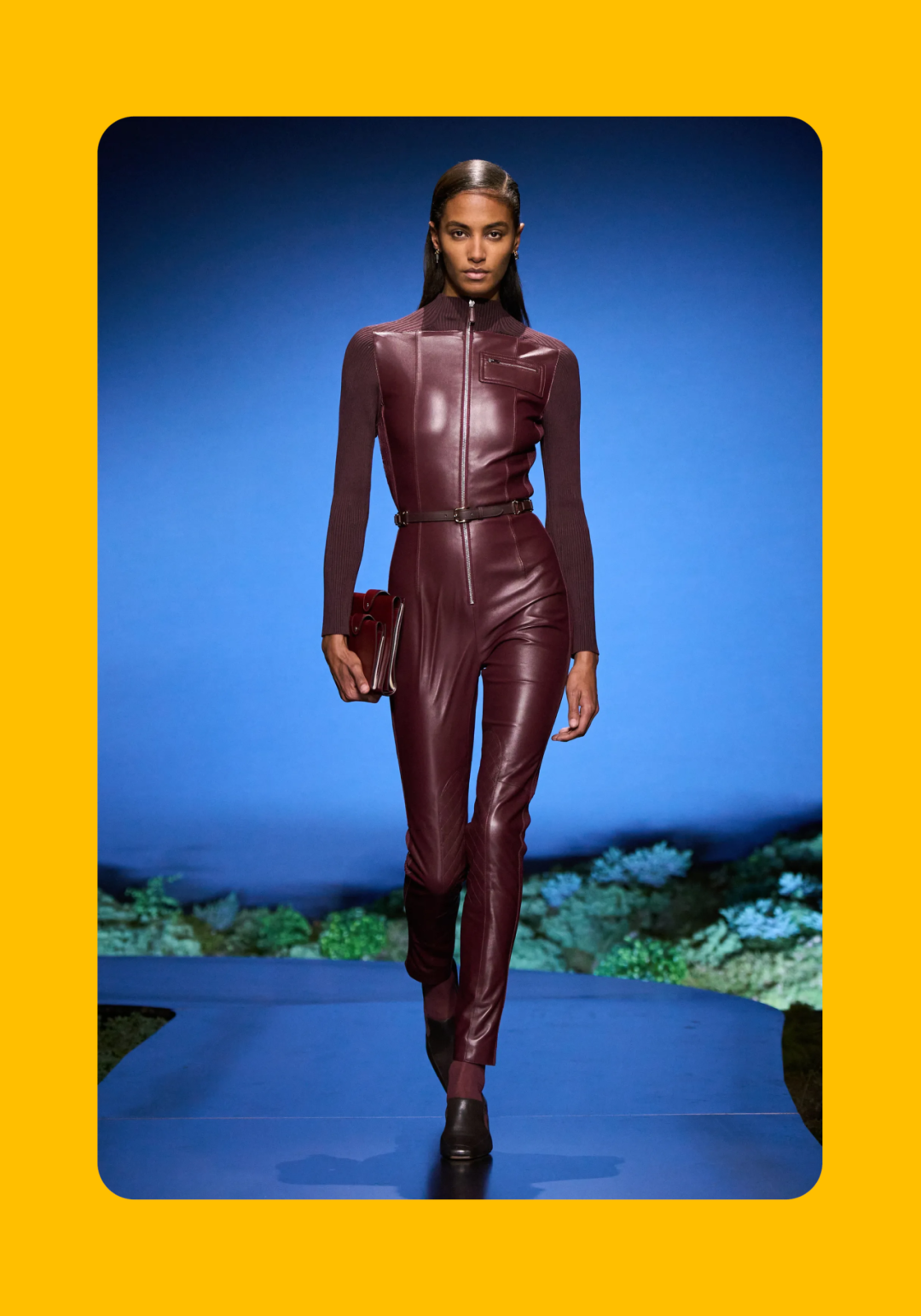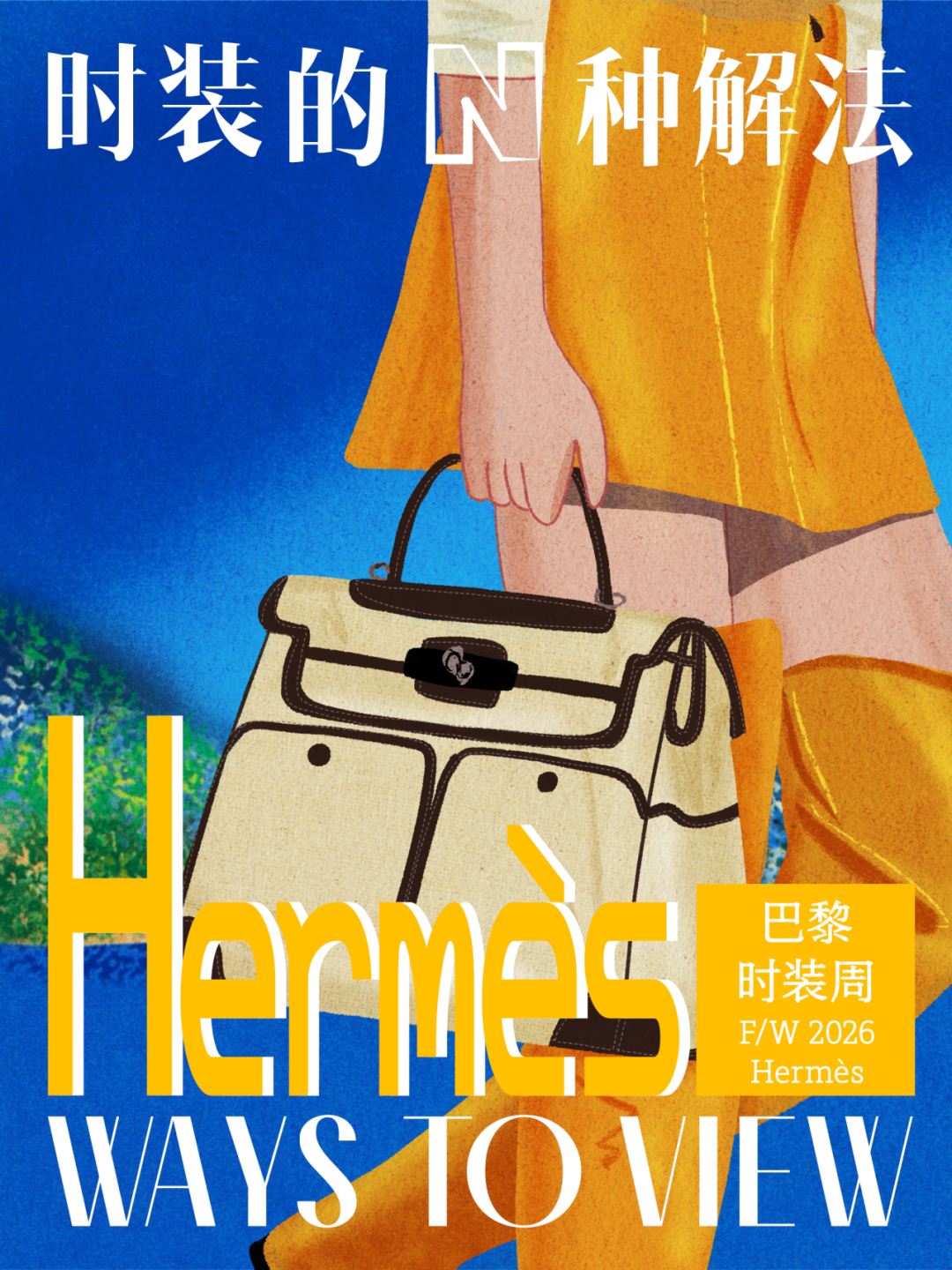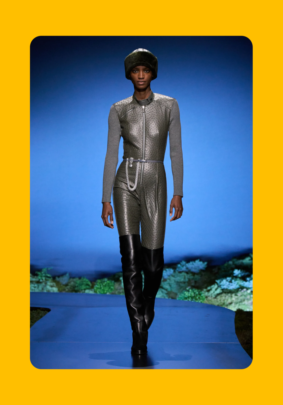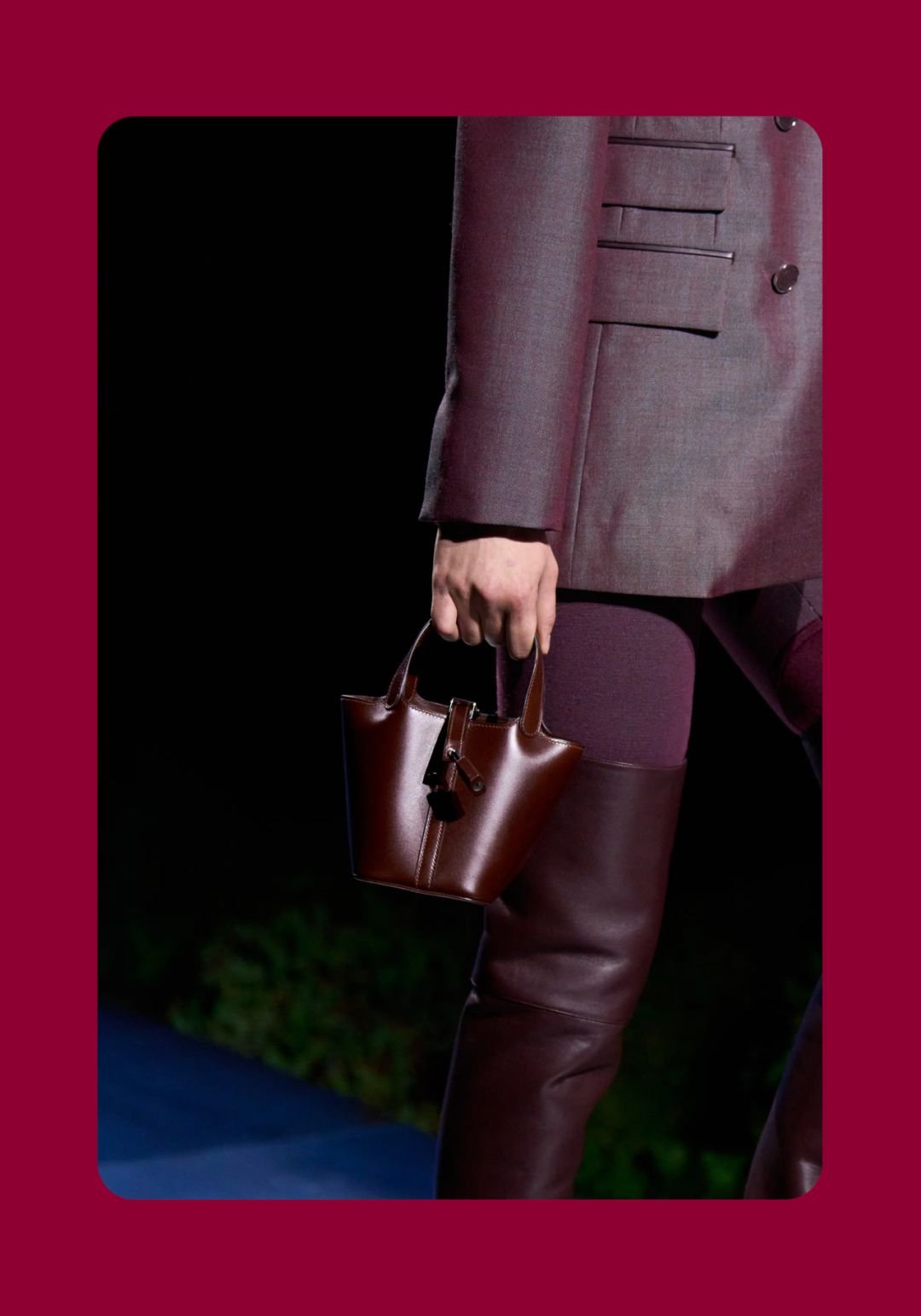 导语:本季,Nadège Vanhée-Cybulski 将秀场带入一个介于白昼与夜晚之间的时刻——黄昏。那是一段边界开始松动的时间:光仍然存在,影子却已经升起,熟悉的世界在微妙变化中被重新描绘。围绕这一“临界之境”,她构建了一种新的女性形象:力量与感性并行,显露与遮蔽同时存在。 在共和国卫队总部深处,空间被一层幽蓝色光线缓缓点亮。那光束接近傍晚空气残留的冷色——白昼尚未完全退场,夜晚却已经逼近。跑道在观众席之间盘旋延伸,像一条在地表缓慢展开的路径,最终通向远处的圆形开口:一枚悬浮在黑暗中的“月”。当模特从那道光晕中走出时,仿佛从另一种时间抵达。整个空间因此处在一种不稳定的状态:不是夜晚,却已经离白天很远。 这一季的情绪被 Hermès 描述为一种“临界之境”。那是一段边界逐渐松动的时间:黄昏悬停在空气中,天空与地面之间的界线慢慢变得模糊,熟悉的世界仿佛被重新描绘。创意总监Nadège Vanhée-Cybulski 将整场秀安放在这样一个“时间带”——光尚未消失,影子却已经悄然升起。随着视线逐渐适应这种半明半暗的状态,感知也被重新调动:颜色被夜色轻轻压低,轮廓在暗处反而显得更加清晰。 1、黄昏的临界之境 “并行”成为贯穿整个系列的关键词。舞台本身几乎就是这一概念的物理化:蓝光与暗影并置,人工结构与自然地貌相互叠合。跑道两侧铺陈着苔藓与植物的微型地景,绿色在灯光下显得潮湿而安静,像夜晚即将降临的森林。模特沿着蜿蜒路径行走,身体的节奏与空间的弧线彼此呼应。 这种“并行关系”并不只存在于舞台结构之中。黄昏本身就意味着两种秩序的同时存在:落日的余辉尚未完全消散,冷月的光却已经升起。暖色逐渐沉入暗处,冷色在空气中浮现。夜色在日落与月光之间不断转换。因此,在这片蓝色舞台上,皮革表面反射出锋利的光泽,羊毛织物则在阴影里显得柔软而深邃。观众的视线被引导去观察这些细节——一条线条的弧度、一件外套边缘掠过的光、或是一双马靴短暂闪现的反光。 Nadège Vanhée 对这种临界时刻显然着迷。黄昏并不属于某个稳定的时间点,它更像一种持续变化的状态:当白昼尚未完全退场,夜晚却已经开始占据空气,日常秩序在这一刻短暂松动,身体与环境之间的关系也被重新感知。秀场的氛围因此隐约唤起赫卡忒(Hekate)的神话意象——那位手持火炬、守望十字路口的女神。 在古老的叙事中,她总是出现在边界之上:昼与夜、生与死、已知与未知之间的交界处。这样的象征为整个系列增添了一层微妙的意味——女性更像处在一种持续移动的状态,清醒、独立,也拥有在不同世界之间自由穿行的能力。 2、在显露与遮蔽之间 Nadège Vanhée为这一季塑造的女性形象带着一种安静而明确的力量:肩线平直,腰部被清晰界定,腿部线条向下延伸,在高筒马靴的包裹中显得修长而稳定。她们似乎早已熟悉如何像夜行者一样,在光与影之间漫步。 性感在这里以一种极其克制的方式浮现。皮肤偶尔在轮廓之间闪现——裙摆开衩处的一瞬、拉链开启时露出的衬衫、或是短裙与长靴之间留下的一小段肌肤。衣服围绕身体构建出一种精确的结构,感性被安置在秩序之中,却始终保持自由的呼吸。这种张力贯穿整个系列:身体被描绘得清晰而坚定,同时保留着一种难以捉摸的距离。 结构在这一季显得尤为重要。A 字轮廓在腰部向外展开,线条干净而锋利;骑马裤在臀部形成饱满的弧线,然后在膝下收紧,与高筒靴自然衔接。骑术传统在这里成为身体语言的一部分。线条利落得几乎像是鞭子挥过一样,带着运动的节奏。 高筒马靴几乎贯穿整个系列。靴筒紧贴小腿与膝盖,深色皮革在灯光下泛出柔和的反光。模特每一步迈出时,皮革表面都会轻微折叠,留下细小而真实的痕迹。那是一种极具功能性的鞋履,却在舞台上产生了近乎雕塑般的视觉效果。靴子让身体的节奏变得更加清晰:脚步坚定、步幅稳定,仿佛在为整场秀设定一种安静而持久的节拍。 材质之间的关系同样构成这一季的重要层次。皮革以不同方式出现:紧身连体装、机车式连衣裙、结构利落的短裙与大衣。光泽在皮革表面缓慢流动,与羊毛、针织和毛海形成对比。双面罗纹针织在阴影中透出细微的色彩变化,仿佛夜色中刚刚浮现的光。不同材质彼此靠近,形成一种平静而复杂的质感结构:光滑与粗糙、柔软与坚硬在同一件造型中同时存在。 颜色延续着黄昏的叙事。酒红色在皮革表面显得深邃而温暖,森林绿在蓝光中逐渐沉入阴影,午夜蓝则带着一种几乎接近黑色的深度。偶尔出现的硫黄色像一缕仍未消散的落日余辉,在整体冷色调中留下短暂的亮度。色彩在日落与月光之间缓慢过渡,夜色因此呈现出丰富而复杂的层次。 在这样的结构、材质与色彩之中,女性形象逐渐清晰。身体并未被装饰成某种理想化的形态,而是在服装中获得一种稳定而真实的存在感。腰带轻轻束住腰部,外套在肩线处形成坚定的轮廓,短裙与骑马裤让腿部线条显得直接而明确。衣服似乎在陪伴身体运动,而不是试图改变它。 3、关于物件打造的秩序 一直以来,在 Hermès 的秀场上,包袋更像是一种语言:在服装之间出现,构成节奏,也构成整个系列最稳定的结构。经典款与新设计并行出现,像两个时间层在同一条跑道上相遇。Picotin、Plume 与 Bolide 等熟悉的名字在这一季被重新缩小比例,