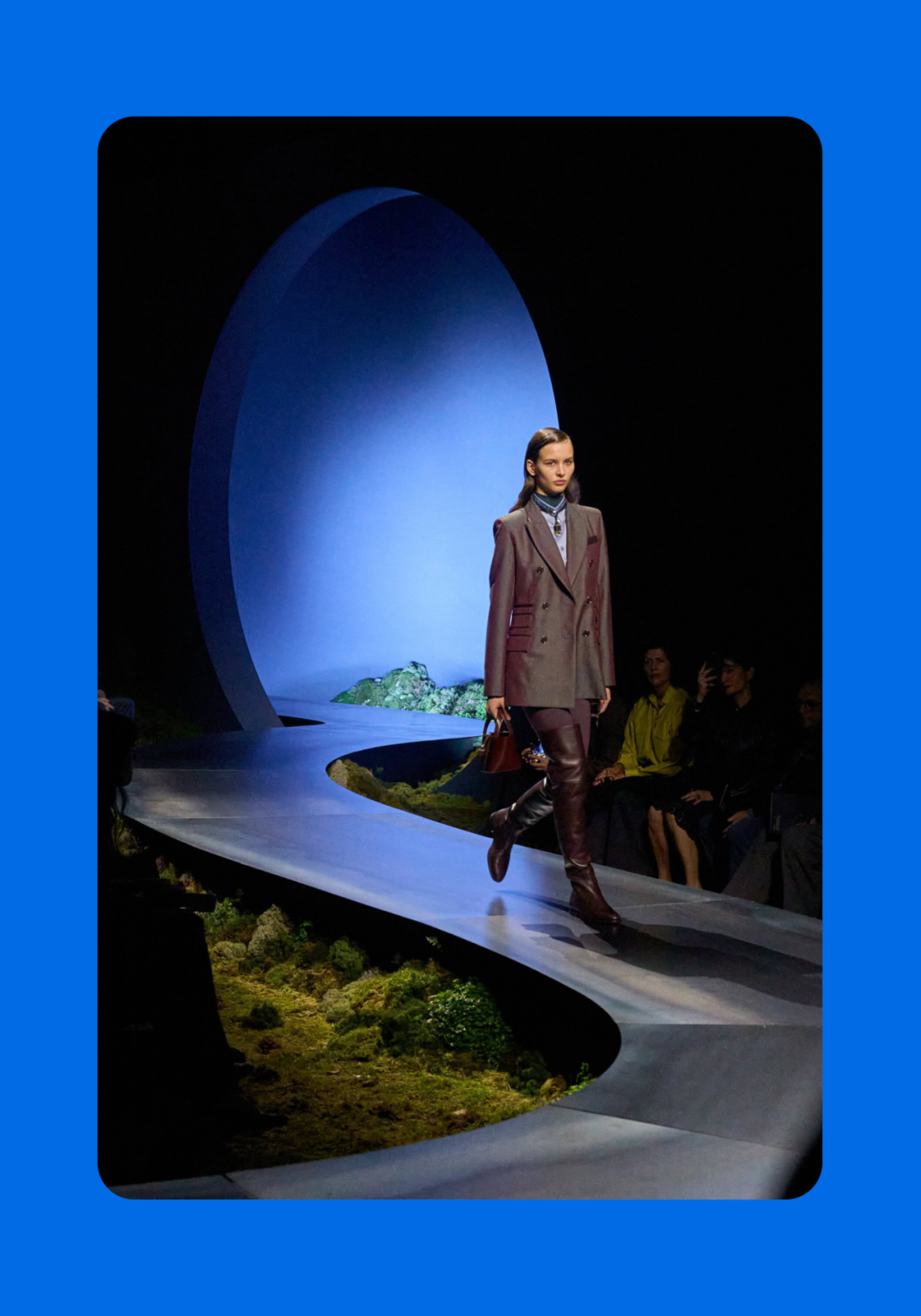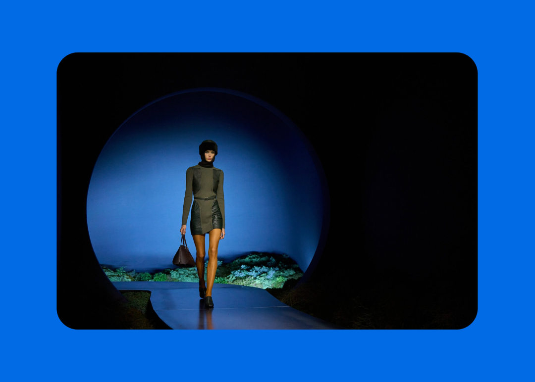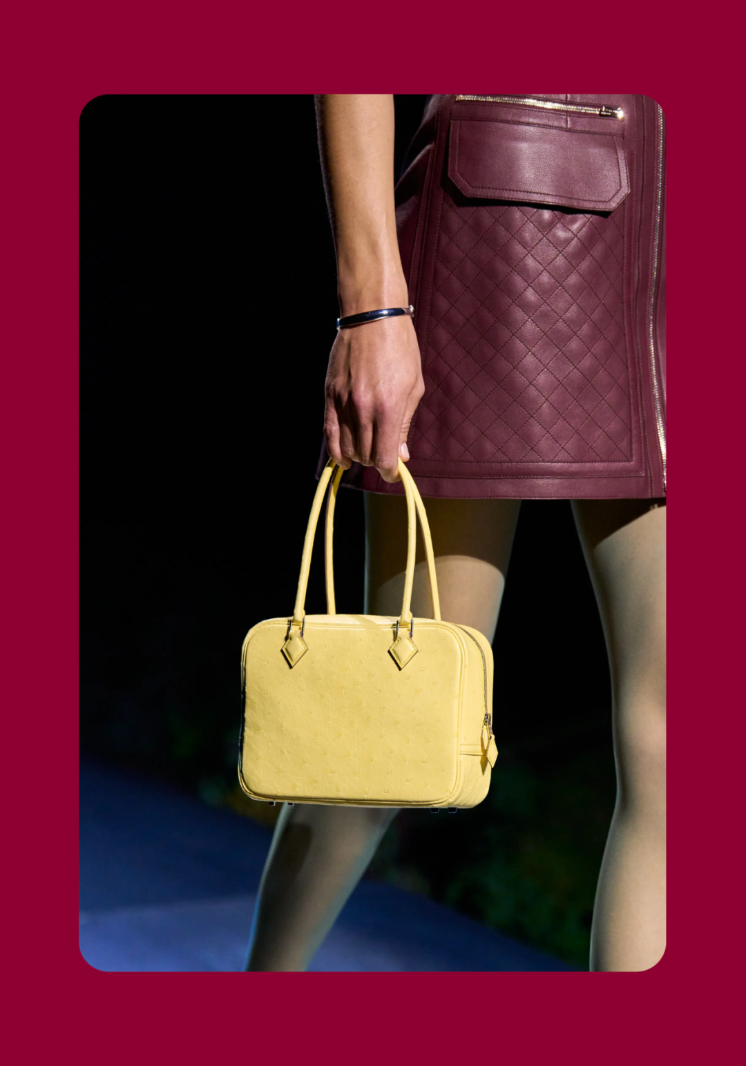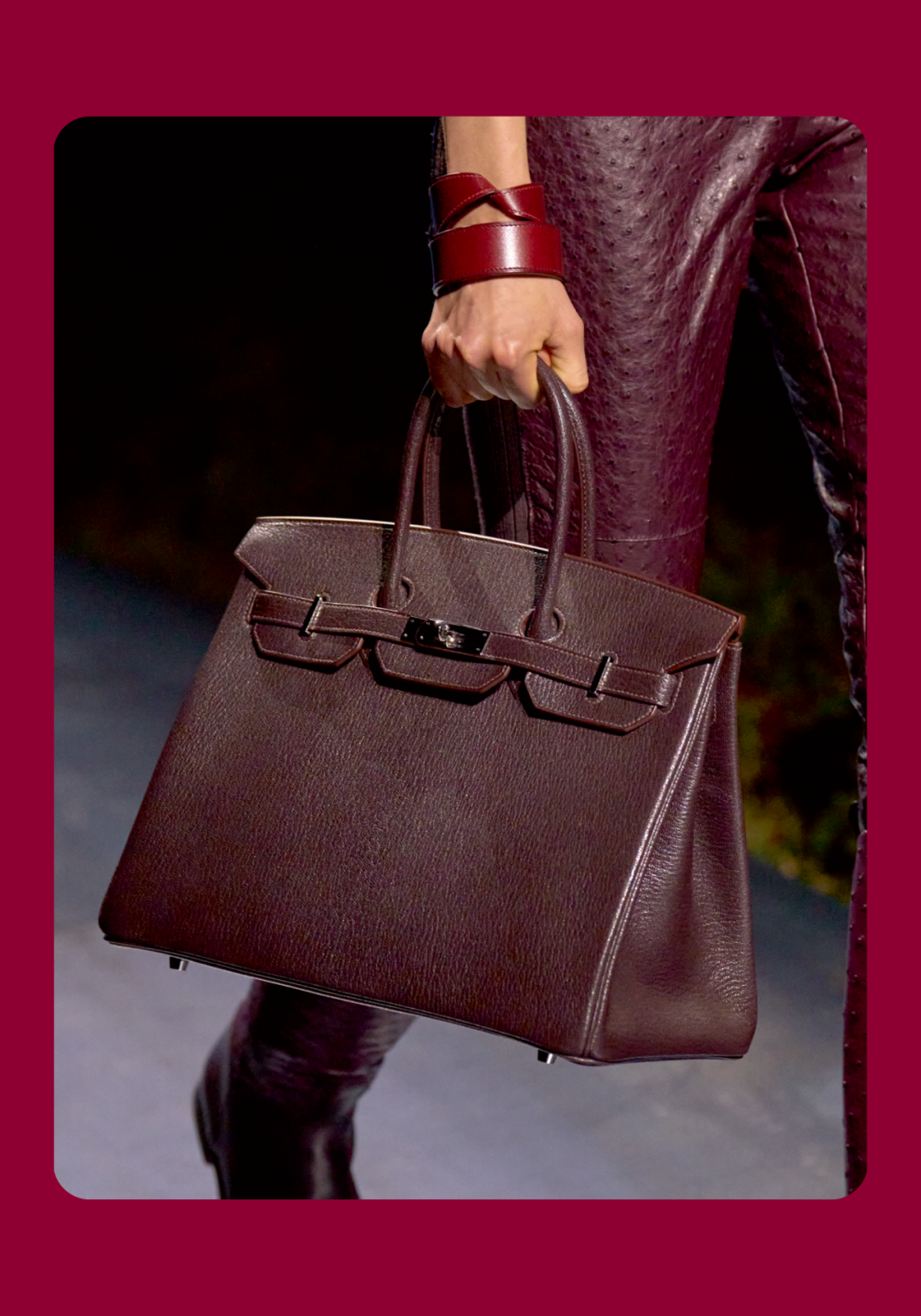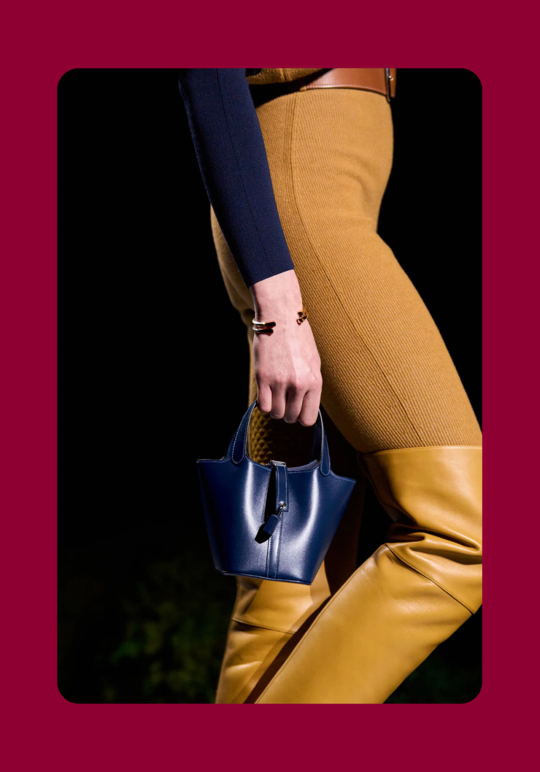 导语:本季,Nadège Vanhée-Cybulski 将秀场带入一个介于白昼与夜晚之间的时刻——黄昏。那是一段边界开始松动的时间:光仍然存在,影子却已经升起,熟悉的世界在微妙变化中被重新描绘。围绕这一“临界之境”,她构建了一种新的女性形象:力量与感性并行,显露与遮蔽同时存在。 在共和国卫队总部深处,空间被一层幽蓝色光线缓缓点亮。那光束接近傍晚空气残留的冷色——白昼尚未完全退场,夜晚却已经逼近。跑道在观众席之间盘旋延伸,像一条在地表缓慢展开的路径,最终通向远处的圆形开口:一枚悬浮在黑暗中的“月”。当模特从那道光晕中走出时,仿佛从另一种时间抵达。整个空间因此处在一种不稳定的状态:不是夜晚,却已经离白天很远。 这一季的情绪被 Hermès 描述为一种“临界之境”。那是一段边界逐渐松动的时间:黄昏悬停在空气中,天空与地面之间的界线慢慢变得模糊,熟悉的世界仿佛被重新描绘。创意总监Nadège Vanhée-Cybulski 将整场秀安放在这样一个“时间带”——光尚未消失,影子却已经悄然升起。随着视线逐渐适应这种半明半暗的状态,感知也被重新调动:颜色被夜色轻轻压低,轮廓在暗处反而显得更加清晰。 1、黄昏的临界之境 “并行”成为贯穿整个系列的关键词。舞台本身几乎就是这一概念的物理化:蓝光与暗影并置,人工结构与自然地貌相互叠合。跑道两侧铺陈着苔藓与植物的微型地景,绿色在灯光下显得潮湿而安静,像夜晚即将降临的森林。模特沿着蜿蜒路径行走,身体的节奏与空间的弧线彼此呼应。 这种“并行关系”并不只存在于舞台结构之中。黄昏本身就意味着两种秩序的同时存在:落日的余辉尚未完全消散,冷月的光却已经升起。暖色逐渐沉入暗处,冷色在空气中浮现。夜色在日落与月光之间不断转换。因此,在这片蓝色舞台上,皮革表面反射出锋利的光泽,羊毛织物则在阴影里显得柔软而深邃。观众的视线被引导去观察这些细节——一条线条的弧度、一件外套边缘掠过的光、或是一双马靴短暂闪现的反光。 Nadège Vanhée 对这种临界时刻显然着迷。黄昏并不属于某个稳定的时间点,它更像一种持续变化的状态:当白昼尚未完全退场,夜晚却已经开始占据空气,日常秩序在这一刻短暂松动,身体与环境之间的关系也被重新感知。秀场的氛围因此隐约唤起赫卡忒(Hekate)的神话意象——那位手持火炬、守望十字路口的女神。 在古老的叙事中,她总是出现在边界之上:昼与夜、生与死、已知与未知之间的交界处。这样的象征为整个系列增添了一层微妙的意味——女性更像处在一种持续移动的状态,清醒、独立,也拥有在不同世界之间自由穿行的能力。 2、在显露与遮蔽之间 Nadège Vanhée为这一季塑造的女性形象带着一种安静而明确的力量:肩线平直,腰部被清晰界定,腿部线条向下延伸,在高筒马靴的包裹中显得修长而稳定。她们似乎早已熟悉如何像夜行者一样,在光与影之间漫步。 性感在这里以一种极其克制的方式浮现。皮肤偶尔在轮廓之间闪现——裙摆开衩处的一瞬、拉链开启时露出的衬衫、或是短裙与长靴之间留下的一小段肌肤。衣服围绕身体构建出一种精确的结构,感性被安置在秩序之中,却始终保持自由的呼吸。这种张力贯穿整个系列:身体被描绘得清晰而坚定,同时保留着一种难以捉摸的距离。 结构在这一季显得尤为重要。A 字轮廓在腰部向外展开,线条干净而锋利;骑马裤在臀部形成饱满的弧线,然后在膝下收紧,与高筒靴自然衔接。骑术传统在这里成为身体语言的一部分。线条利落得几乎像是鞭子挥过一样,带着运动的节奏。 高筒马靴几乎贯穿整个系列。靴筒紧贴小腿与膝盖,深色皮革在灯光下泛出柔和的反光。模特每一步迈出时,皮革表面都会轻微折叠,留下细小而真实的痕迹。那是一种极具功能性的鞋履,却在舞台上产生了近乎雕塑般的视觉效果。靴子让身体的节奏变得更加清晰:脚步坚定、步幅稳定,仿佛在为整场秀设定一种安静而持久的节拍。 材质之间的关系同样构成这一季的重要层次。皮革以不同方式出现:紧身连体装、机车式连衣裙、结构利落的短裙与大衣。光泽在皮革表面缓慢流动,与羊毛、针织和毛海形成对比。双面罗纹针织在阴影中透出细微的色彩变化,仿佛夜色中刚刚浮现的光。不同材质彼此靠近,形成一种平静而复杂的质感结构:光滑与粗糙、柔软与坚硬在同一件造型中同时存在。 颜色延续着黄昏的叙事。酒红色在皮革表面显得深邃而温暖,森林绿在蓝光中逐渐沉入阴影,午夜蓝则带着一种几乎接近黑色的深度。偶尔出现的硫黄色像一缕仍未消散的落日余辉,在整体冷色调中留下短暂的亮度。色彩在日落与月光之间缓慢过渡,夜色因此呈现出丰富而复杂的层次。 在这样的结构、材质与色彩之中,女性形象逐渐清晰。身体并未被装饰成某种理想化的形态,而是在服装中获得一种稳定而真实的存在感。腰带轻轻束住腰部,外套在肩线处形成坚定的轮廓,短裙与骑马裤让腿部线条显得直接而明确。衣服似乎在陪伴身体运动,而不是试图改变它。 3、关于物件打造的秩序 一直以来,在 Hermès 的秀场上,包袋更像是一种语言:在服装之间出现,构成节奏,也构成整个系列最稳定的结构。经典款与新设计并行出现,像两个时间层在同一条跑道上相遇。Picotin、Plume 与 Bolide 等熟悉的名字在这一季被重新缩小比例,