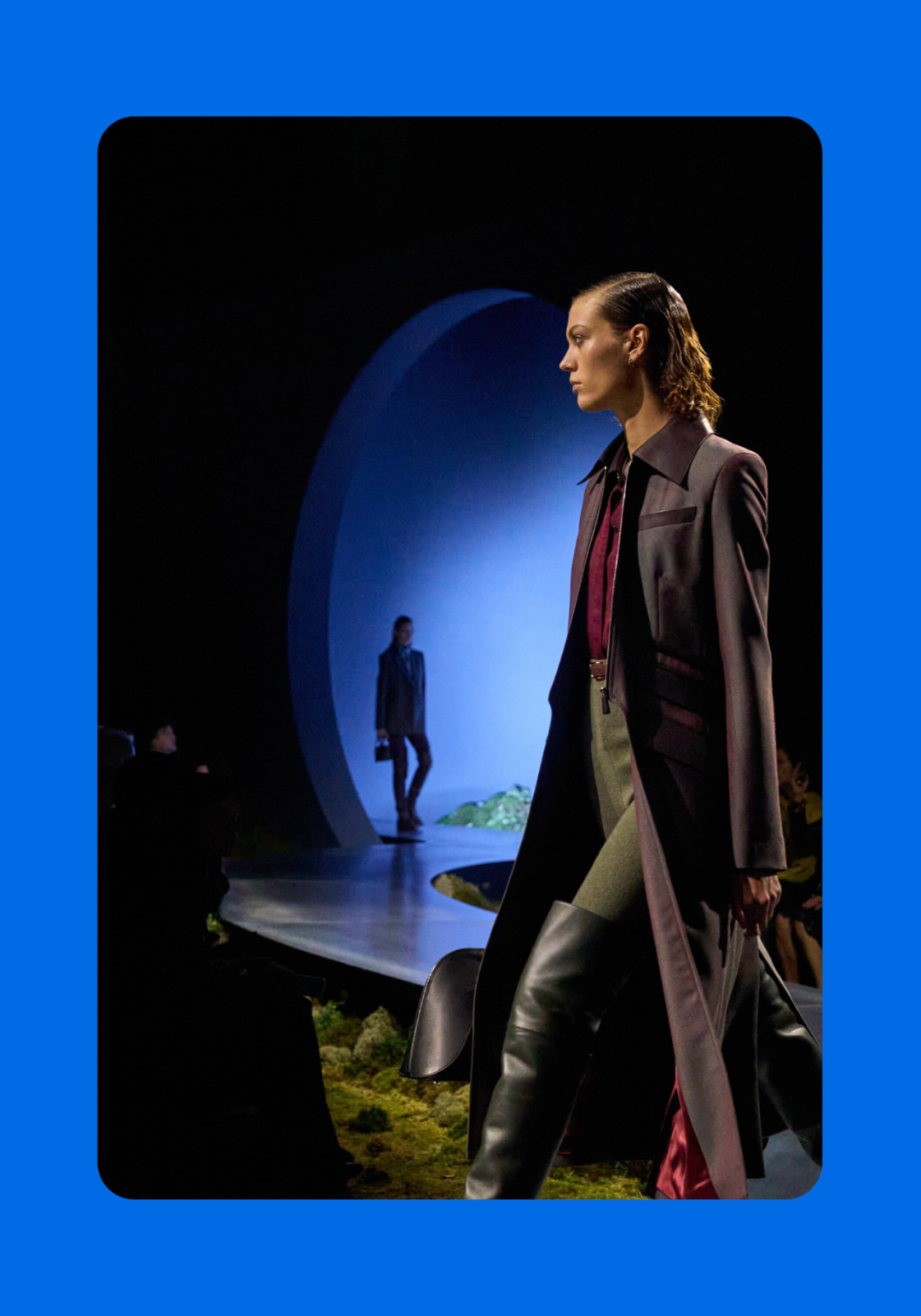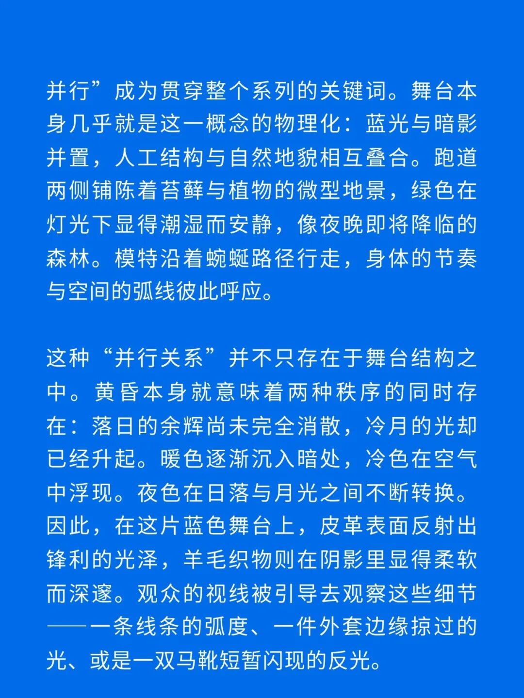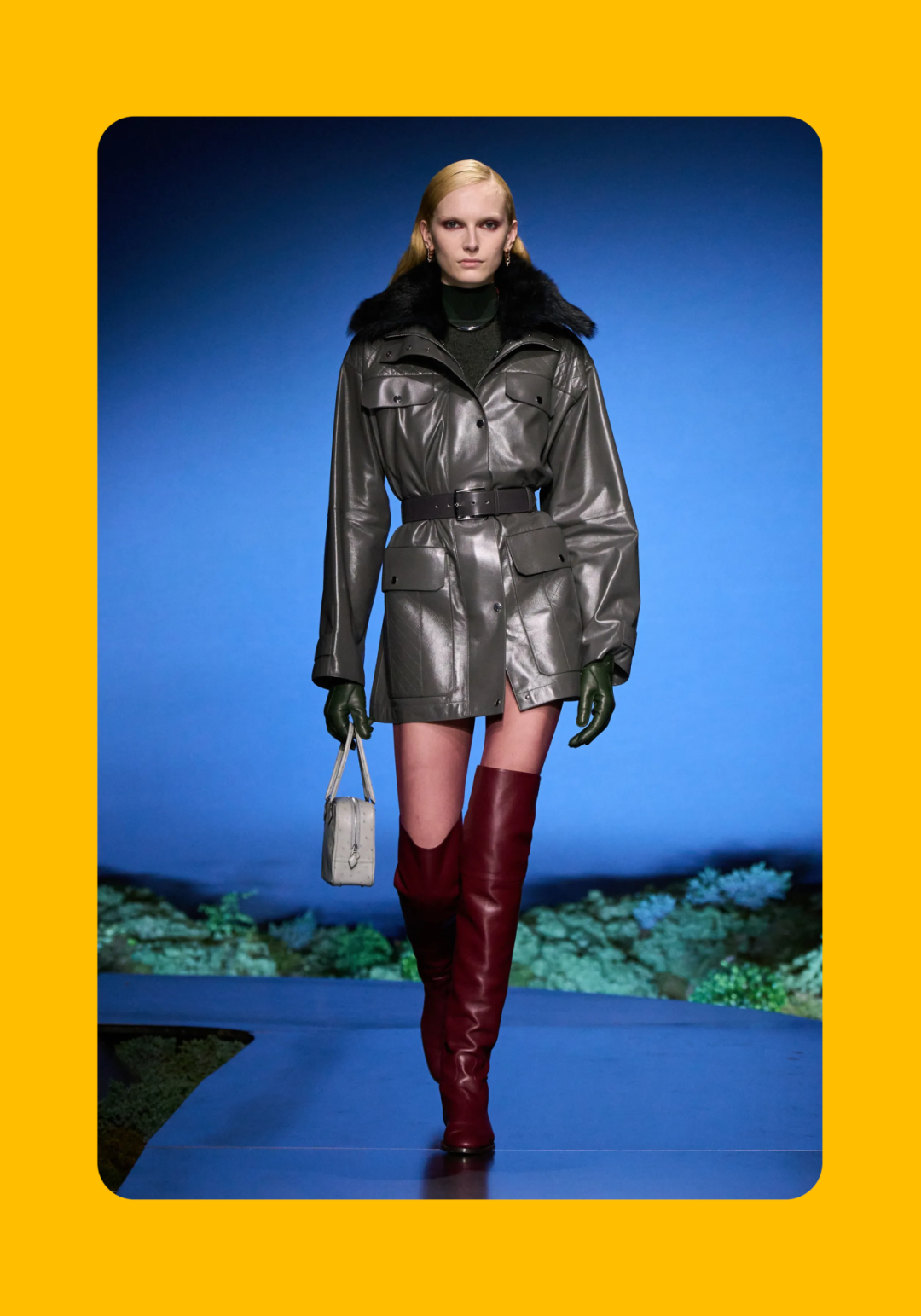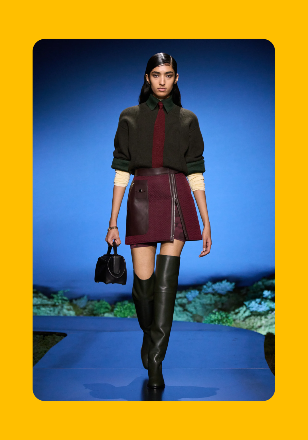 导语:本季,Nadège Vanhée-Cybulski 将秀场带入一个介于白昼与夜晚之间的时刻——黄昏。那是一段边界开始松动的时间:光仍然存在,影子却已经升起,熟悉的世界在微妙变化中被重新描绘。围绕这一“临界之境”,她构建了一种新的女性形象:力量与感性并行,显露与遮蔽同时存在。 在共和国卫队总部深处,空间被一层幽蓝色光线缓缓点亮。那光束接近傍晚空气残留的冷色——白昼尚未完全退场,夜晚却已经逼近。跑道在观众席之间盘旋延伸,像一条在地表缓慢展开的路径,最终通向远处的圆形开口:一枚悬浮在黑暗中的“月”。当模特从那道光晕中走出时,仿佛从另一种时间抵达。整个空间因此处在一种不稳定的状态:不是夜晚,却已经离白天很远。 这一季的情绪被 Hermès 描述为一种“临界之境”。那是一段边界逐渐松动的时间:黄昏悬停在空气中,天空与地面之间的界线慢慢变得模糊,熟悉的世界仿佛被重新描绘。创意总监Nadège Vanhée-Cybulski 将整场秀安放在这样一个“时间带”——光尚未消失,影子却已经悄然升起。随着视线逐渐适应这种半明半暗的状态,感知也被重新调动:颜色被夜色轻轻压低,轮廓在暗处反而显得更加清晰。 1、黄昏的临界之境 “并行”成为贯穿整个系列的关键词。舞台本身几乎就是这一概念的物理化:蓝光与暗影并置,人工结构与自然地貌相互叠合。跑道两侧铺陈着苔藓与植物的微型地景,绿色在灯光下显得潮湿而安静,像夜晚即将降临的森林。模特沿着蜿蜒路径行走,身体的节奏与空间的弧线彼此呼应。 这种“并行关系”并不只存在于舞台结构之中。黄昏本身就意味着两种秩序的同时存在:落日的余辉尚未完全消散,冷月的光却已经升起。暖色逐渐沉入暗处,冷色在空气中浮现。夜色在日落与月光之间不断转换。因此,在这片蓝色舞台上,皮革表面反射出锋利的光泽,羊毛织物则在阴影里显得柔软而深邃。观众的视线被引导去观察这些细节——一条线条的弧度、一件外套边缘掠过的光、或是一双马靴短暂闪现的反光。 Nadège Vanhée 对这种临界时刻显然着迷。黄昏并不属于某个稳定的时间点,它更像一种持续变化的状态:当白昼尚未完全退场,夜晚却已经开始占据空气,日常秩序在这一刻短暂松动,身体与环境之间的关系也被重新感知。秀场的氛围因此隐约唤起赫卡忒(Hekate)的神话意象——那位手持火炬、守望十字路口的女神。 在古老的叙事中,她总是出现在边界之上:昼与夜、生与死、已知与未知之间的交界处。这样的象征为整个系列增添了一层微妙的意味——女性更像处在一种持续移动的状态,清醒、独立,也拥有在不同世界之间自由穿行的能力。 2、在显露与遮蔽之间 Nadège Vanhée为这一季塑造的女性形象带着一种安静而明确的力量:肩线平直,腰部被清晰界定,腿部线条向下延伸,在高筒马靴的包裹中显得修长而稳定。她们似乎早已熟悉如何像夜行者一样,在光与影之间漫步。 性感在这里以一种极其克制的方式浮现。皮肤偶尔在轮廓之间闪现——裙摆开衩处的一瞬、拉链开启时露出的衬衫、或是短裙与长靴之间留下的一小段肌肤。衣服围绕身体构建出一种精确的结构,感性被安置在秩序之中,却始终保持自由的呼吸。这种张力贯穿整个系列:身体被描绘得清晰而坚定,同时保留着一种难以捉摸的距离。 结构在这一季显得尤为重要。A 字轮廓在腰部向外展开,线条干净而锋利;骑马裤在臀部形成饱满的弧线,然后在膝下收紧,与高筒靴自然衔接。骑术传统在这里成为身体语言的一部分。线条利落得几乎像是鞭子挥过一样,带着运动的节奏。 高筒马靴几乎贯穿整个系列。靴筒紧贴小腿与膝盖,深色皮革在灯光下泛出柔和的反光。模特每一步迈出时,皮革表面都会轻微折叠,留下细小而真实的痕迹。那是一种极具功能性的鞋履,却在舞台上产生了近乎雕塑般的视觉效果。靴子让身体的节奏变得更加清晰:脚步坚定、步幅稳定,仿佛在为整场秀设定一种安静而持久的节拍。 材质之间的关系同样构成这一季的重要层次。皮革以不同方式出现:紧身连体装、机车式连衣裙、结构利落的短裙与大衣。光泽在皮革表面缓慢流动,与羊毛、针织和毛海形成对比。双面罗纹针织在阴影中透出细微的色彩变化,仿佛夜色中刚刚浮现的光。不同材质彼此靠近,形成一种平静而复杂的质感结构:光滑与粗糙、柔软与坚硬在同一件造型中同时存在。 颜色延续着黄昏的叙事。酒红色在皮革表面显得深邃而温暖,森林绿在蓝光中逐渐沉入阴影,午夜蓝则带着一种几乎接近黑色的深度。偶尔出现的硫黄色像一缕仍未消散的落日余辉,在整体冷色调中留下短暂的亮度。色彩在日落与月光之间缓慢过渡,夜色因此呈现出丰富而复杂的层次。 在这样的结构、材质与色彩之中,女性形象逐渐清晰。身体并未被装饰成某种理想化的形态,而是在服装中获得一种稳定而真实的存在感。腰带轻轻束住腰部,外套在肩线处形成坚定的轮廓,短裙与骑马裤让腿部线条显得直接而明确。衣服似乎在陪伴身体运动,而不是试图改变它。 3、关于物件打造的秩序 一直以来,在 Hermès 的秀场上,包袋更像是一种语言:在服装之间出现,构成节奏,也构成整个系列最稳定的结构。经典款与新设计并行出现,像两个时间层在同一条跑道上相遇。Picotin、Plume 与 Bolide 等熟悉的名字在这一季被重新缩小比例,