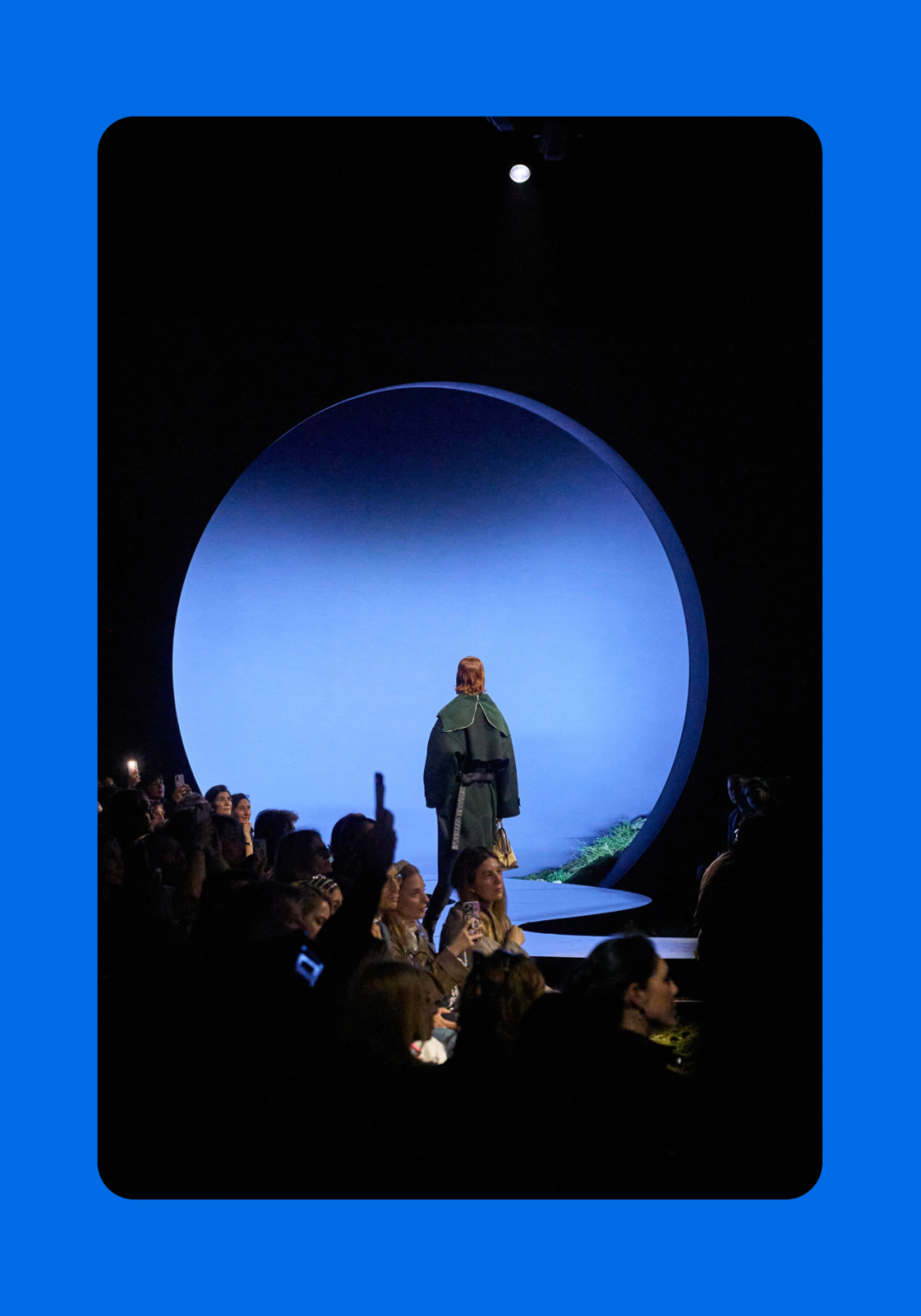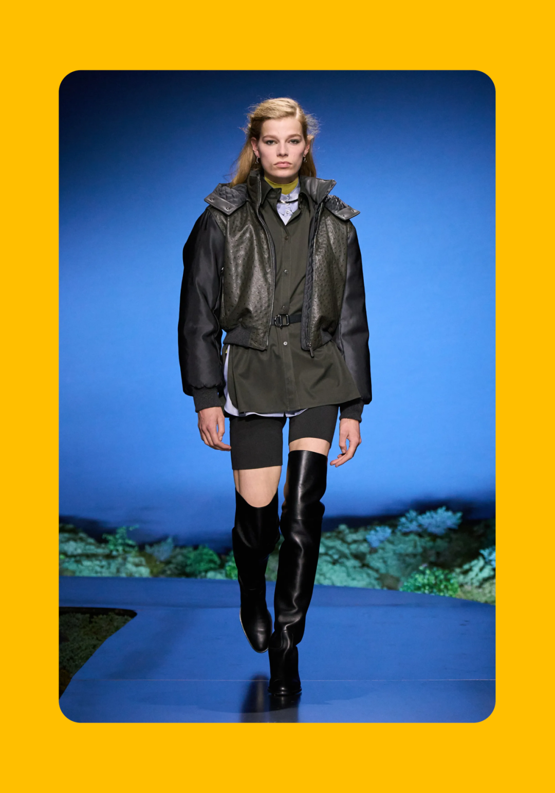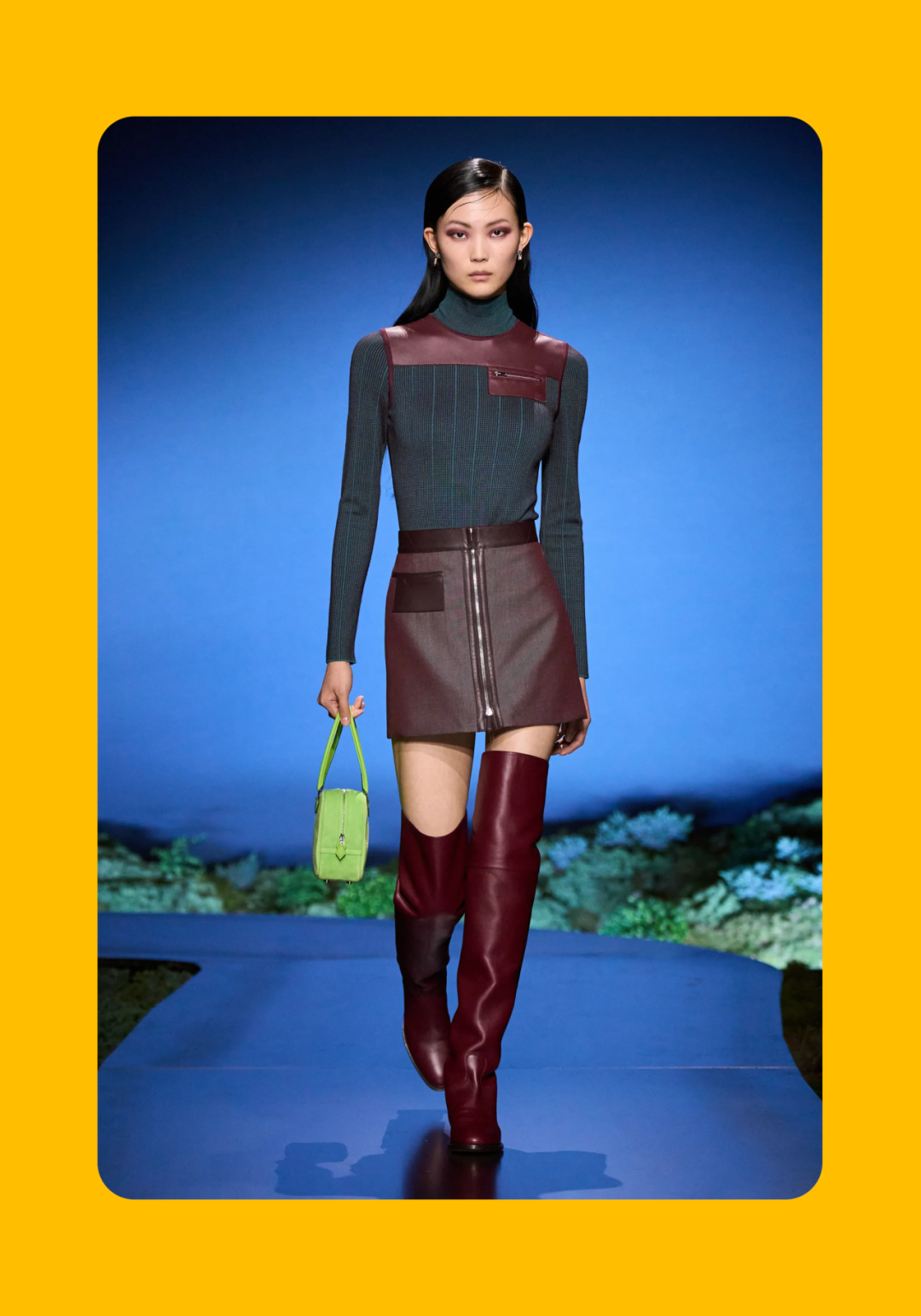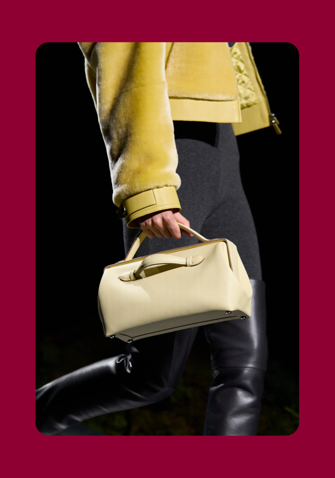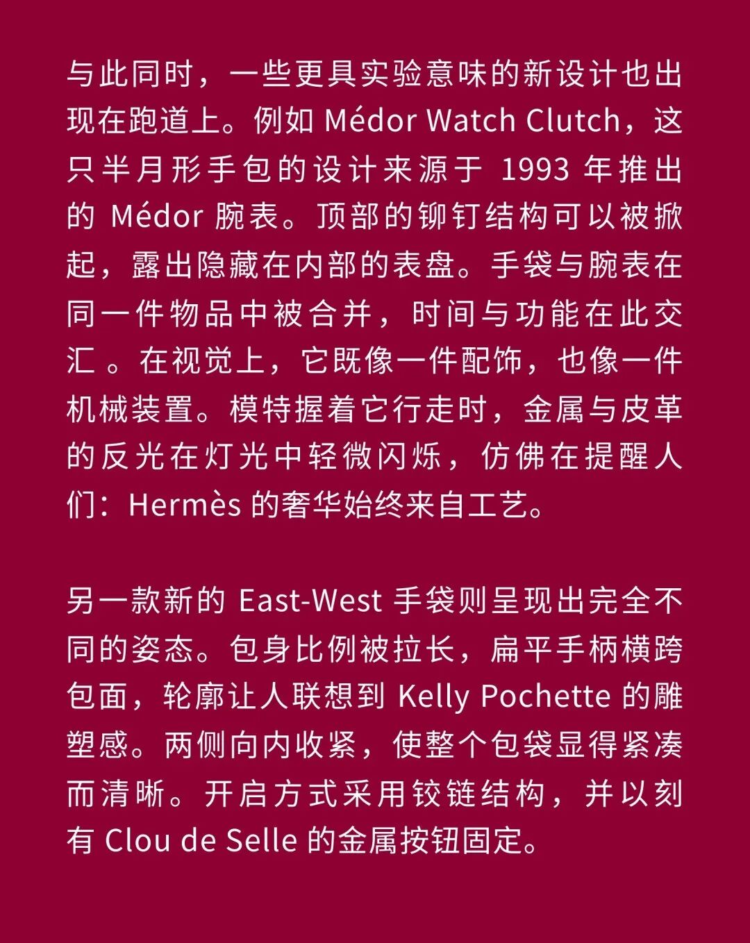 导语:本季,Nadège Vanhée-Cybulski 将秀场带入一个介于白昼与夜晚之间的时刻——黄昏。那是一段边界开始松动的时间:光仍然存在,影子却已经升起,熟悉的世界在微妙变化中被重新描绘。围绕这一“临界之境”,她构建了一种新的女性形象:力量与感性并行,显露与遮蔽同时存在。 在共和国卫队总部深处,空间被一层幽蓝色光线缓缓点亮。那光束接近傍晚空气残留的冷色——白昼尚未完全退场,夜晚却已经逼近。跑道在观众席之间盘旋延伸,像一条在地表缓慢展开的路径,最终通向远处的圆形开口:一枚悬浮在黑暗中的“月”。当模特从那道光晕中走出时,仿佛从另一种时间抵达。整个空间因此处在一种不稳定的状态:不是夜晚,却已经离白天很远。 这一季的情绪被 Hermès 描述为一种“临界之境”。那是一段边界逐渐松动的时间:黄昏悬停在空气中,天空与地面之间的界线慢慢变得模糊,熟悉的世界仿佛被重新描绘。创意总监Nadège Vanhée-Cybulski 将整场秀安放在这样一个“时间带”——光尚未消失,影子却已经悄然升起。随着视线逐渐适应这种半明半暗的状态,感知也被重新调动:颜色被夜色轻轻压低,轮廓在暗处反而显得更加清晰。 1、黄昏的临界之境 “并行”成为贯穿整个系列的关键词。舞台本身几乎就是这一概念的物理化:蓝光与暗影并置,人工结构与自然地貌相互叠合。跑道两侧铺陈着苔藓与植物的微型地景,绿色在灯光下显得潮湿而安静,像夜晚即将降临的森林。模特沿着蜿蜒路径行走,身体的节奏与空间的弧线彼此呼应。 这种“并行关系”并不只存在于舞台结构之中。黄昏本身就意味着两种秩序的同时存在:落日的余辉尚未完全消散,冷月的光却已经升起。暖色逐渐沉入暗处,冷色在空气中浮现。夜色在日落与月光之间不断转换。因此,在这片蓝色舞台上,皮革表面反射出锋利的光泽,羊毛织物则在阴影里显得柔软而深邃。观众的视线被引导去观察这些细节——一条线条的弧度、一件外套边缘掠过的光、或是一双马靴短暂闪现的反光。 Nadège Vanhée 对这种临界时刻显然着迷。黄昏并不属于某个稳定的时间点,它更像一种持续变化的状态:当白昼尚未完全退场,夜晚却已经开始占据空气,日常秩序在这一刻短暂松动,身体与环境之间的关系也被重新感知。秀场的氛围因此隐约唤起赫卡忒(Hekate)的神话意象——那位手持火炬、守望十字路口的女神。 在古老的叙事中,她总是出现在边界之上:昼与夜、生与死、已知与未知之间的交界处。这样的象征为整个系列增添了一层微妙的意味——女性更像处在一种持续移动的状态,清醒、独立,也拥有在不同世界之间自由穿行的能力。 2、在显露与遮蔽之间 Nadège Vanhée为这一季塑造的女性形象带着一种安静而明确的力量:肩线平直,腰部被清晰界定,腿部线条向下延伸,在高筒马靴的包裹中显得修长而稳定。她们似乎早已熟悉如何像夜行者一样,在光与影之间漫步。 性感在这里以一种极其克制的方式浮现。皮肤偶尔在轮廓之间闪现——裙摆开衩处的一瞬、拉链开启时露出的衬衫、或是短裙与长靴之间留下的一小段肌肤。衣服围绕身体构建出一种精确的结构,感性被安置在秩序之中,却始终保持自由的呼吸。这种张力贯穿整个系列:身体被描绘得清晰而坚定,同时保留着一种难以捉摸的距离。 结构在这一季显得尤为重要。A 字轮廓在腰部向外展开,线条干净而锋利;骑马裤在臀部形成饱满的弧线,然后在膝下收紧,与高筒靴自然衔接。骑术传统在这里成为身体语言的一部分。线条利落得几乎像是鞭子挥过一样,带着运动的节奏。 高筒马靴几乎贯穿整个系列。靴筒紧贴小腿与膝盖,深色皮革在灯光下泛出柔和的反光。模特每一步迈出时,皮革表面都会轻微折叠,留下细小而真实的痕迹。那是一种极具功能性的鞋履,却在舞台上产生了近乎雕塑般的视觉效果。靴子让身体的节奏变得更加清晰:脚步坚定、步幅稳定,仿佛在为整场秀设定一种安静而持久的节拍。 材质之间的关系同样构成这一季的重要层次。皮革以不同方式出现:紧身连体装、机车式连衣裙、结构利落的短裙与大衣。光泽在皮革表面缓慢流动,与羊毛、针织和毛海形成对比。双面罗纹针织在阴影中透出细微的色彩变化,仿佛夜色中刚刚浮现的光。不同材质彼此靠近,形成一种平静而复杂的质感结构:光滑与粗糙、柔软与坚硬在同一件造型中同时存在。 颜色延续着黄昏的叙事。酒红色在皮革表面显得深邃而温暖,森林绿在蓝光中逐渐沉入阴影,午夜蓝则带着一种几乎接近黑色的深度。偶尔出现的硫黄色像一缕仍未消散的落日余辉,在整体冷色调中留下短暂的亮度。色彩在日落与月光之间缓慢过渡,夜色因此呈现出丰富而复杂的层次。 在这样的结构、材质与色彩之中,女性形象逐渐清晰。身体并未被装饰成某种理想化的形态,而是在服装中获得一种稳定而真实的存在感。腰带轻轻束住腰部,外套在肩线处形成坚定的轮廓,短裙与骑马裤让腿部线条显得直接而明确。衣服似乎在陪伴身体运动,而不是试图改变它。 3、关于物件打造的秩序 一直以来,在 Hermès 的秀场上,包袋更像是一种语言:在服装之间出现,构成节奏,也构成整个系列最稳定的结构。经典款与新设计并行出现,像两个时间层在同一条跑道上相遇。Picotin、Plume 与 Bolide 等熟悉的名字在这一季被重新缩小比例,