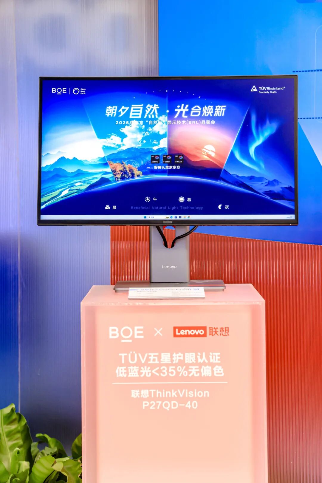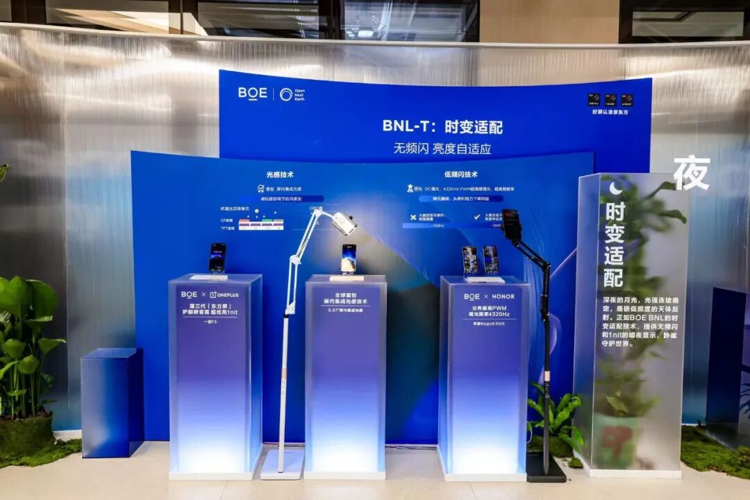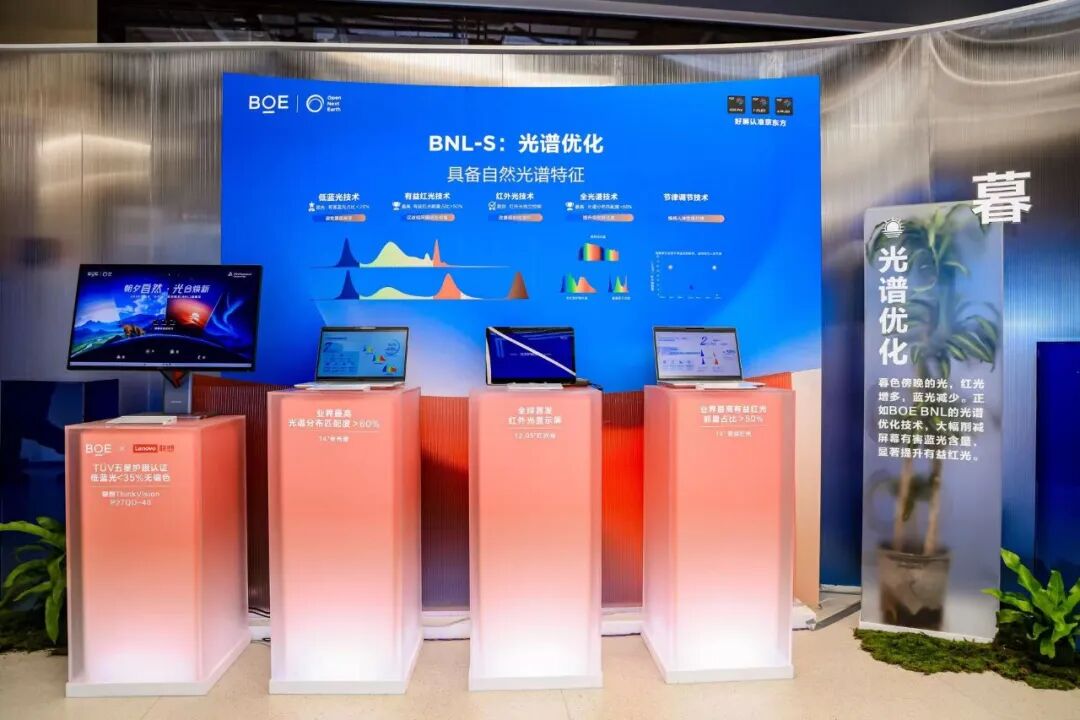 品鉴会现场,京东方精心打造了 “晨、午、暮、夜”技术体验展区,多款全球首发的基于“自然光”显示技术(BNL)产品与生态伙伴产品集中亮相,生动诠释了BNL技术如何解决用户在真实场景中的视觉健康痛点。