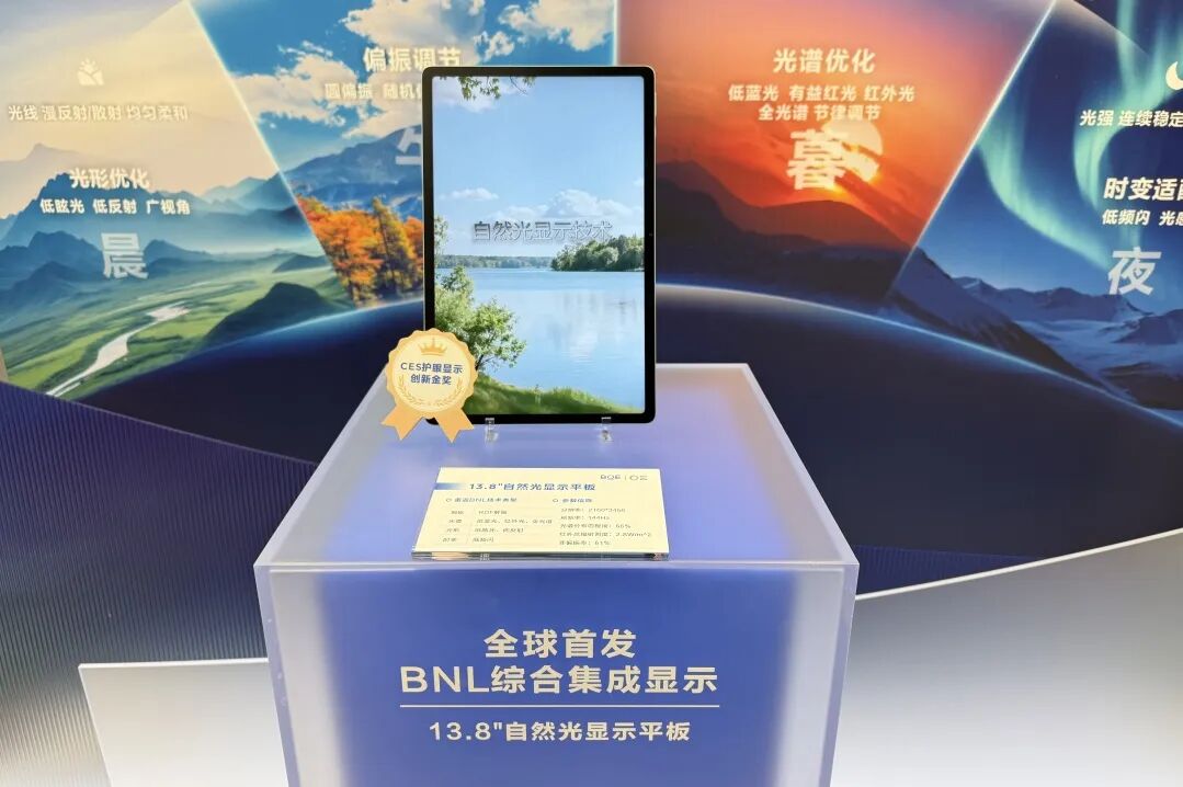 京东方13.8英寸“自然光”显示平板作为全球首款BNL综合集成产品,集BNL四大维度于一身,拥京东方首创的红外光、RDF解偏技术,业界最高光谱分布匹配度的全光谱技术及低蓝光、低频闪等BNL技术,并荣获CES 2026护眼显示全球创新金奖,成为BNL技术系统级能力的完美缩影。