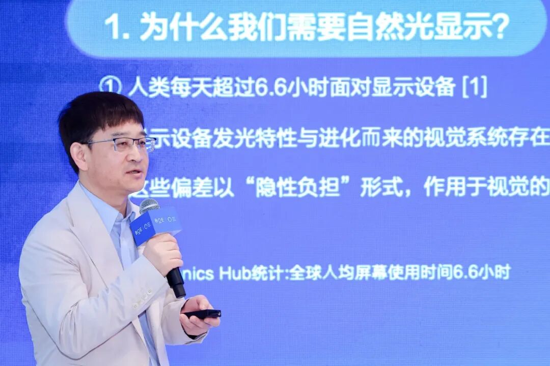 他在致辞中还强调,京东方“自然光”显示技术(BNL)的核心差异在于“系统仿生学”设计理念:“它不是单一功能的修补,而是从自然光中提取‘有益’精华——即BNL中的Beneficial——通过光谱优化、偏振调节、光形优化、时变适配四大维度,精准复刻自然光的健康舒适特性,好比是在重构一天中‘晨、午、暮、夜’四个时间段的舒适光环境,实现从‘单点减害’到‘系统增益’的跨越。”
