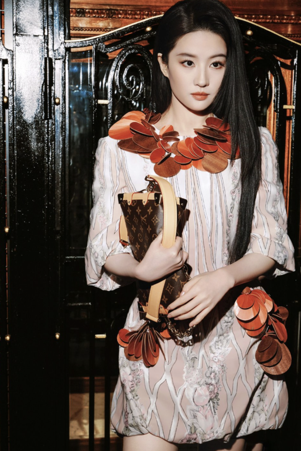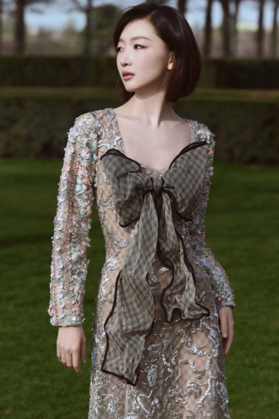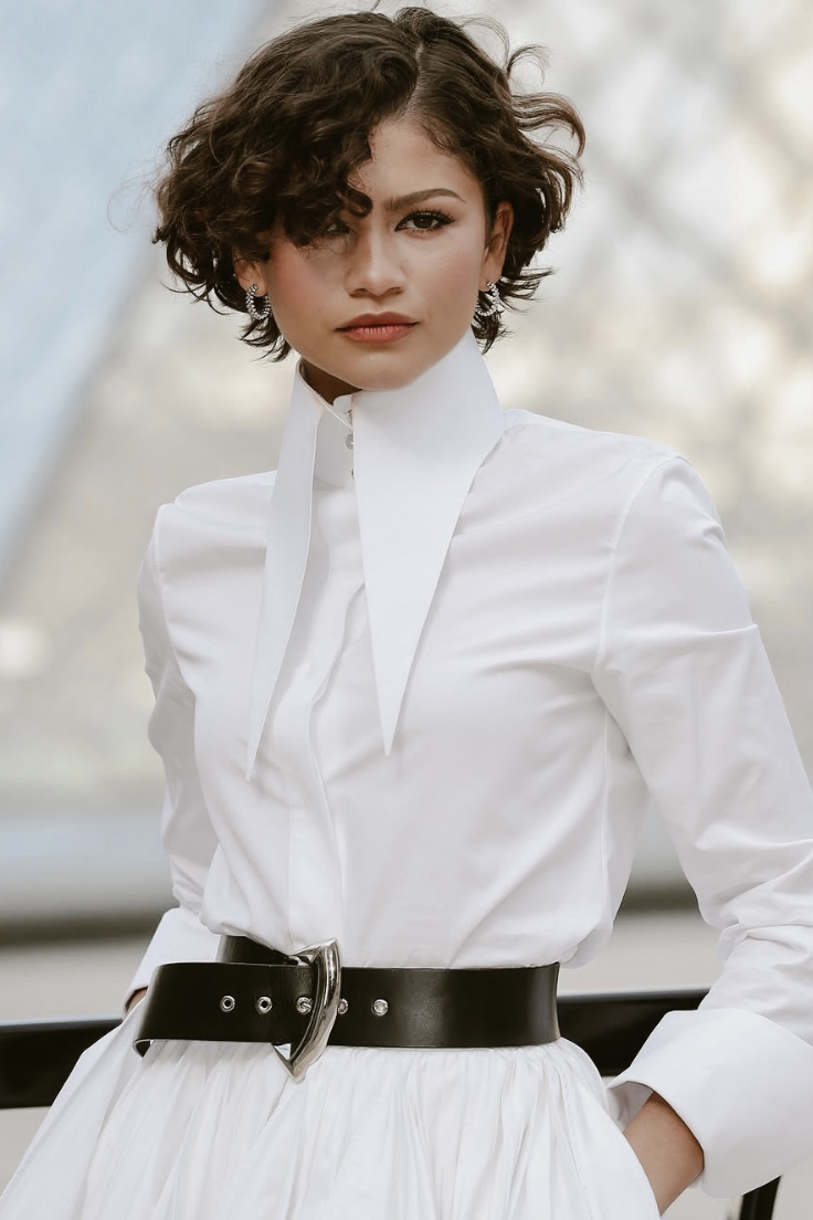 秀场外,品牌代言人们的出场同样印证着这种形象。刘亦菲以黑长直造型搭配粉色立体花瓣裙现身,周冬雨身着刺绣薄纱长裙,短发利落知性,Lisa将甜美与飒爽融于一身,是公主也是骑士,Zendaya身着简约白色衬衫搭配不规则花苞半裙,显现出时光沉淀下的笃定。