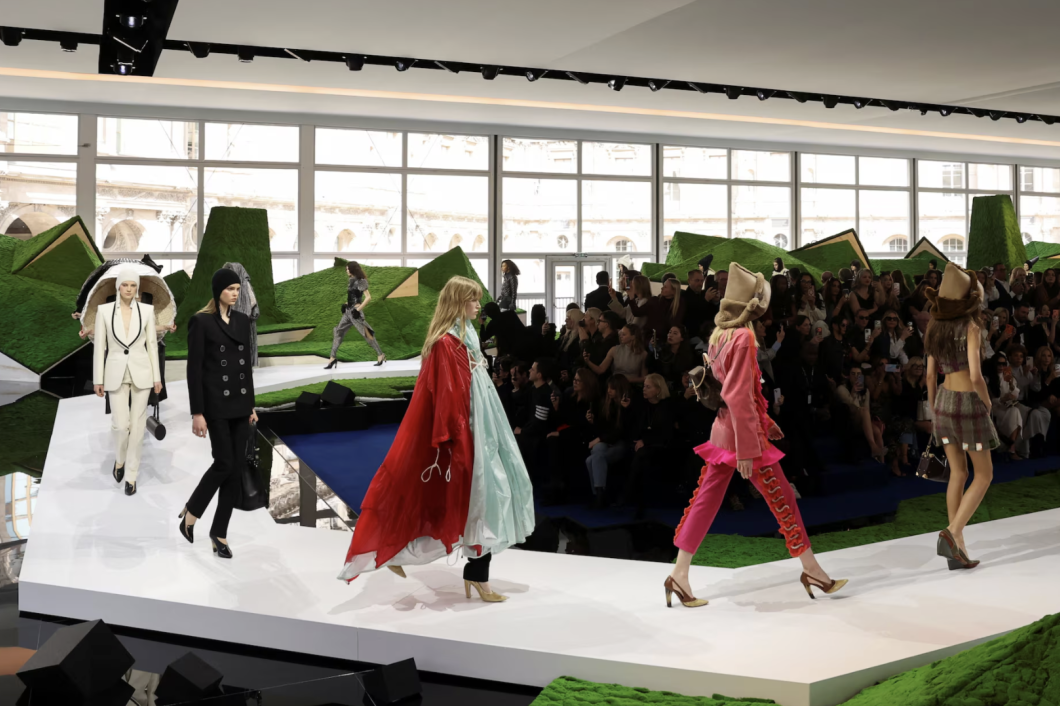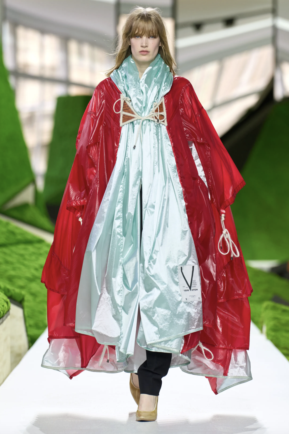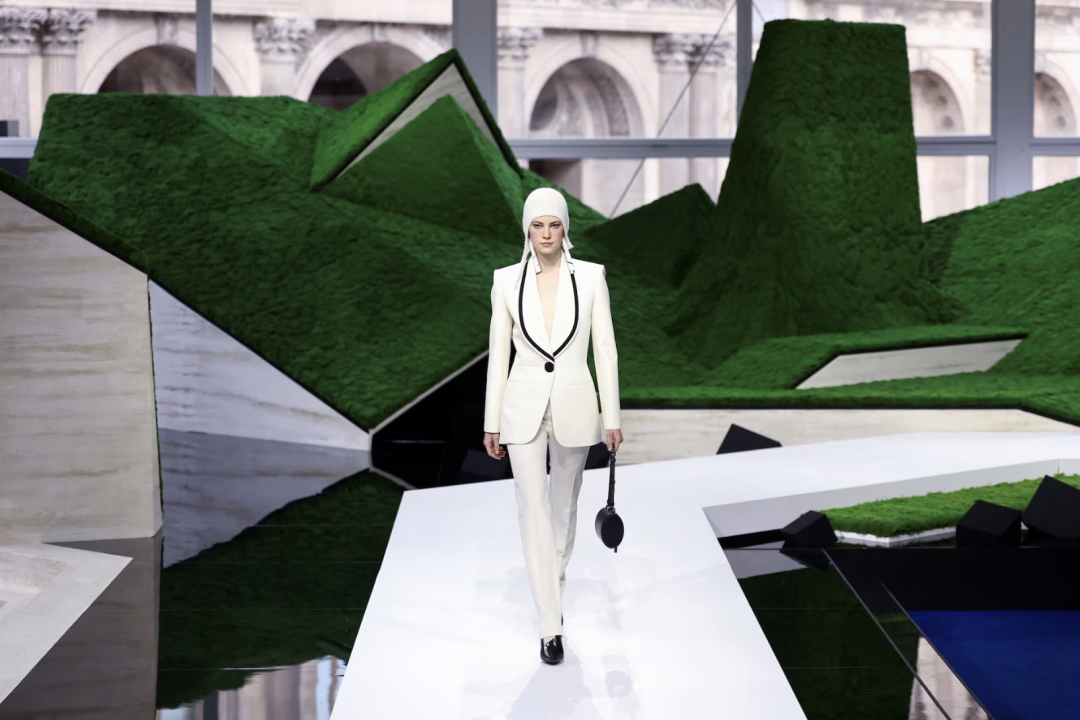 为了将这种跨越地域的“生存铠甲”语言视觉化,Ghesquière选择让秀场本身也成为一片边界模糊的旷野。在卢浮宫方形广场,他找来《人生切割术》的美术指导Jeremy Hindle,这位擅长以冷冽几何构建另类现实的大师,将古典庭院变成一座“科幻田园”。深浅不一的地景、几何起伏如山岚的装置,从置于舞台中央的宾客视角望去,仿佛同时存在于科幻地景与高山美景之间:自然、旅行与未来科技,在此重新交会。