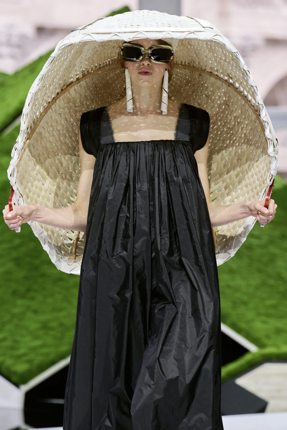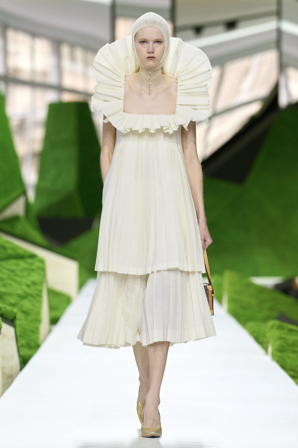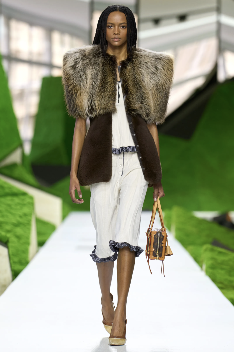 为了将这种跨越地域的“生存铠甲”语言视觉化,Ghesquière选择让秀场本身也成为一片边界模糊的旷野。在卢浮宫方形广场,他找来《人生切割术》的美术指导Jeremy Hindle,这位擅长以冷冽几何构建另类现实的大师,将古典庭院变成一座“科幻田园”。深浅不一的地景、几何起伏如山岚的装置,从置于舞台中央的宾客视角望去,仿佛同时存在于科幻地景与高山美景之间:自然、旅行与未来科技,在此重新交会。