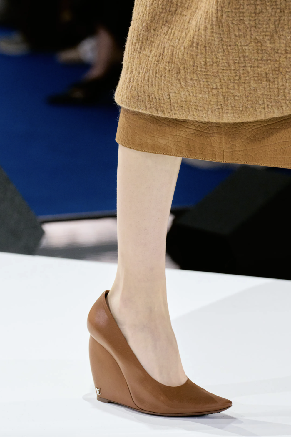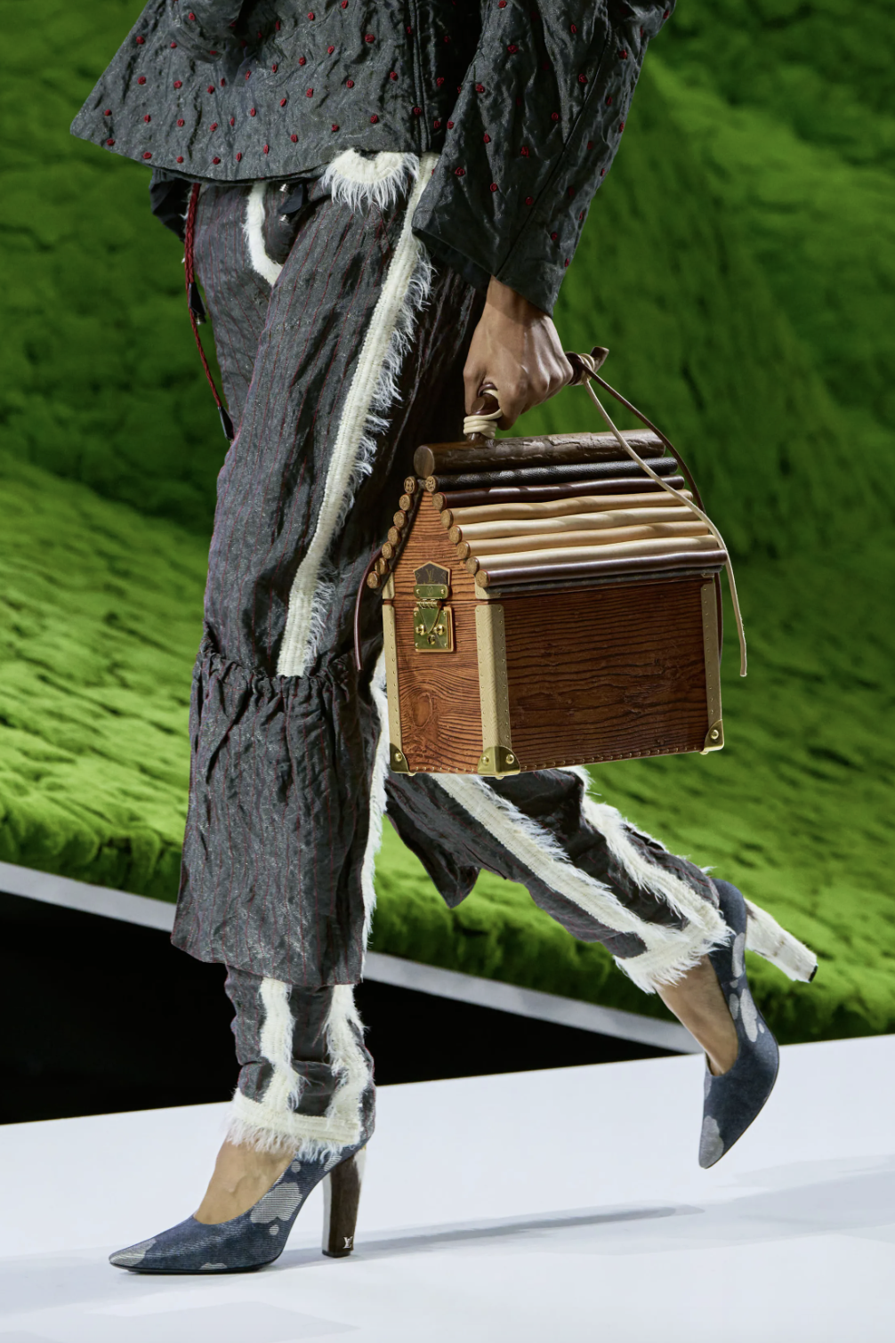 即便主题是自然,Ghesquière也从未照本宣科地搬运自然。他通过科技与工艺,将自然升华为另一种材料语言:动物纹样被重构为抽象图案,织入帆布与丹宁的肌理;皮革经压纹、开槽、鞣制,摹刻出木质的肌理与触感;纽扣在3D打印与树脂工艺下宛若天然矿石;鞋跟则形似林间鹿蹄,仿佛脚步加快,便可一步登天。