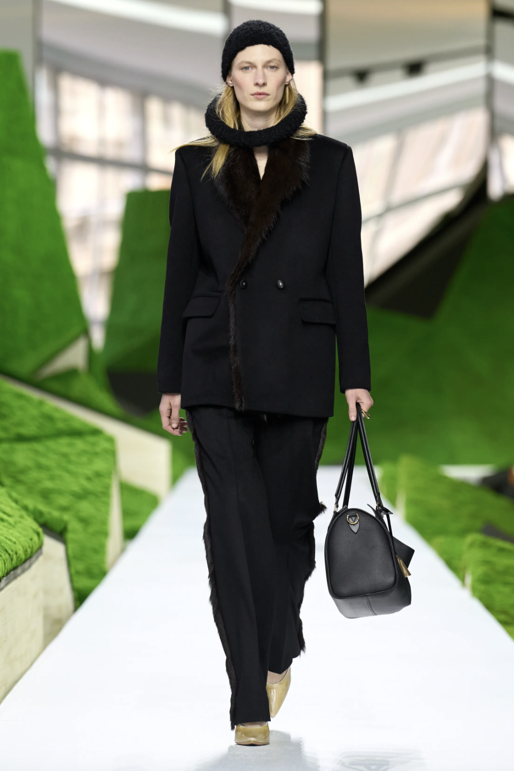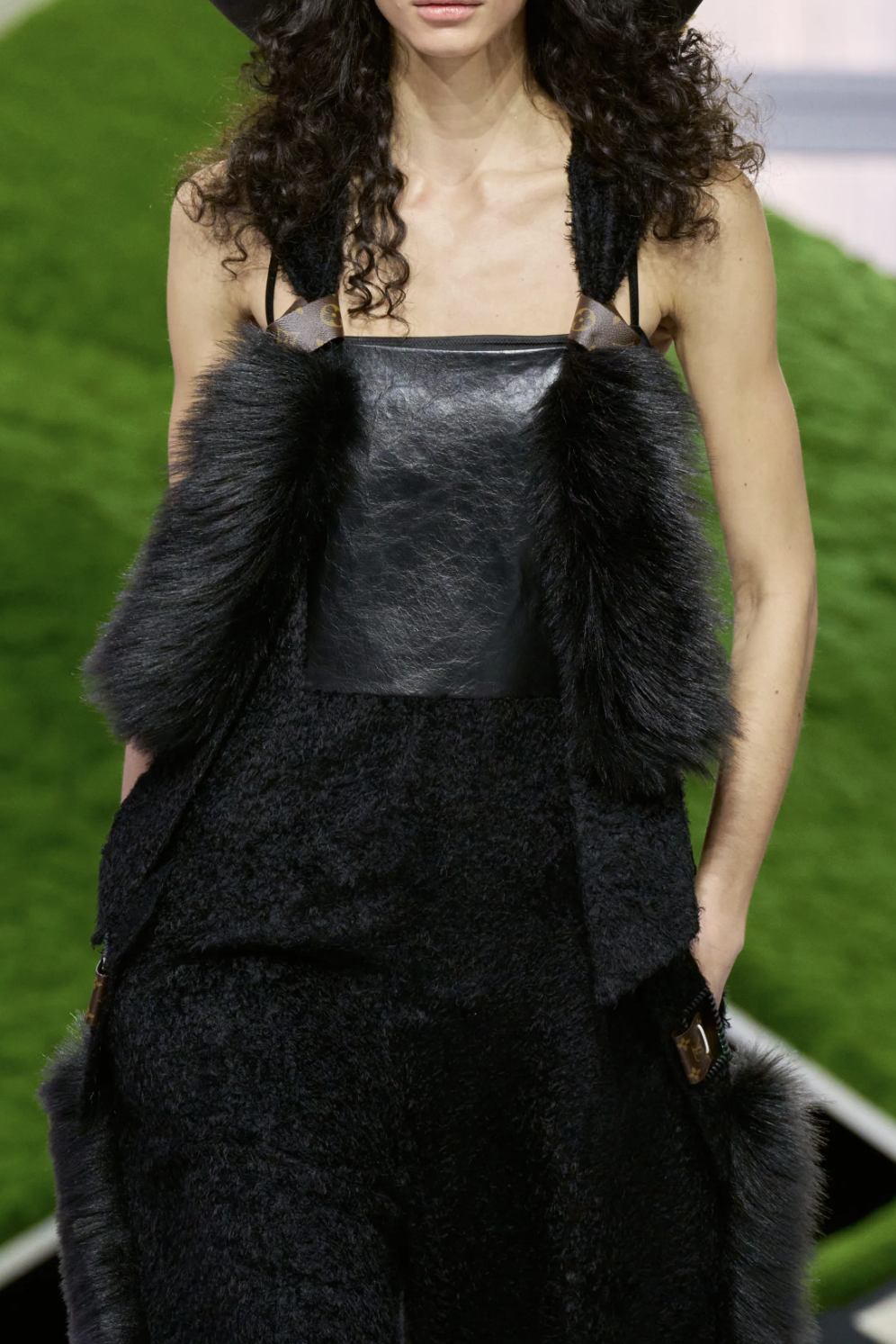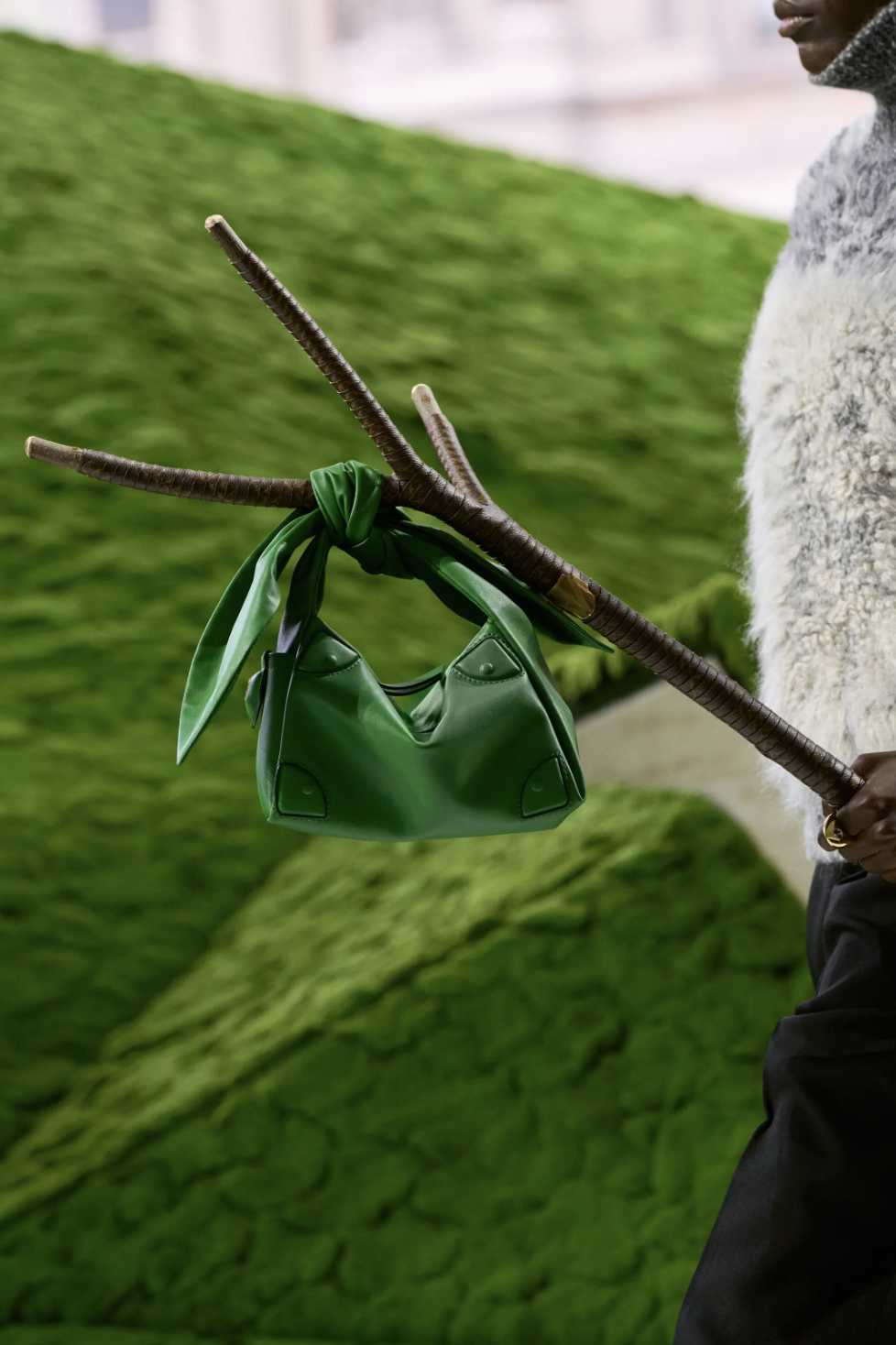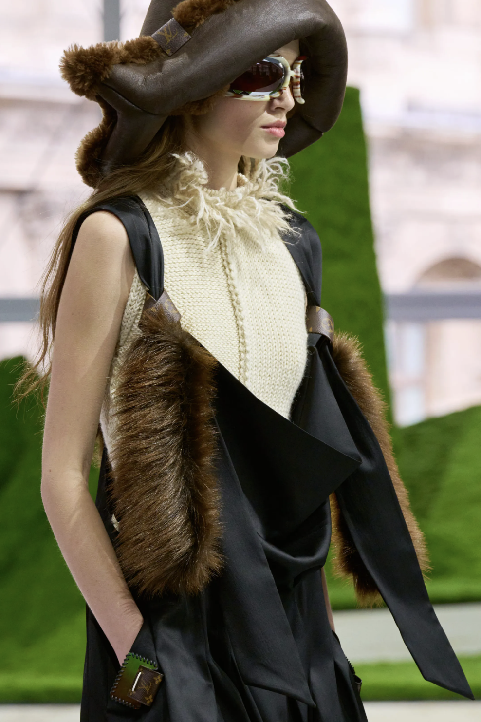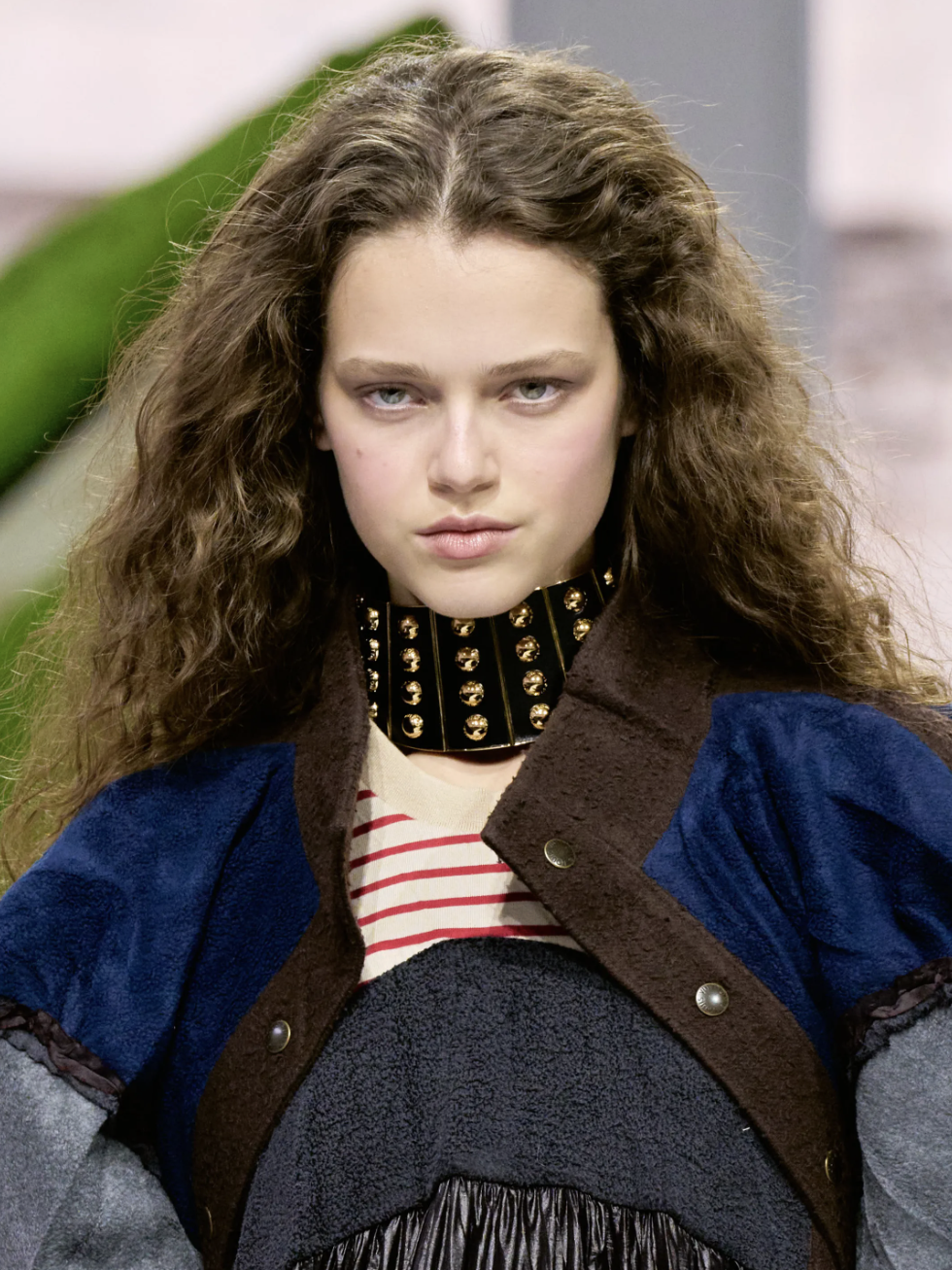 有趣的是,这些穿着建筑感廓形的女人,并没有真正走入游牧者的荒野。她们拎着精致的手袋,站在都市与自然的边缘,而正是这种边界状态,定义了Ghesquière眼中的当代女性:她可以穿着斗篷行走在巴黎街头,却依然让人想起草原上的威风凛凛。