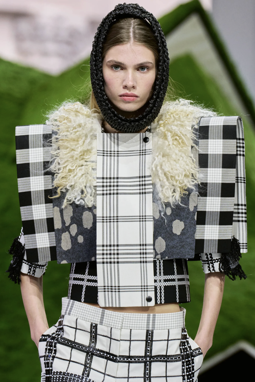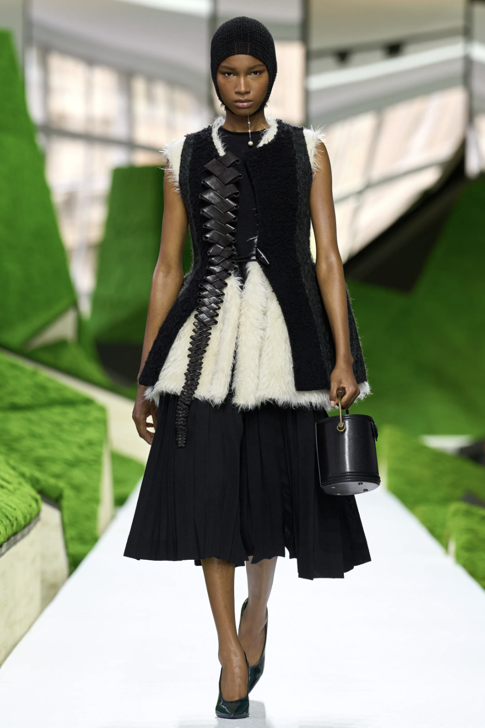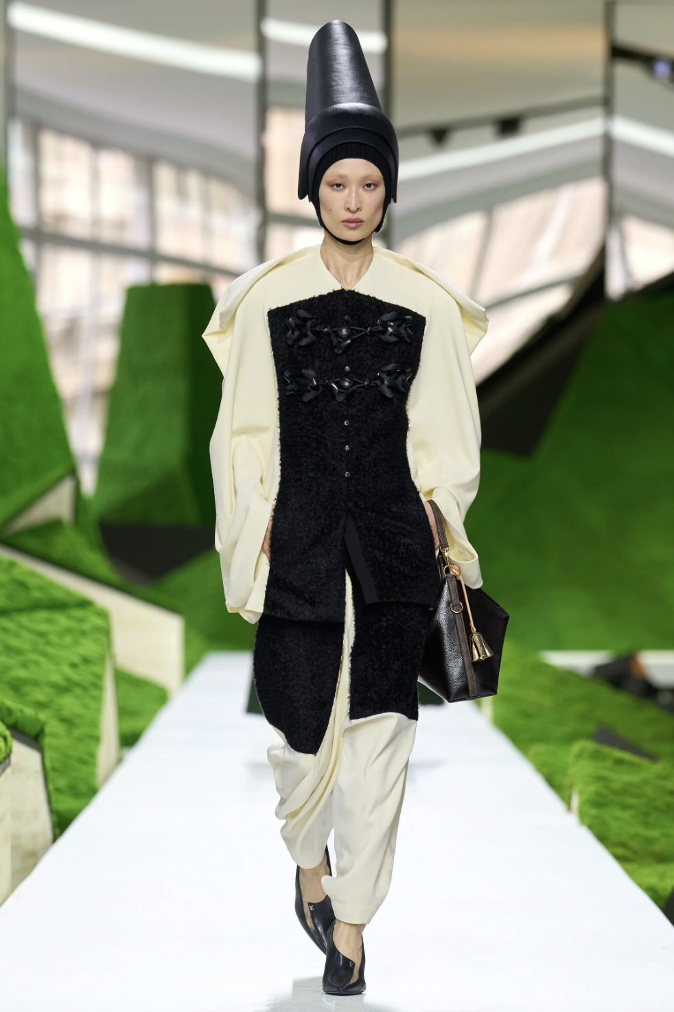 开场造型的灵感,源自土耳其牧羊人的传统斗篷“kepenek”——一种厚实的毡制外衣,形似微缩的帐篷或披肩。它原本是抵御风雨的生存装备,但在此处,粗粝的原型被精致化。拉绒动物毛、皮革镶边的羊绒,赋予其更为巧趣的质地与温度。