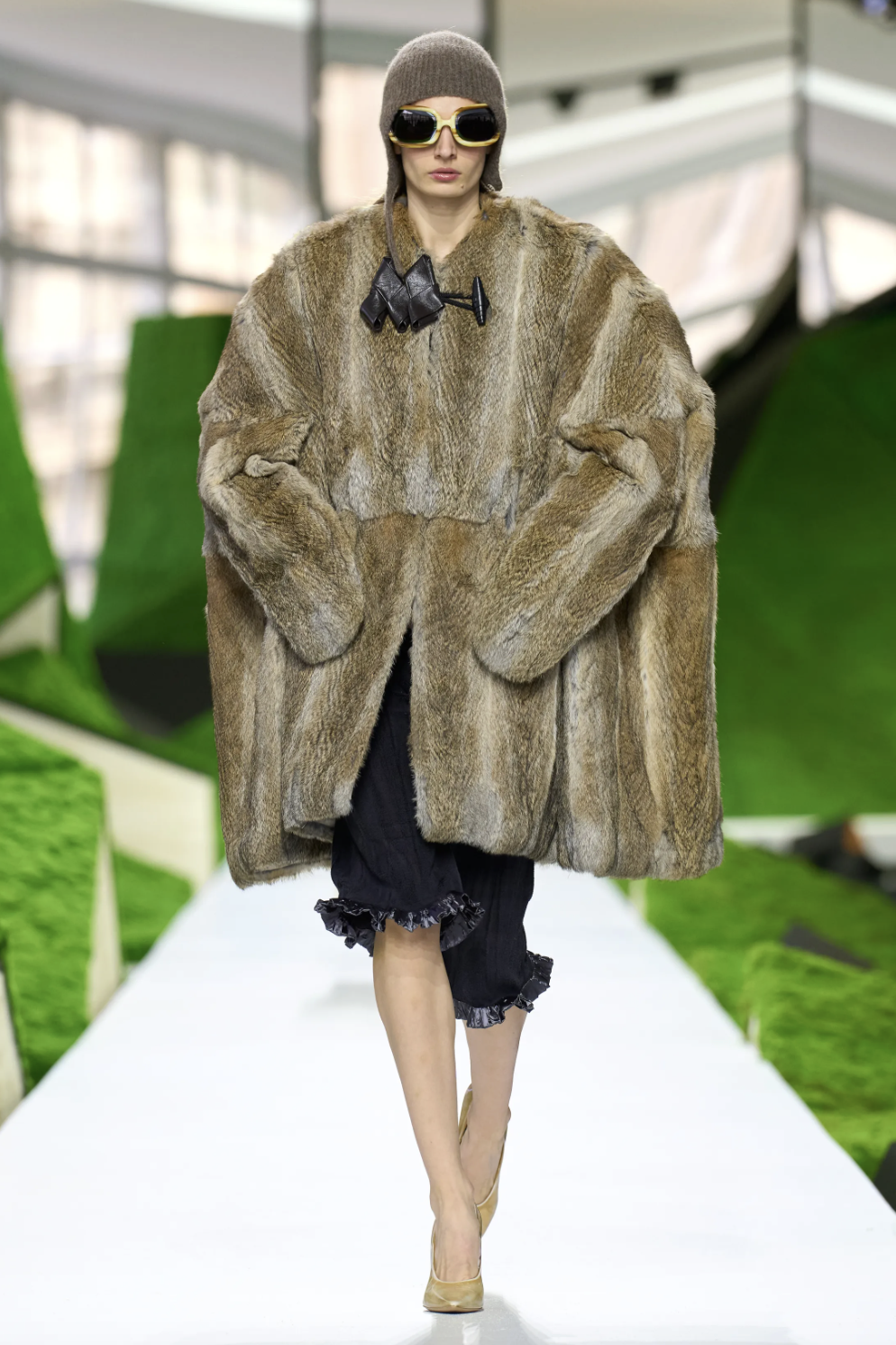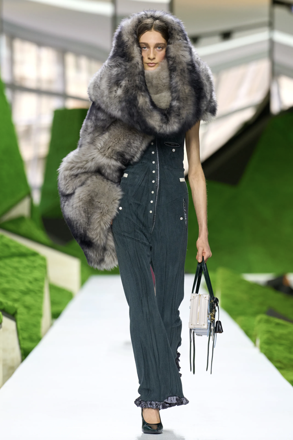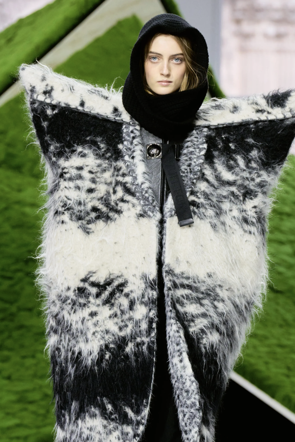 秀场的边界消弭于科幻与自然之间,而真正将观念落地的,则是行走其间的服装廓形。开场的一系列披风式外套定下基调:肩线被刻意强化,轮廓向外扩张,像山、像鸟,也像下坠的云。从oversize皮草外套到拼接皮草袖的斗篷,从球形翻领夹克到层层叠叠的雨衣——这种处理让服装回归到一种原始逻辑:人穿衣服,就是为了在世界上安全地移动。