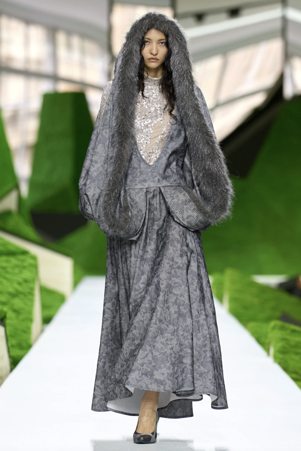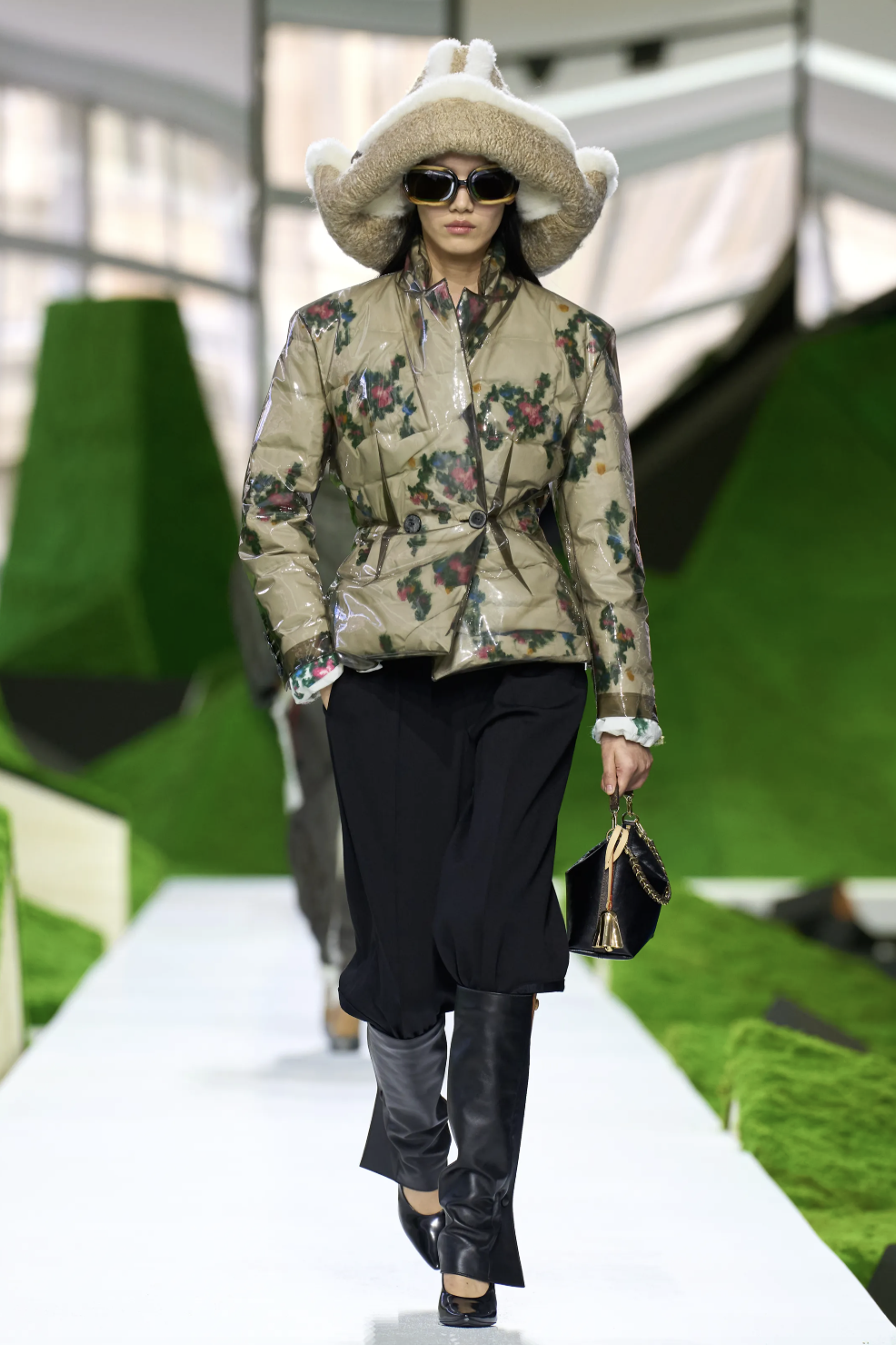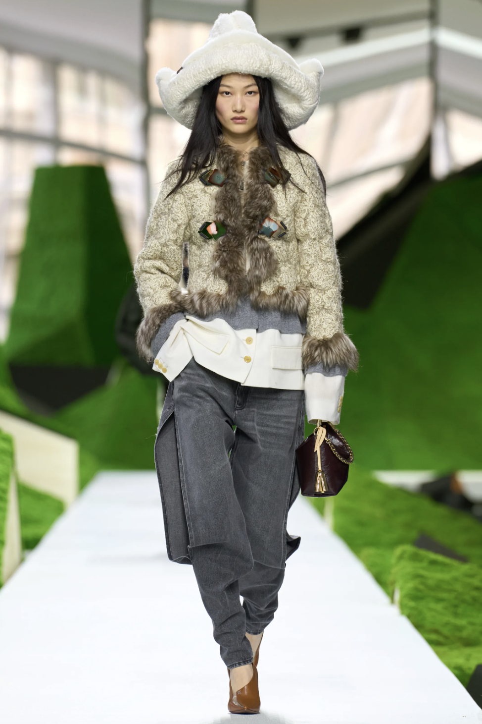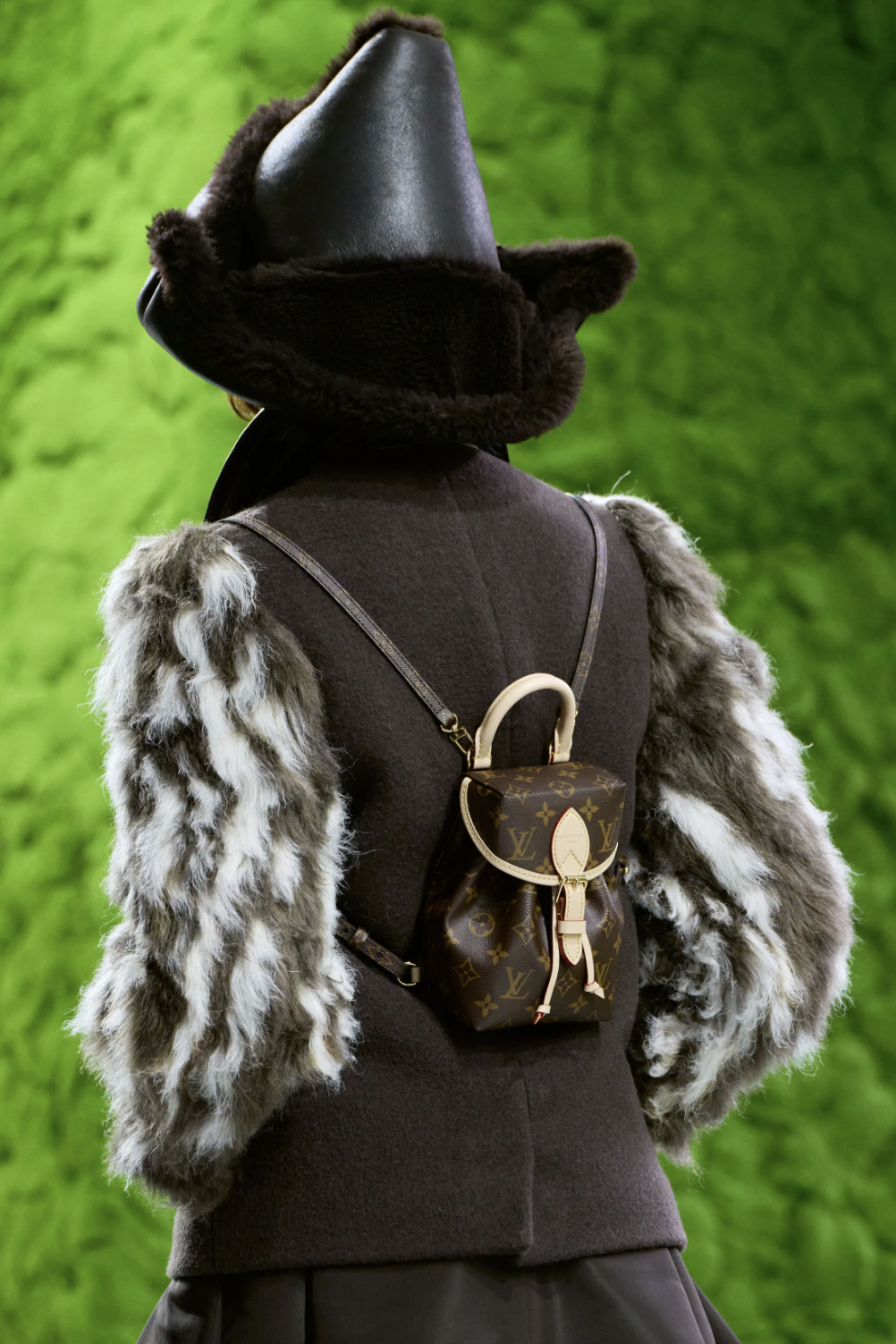 秀场的边界消弭于科幻与自然之间,而真正将观念落地的,则是行走其间的服装廓形。开场的一系列披风式外套定下基调:肩线被刻意强化,轮廓向外扩张,像山、像鸟,也像下坠的云。从oversize皮草外套到拼接皮草袖的斗篷,从球形翻领夹克到层层叠叠的雨衣——这种处理让服装回归到一种原始逻辑:人穿衣服,就是为了在世界上安全地移动。