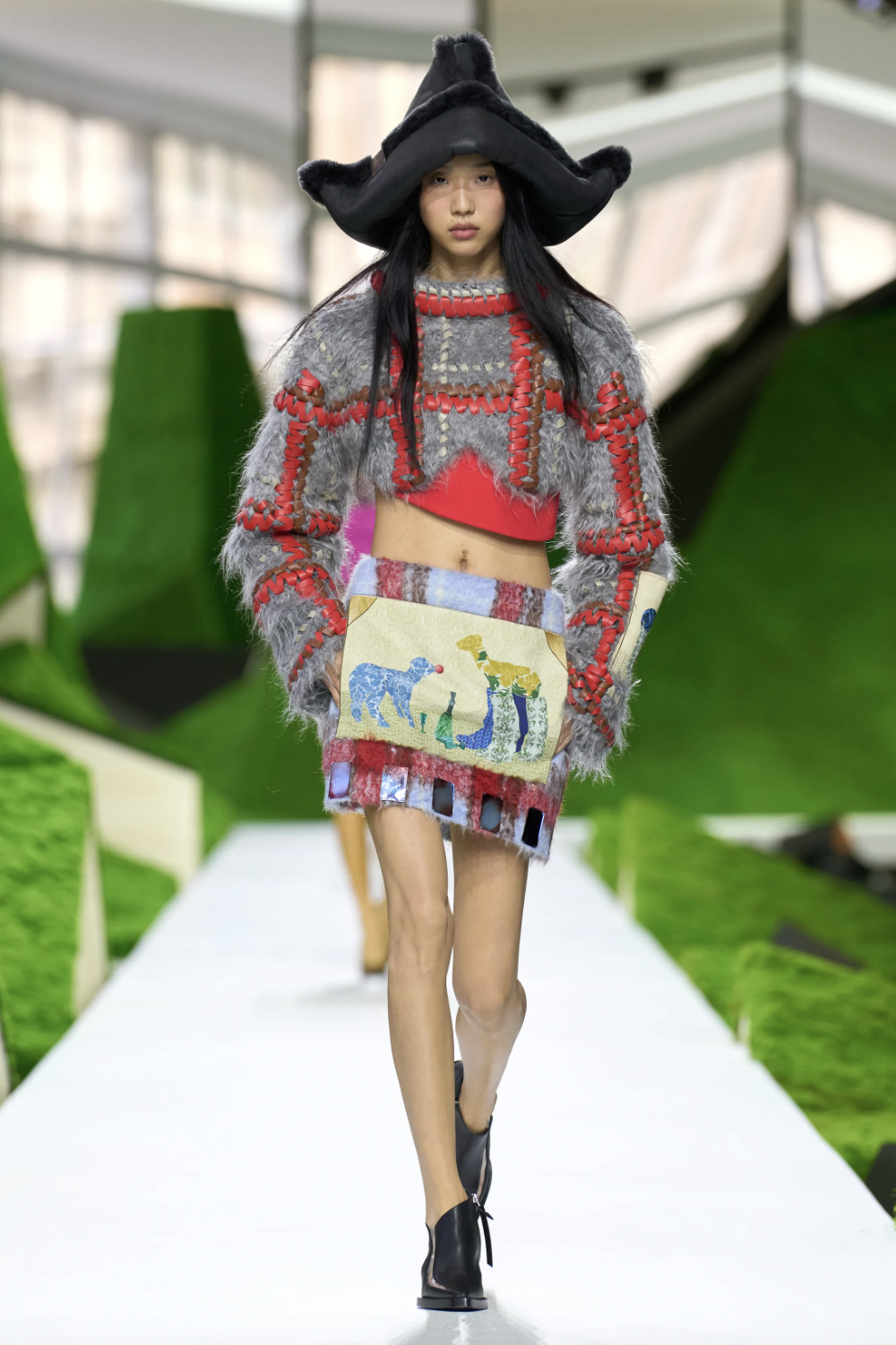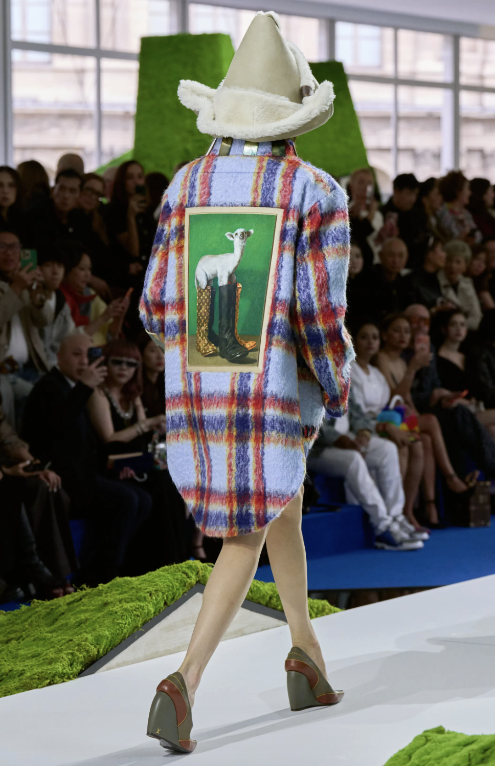 艺术感的细节贯穿始终。本季还合作了乌克兰艺术家Nazar Strelyaev-Nazarko,将他笔下稚拙可爱的绵羊画作跃然衣间。艺术家画中穿着乡村橡胶靴的羔羊,在秀场版本里被悄悄换上了带有LV Monogram的奢华靴履。复古格纹毛呢与高饱和度亮色皮革碰撞交织;领口与半裙上的几何装饰仿佛光染拓印,收录着自然界的奇妙万象。鲜艳明快的色彩冲淡了“游牧”主题可能带来的粗粝与沉重,也让整个系列呈现出一种轻盈而坚定的气质。