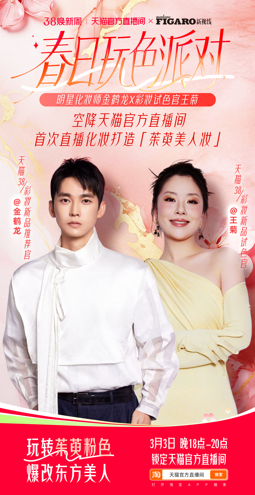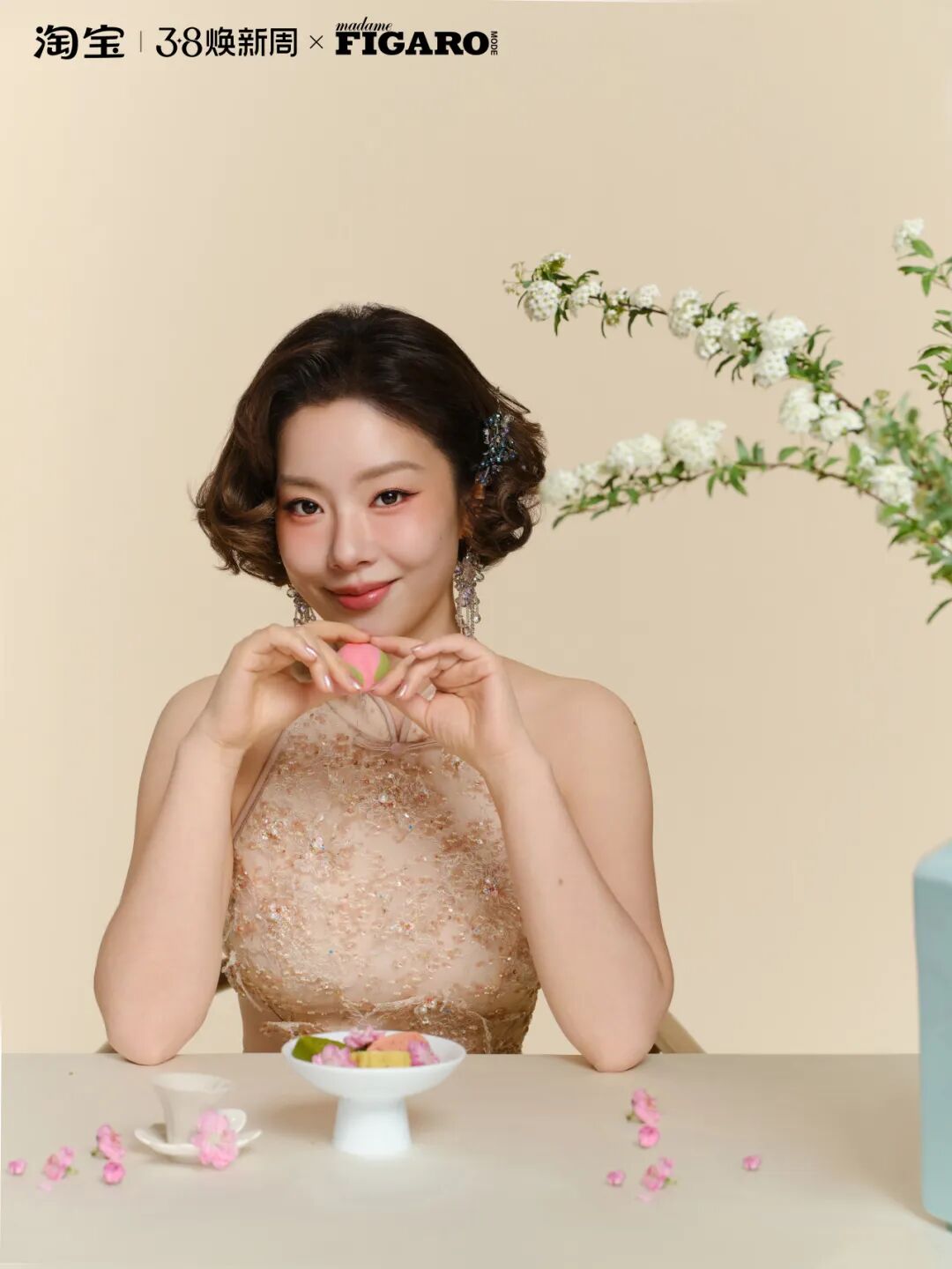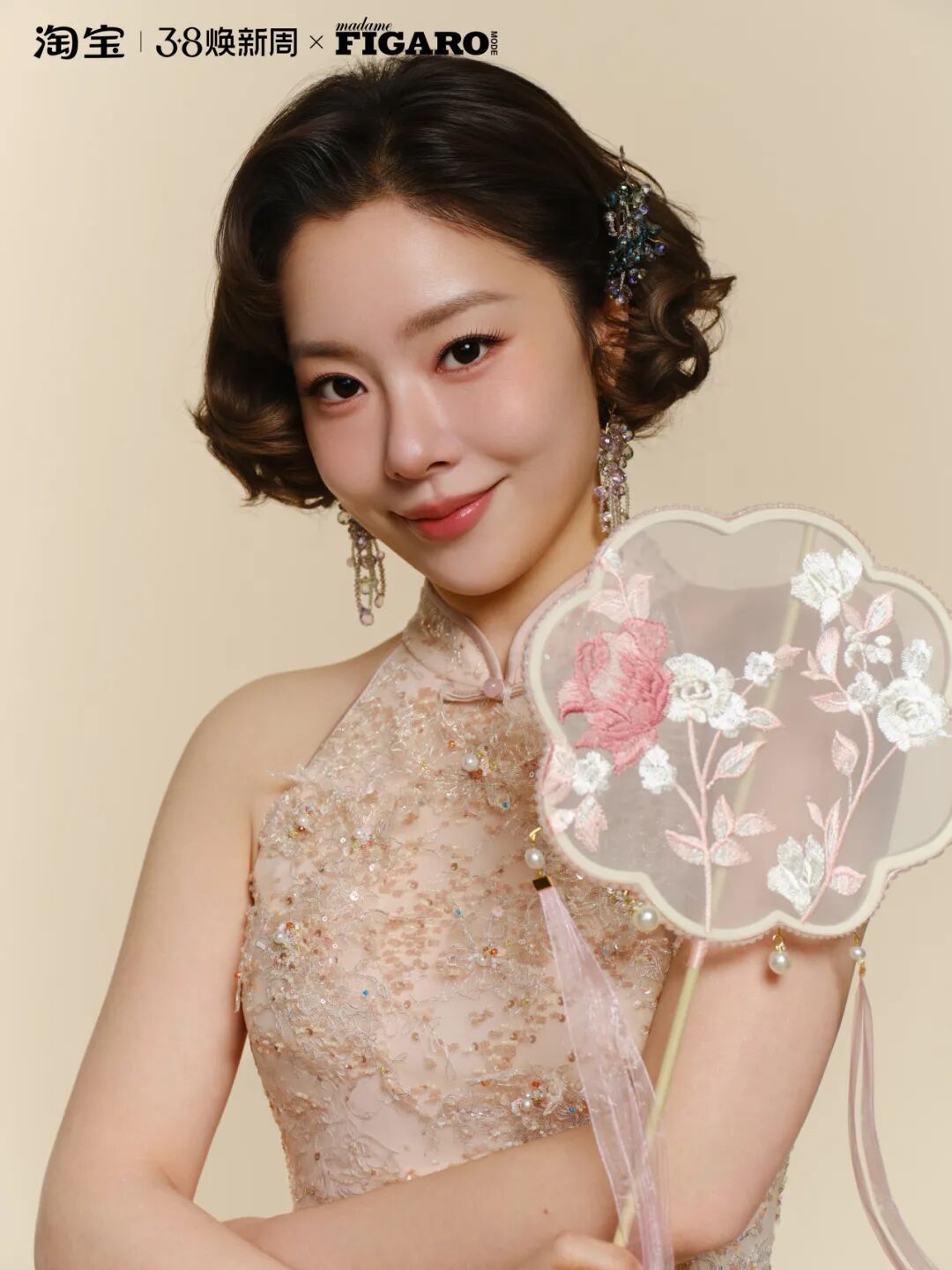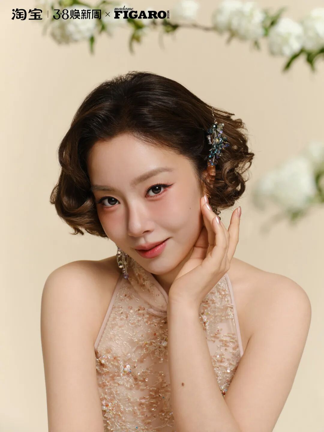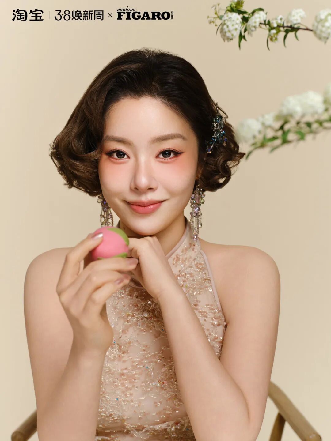妆容完成后,整体呈现出一种淡雅而清透的高级质感,搭配中式复古短发与旗袍,完美展现了王菊身上的典雅气质。这款茱萸美人妆,是东方美学的具像化表达,将春日温柔与东方雅致巧妙合一。